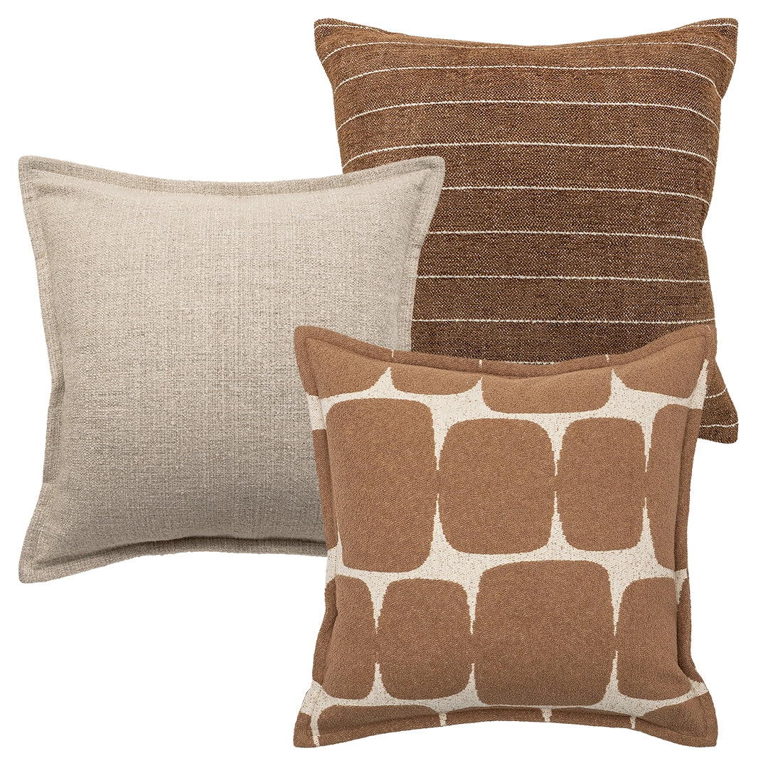 تجمع هذه المجموعة المكونة من ثلاث وسائد بين الوسائد السادة والمخططة والمزخرفة، التي تشكل إضافة مرحة لديكورك. تتناغم الوسائد باللونين العاجي والبني بشكل مثالي مع أي ديكور محايد.