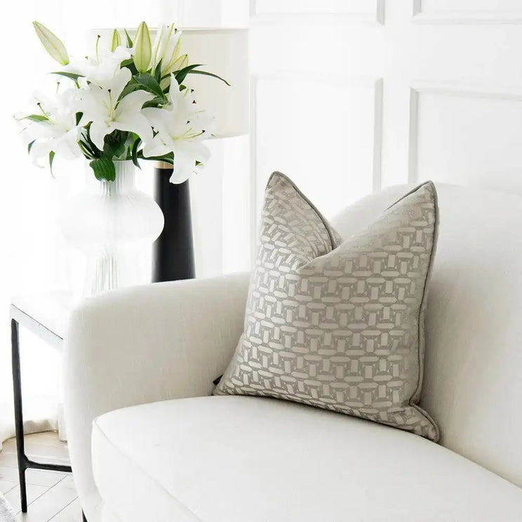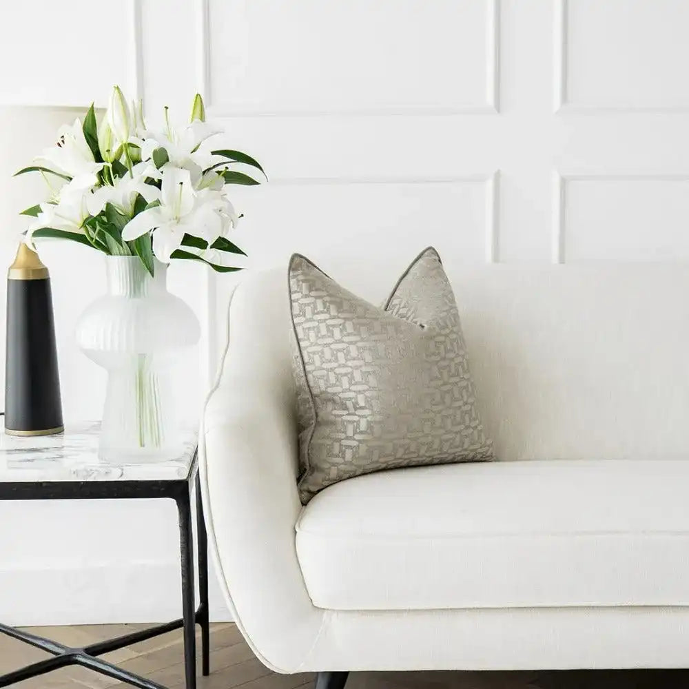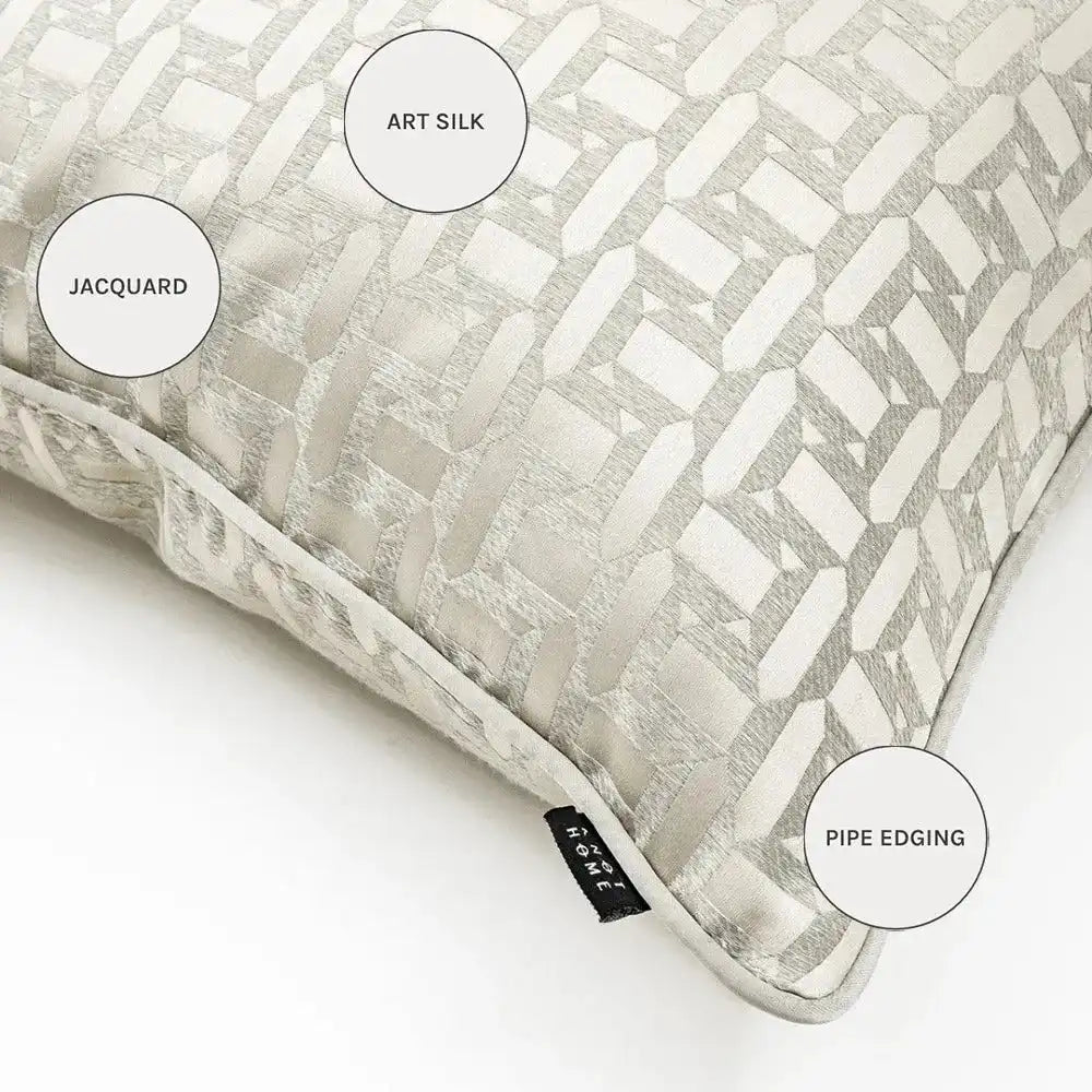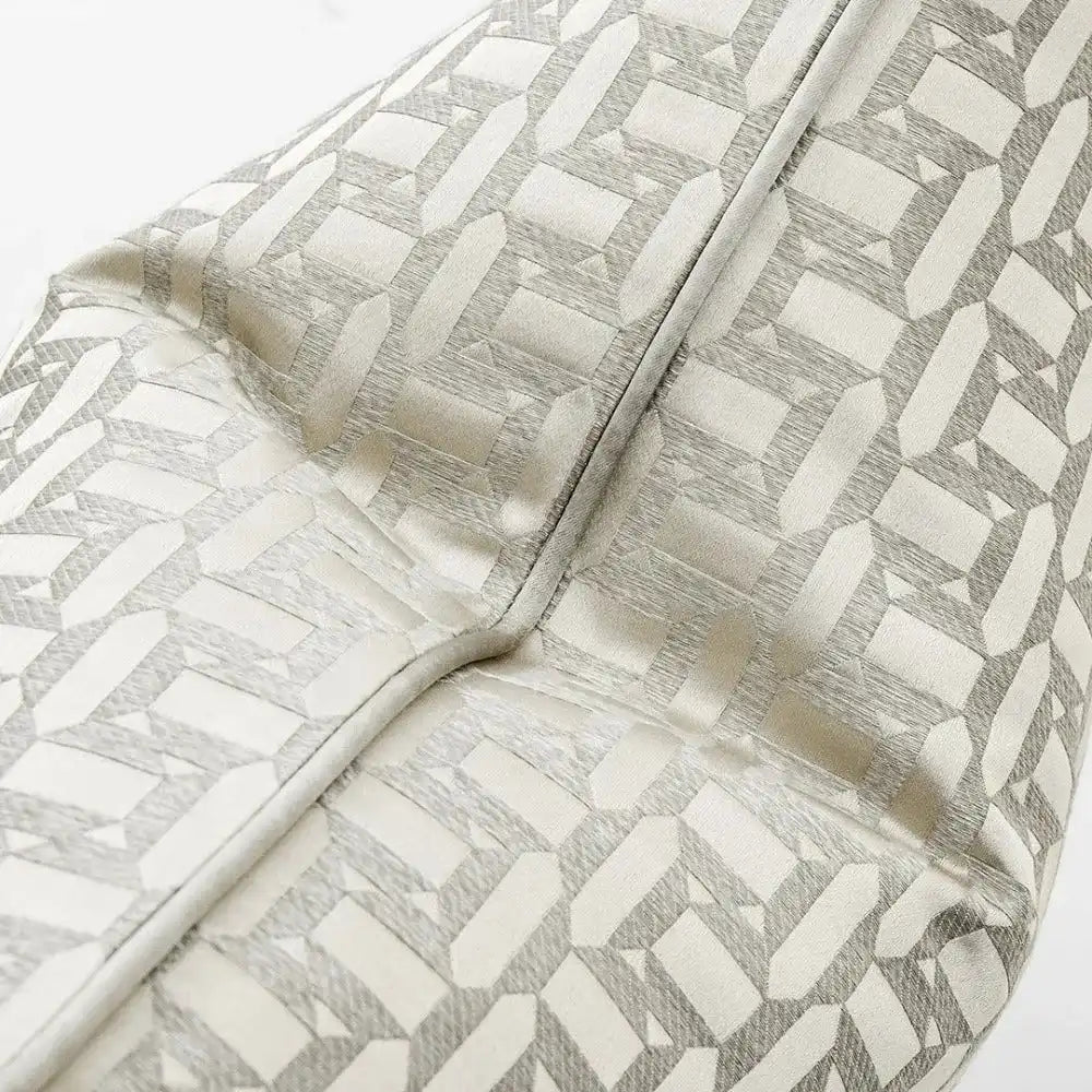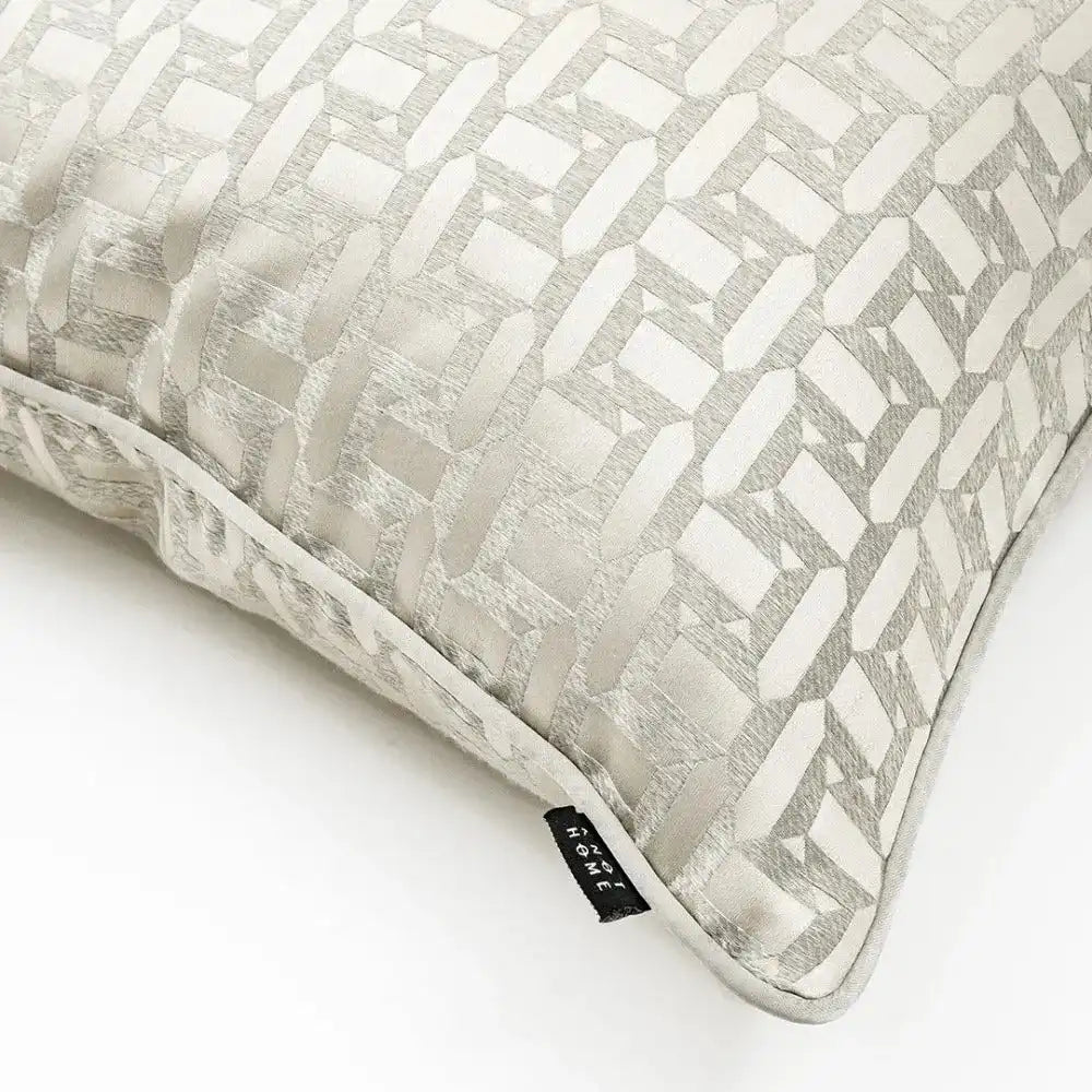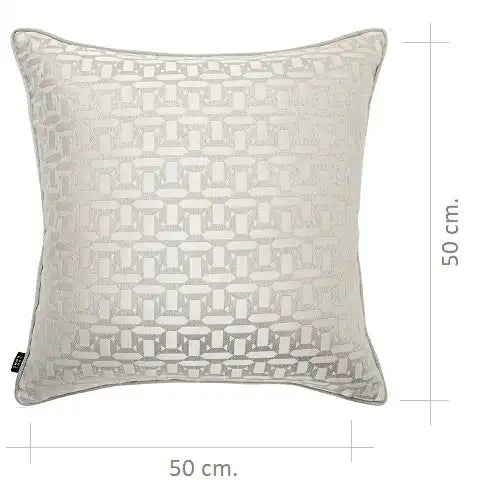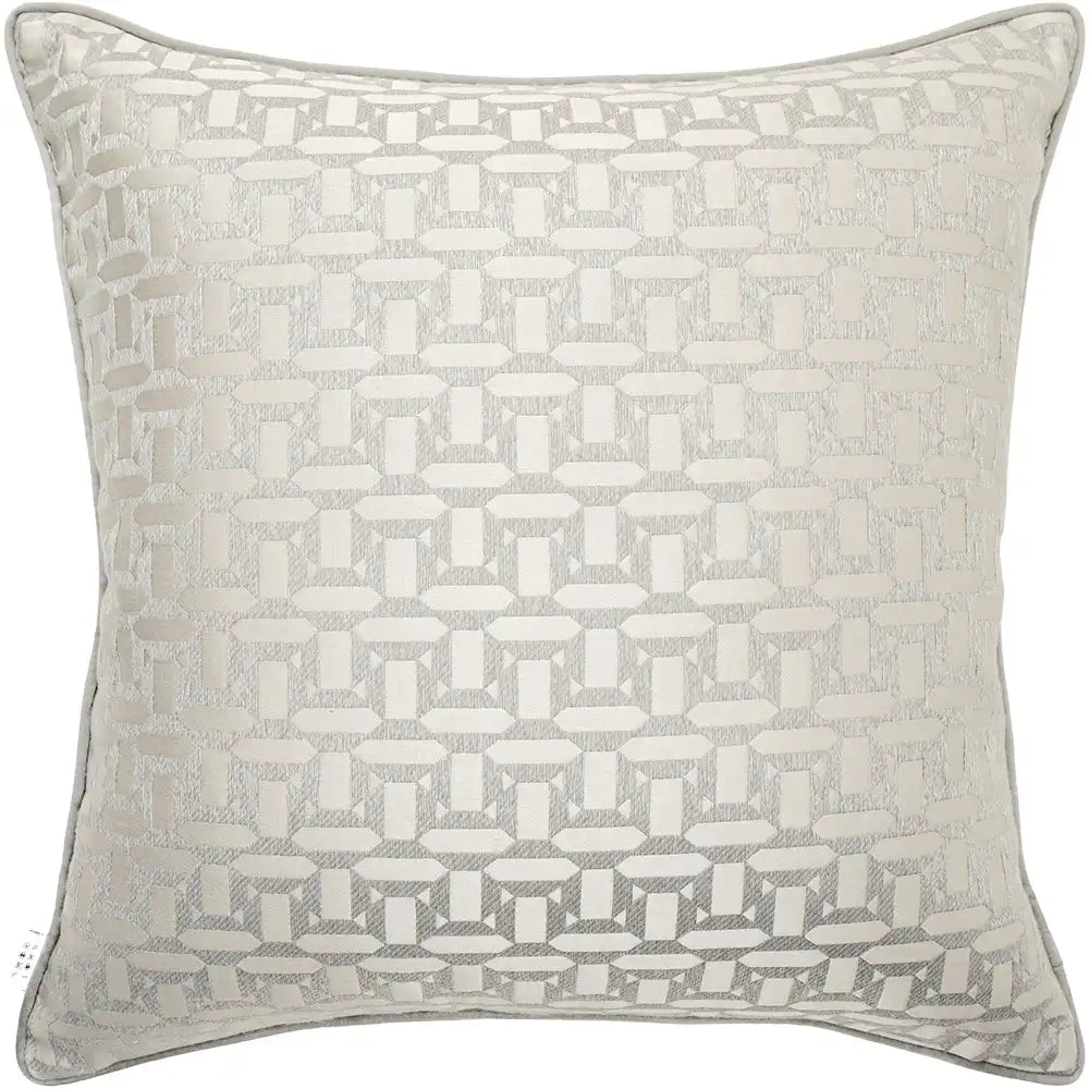 وسادة سيلينا لوران تُجسّد أروع ما في التصميم المعاصر. تأتي هذه الوسادة شبه اللامعة بلون أبيض معدني مع لمسات فضية، وتتميز بنمط هندسي من أشكال سداسية صغيرة مخططة.