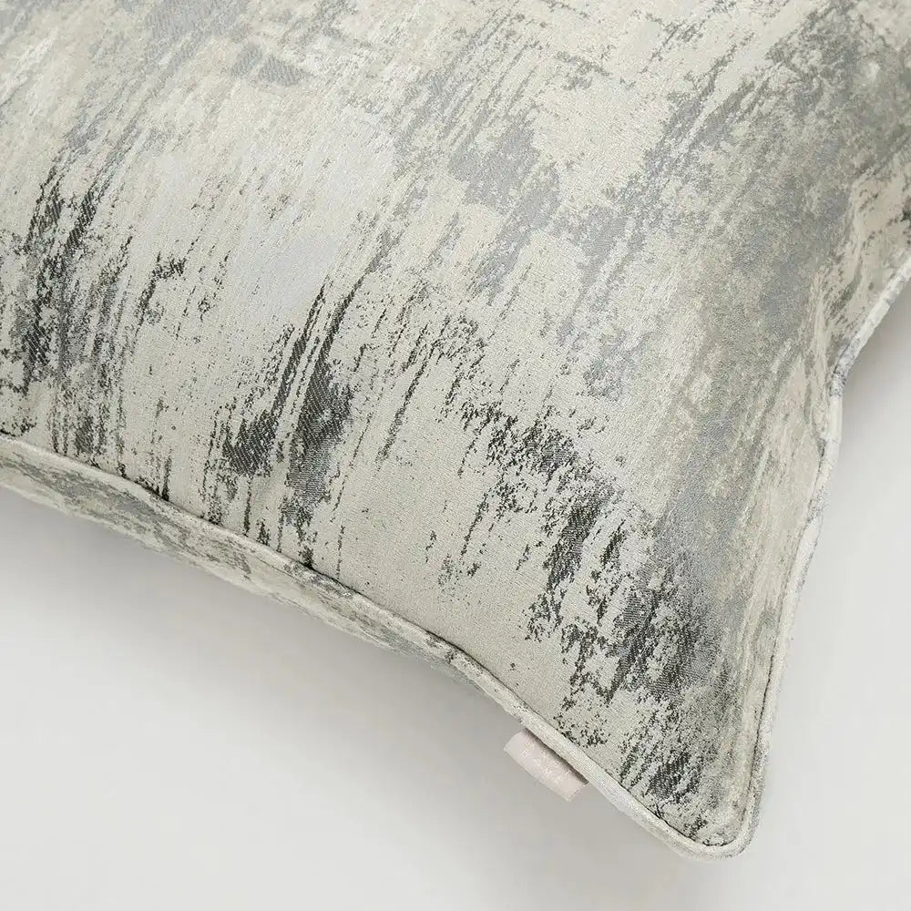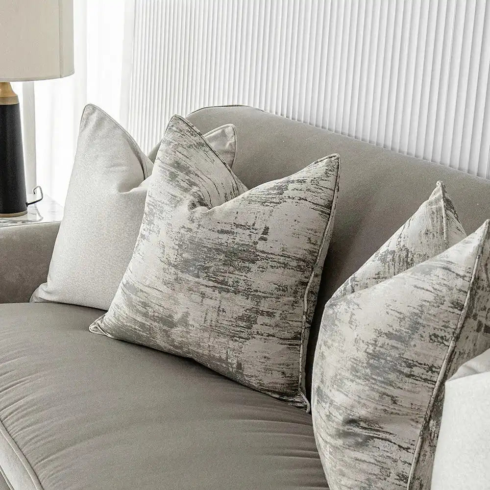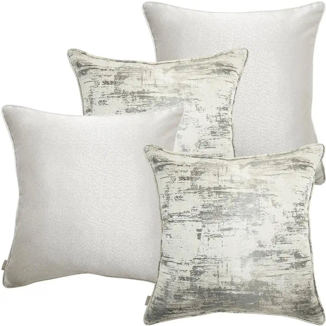 مجموعة تحتوي على وسادتان باللون الفضي اللامع مع وسادتان باللون الرمادي والكريمي بنمط باهت ومميز.