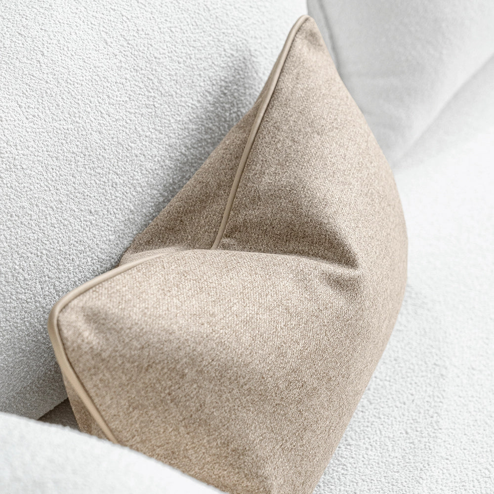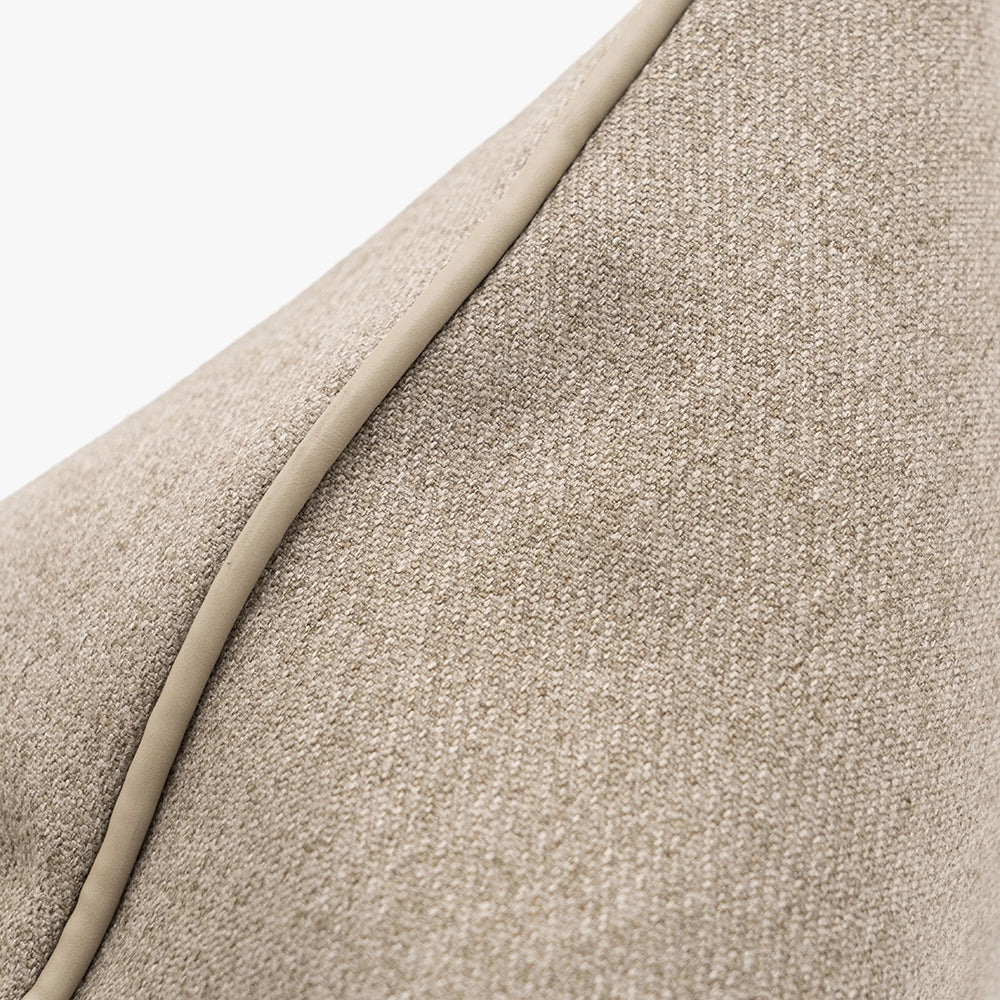 وسادة مصنوعة من مزيج فاخر من صوف ميرينو فائق النعومة والألياف الطبيعية، بملمس ناعم ومزيج ألوان عميقة وراقية. تضيف الحواف الجلدية لمسة من الأناقة الحرفية الخالدة، لتكمل أي ديكور بفخامة رصينة.