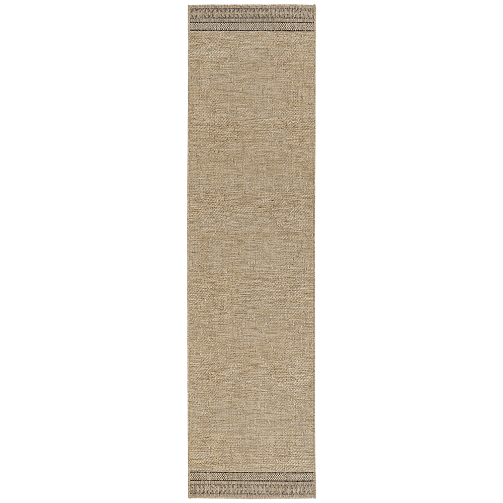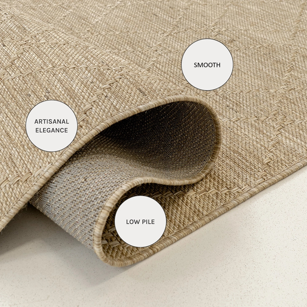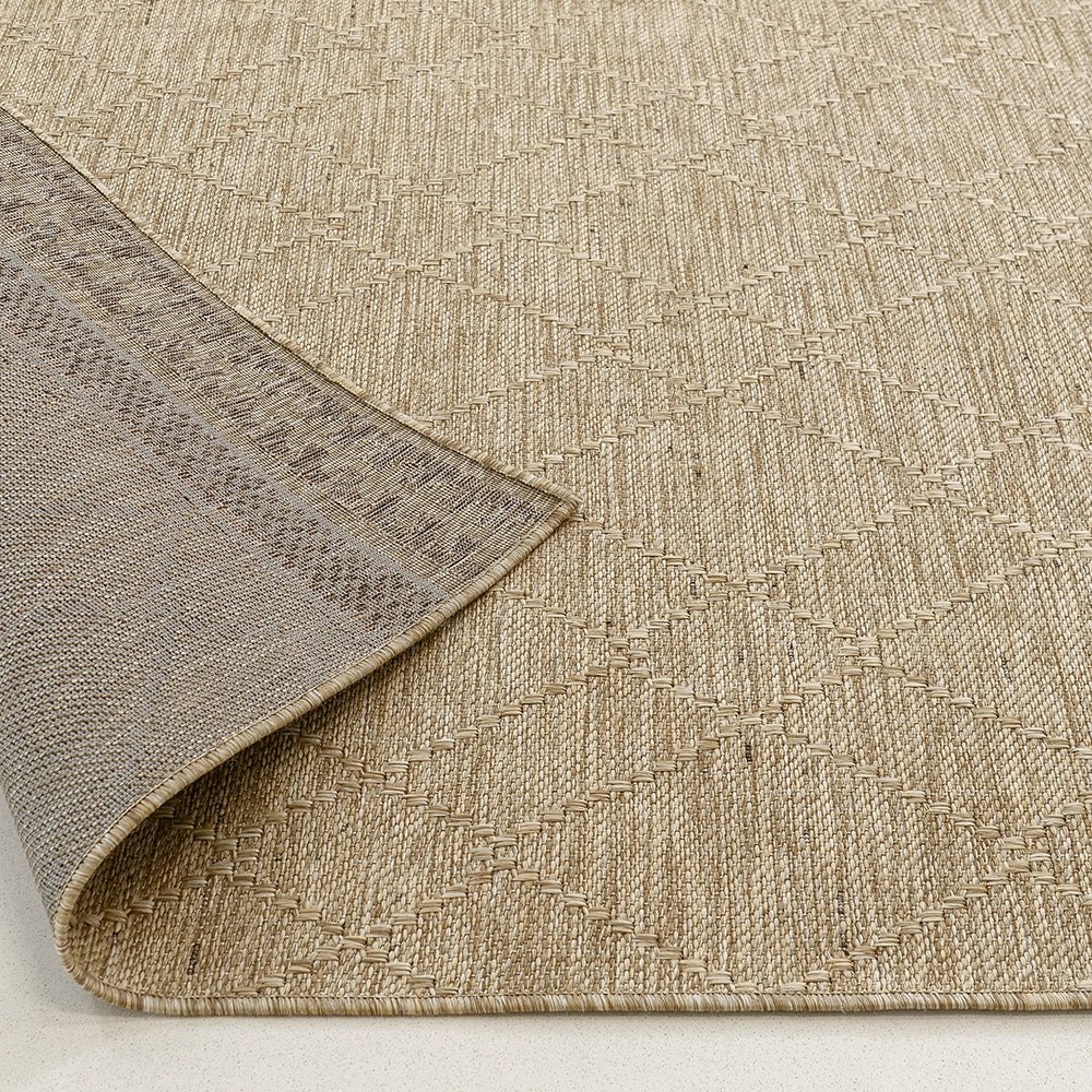 سجادة للاستخدام الداخلي والخارجي باللون البني الجملي الطبيعي، مزينة بنمط ماسي دقيق محاط بإطارات باللون البني الداكن تميل إلى الأسود. يجمع التصميم بين الدفء الترابي والمتانة العملية.