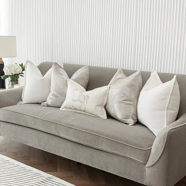 التصميم: وسادتان باللون الأبيض من نسيج الجاكارد، ووسادتان منقوشتان باللون الرمادي ووسادة من الجلد صناعي مع تطريز حصان