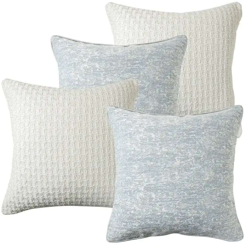 التصميم: وسادتان من نسيج الجاكارد باللون الأبيض ووسادتان باللون الأزرق الفاتح مع حواف فضية