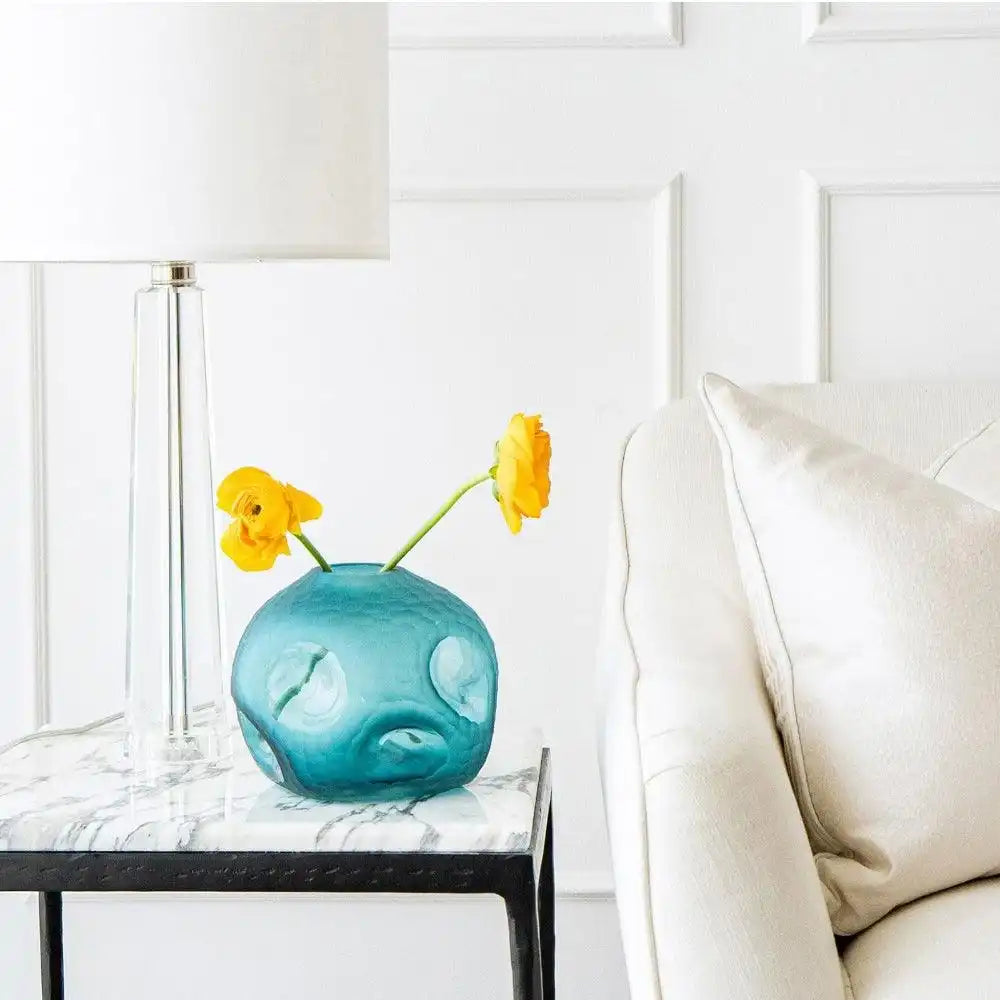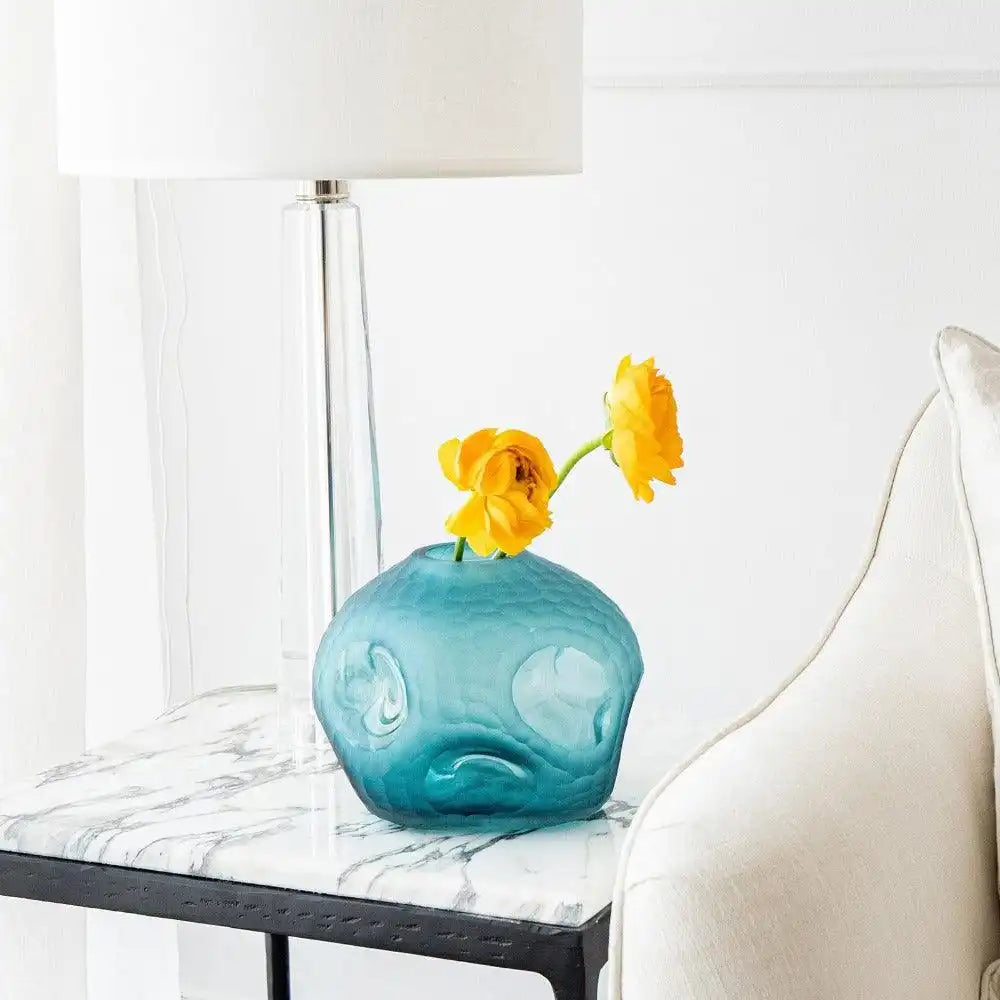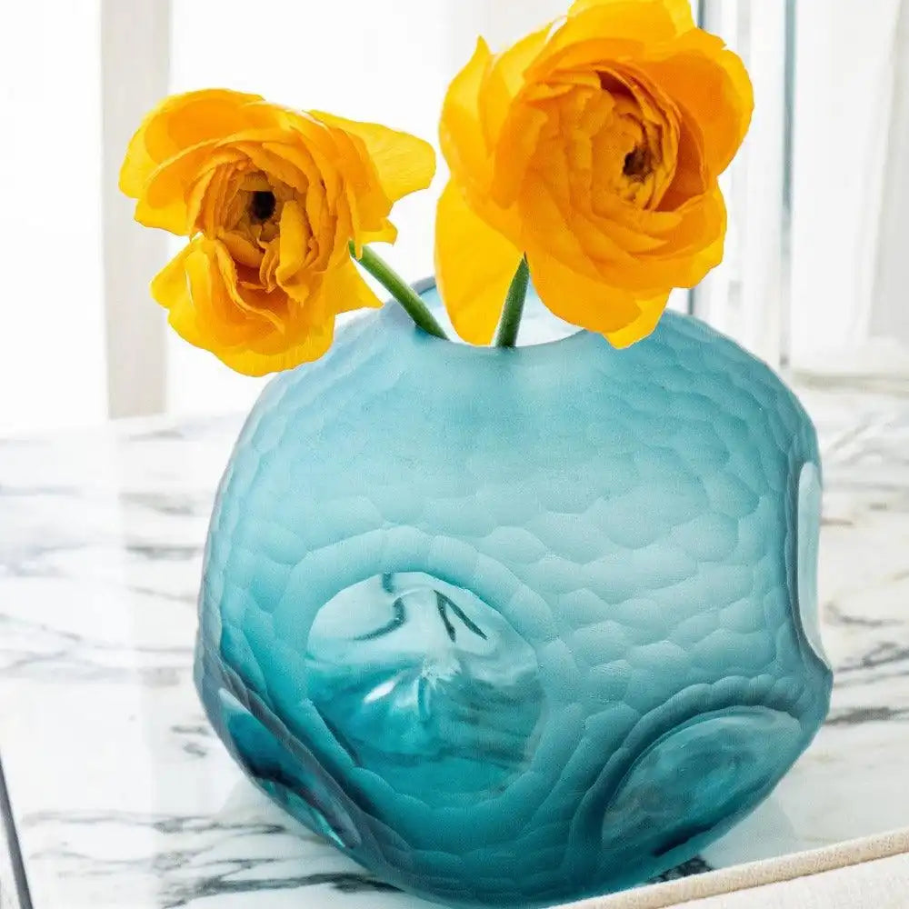مزهرية زجاجية مزخرفة باللون الفيروزي تضيف الأناقة إلى ديكور منزلك وهي مثالية لحمل باقة الورد الصغيرة.