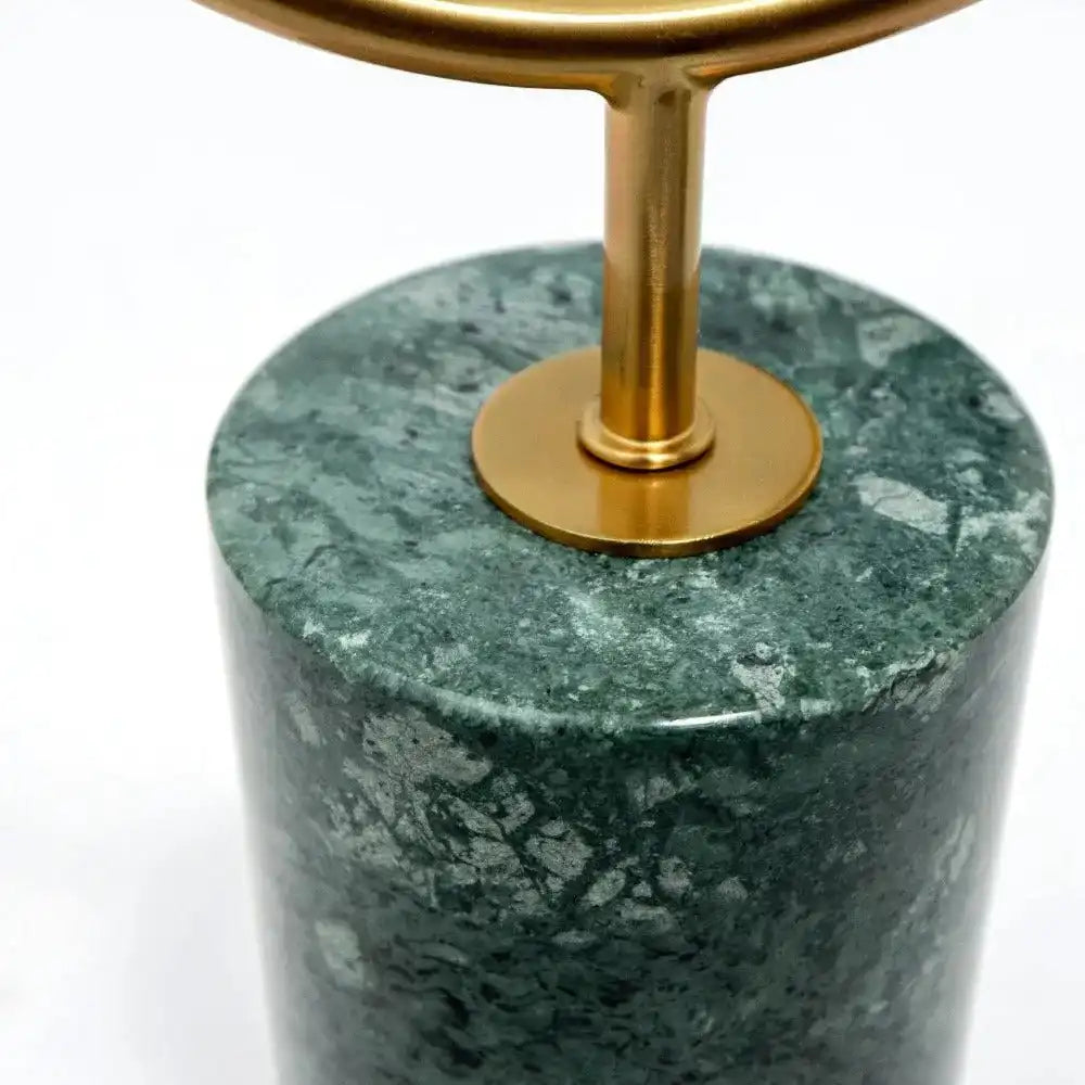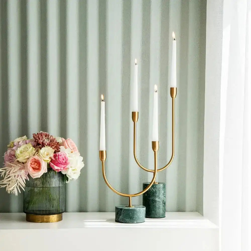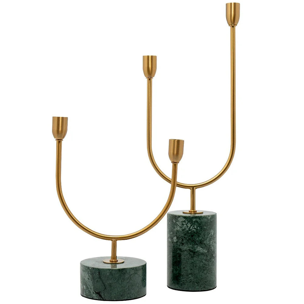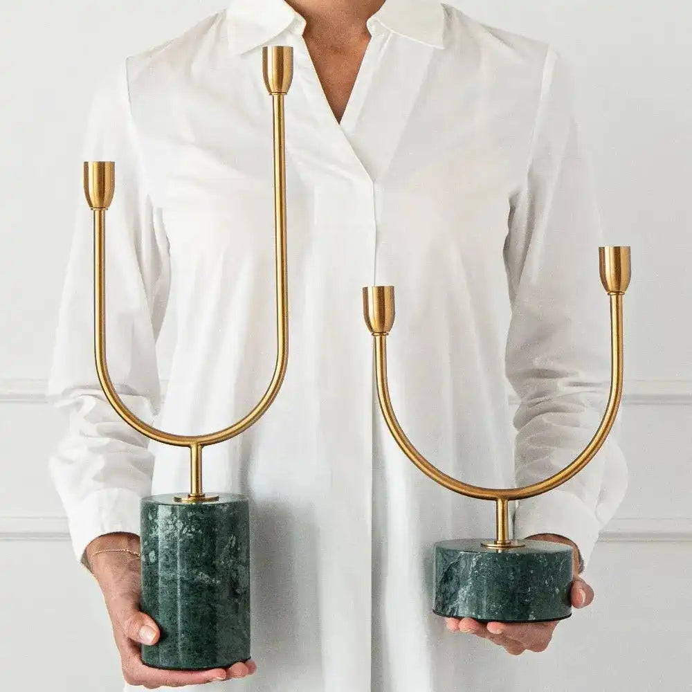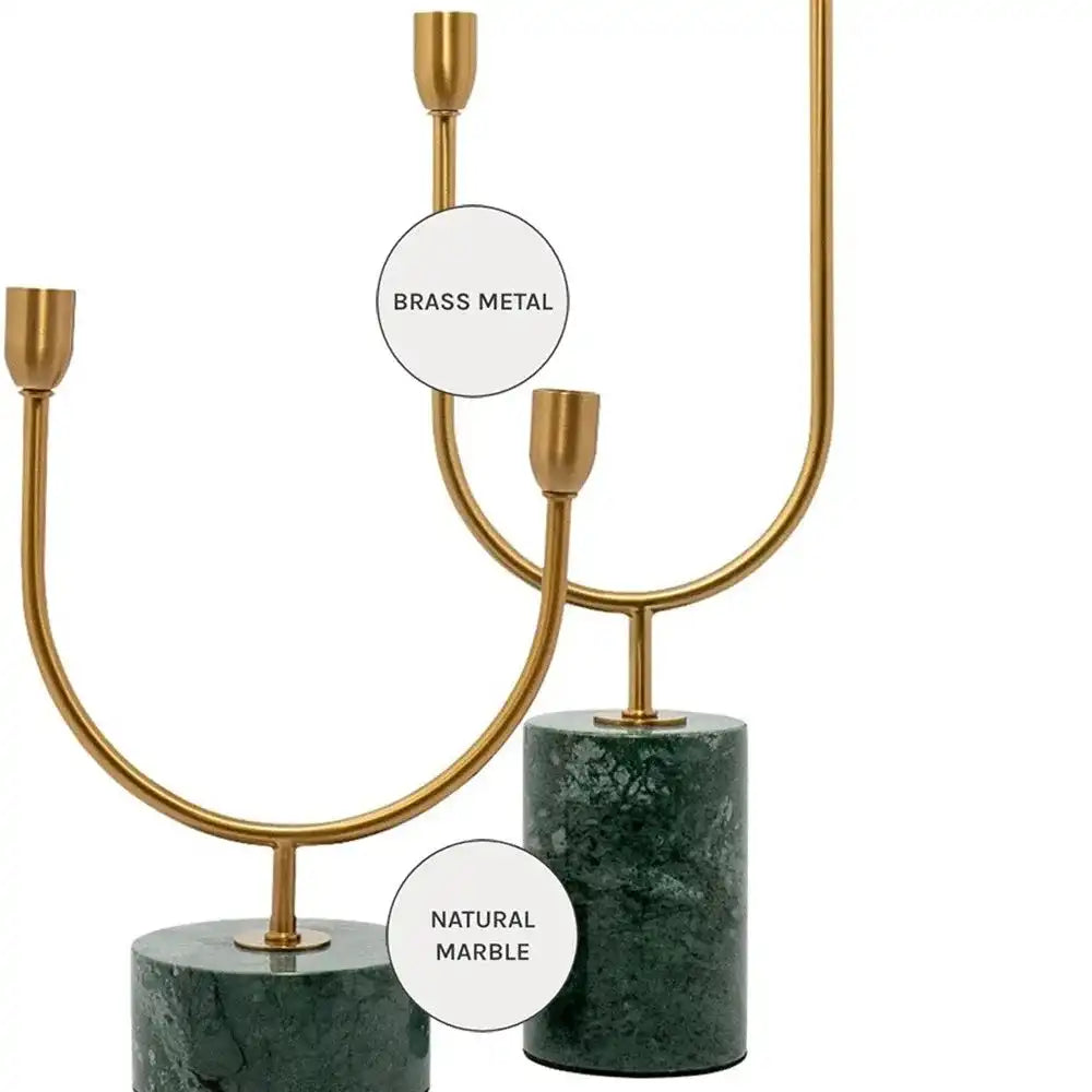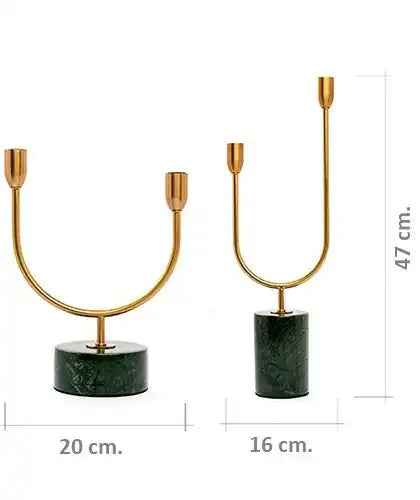 حاملي شموع على شكل حرف U على قاعدة رخامية تأتي باللون الأخضر والنحاس ليمنح لمسة مميزة في ديكور منزلك سواء كان منزلك بتصميم كلاسيكي أو عصري.