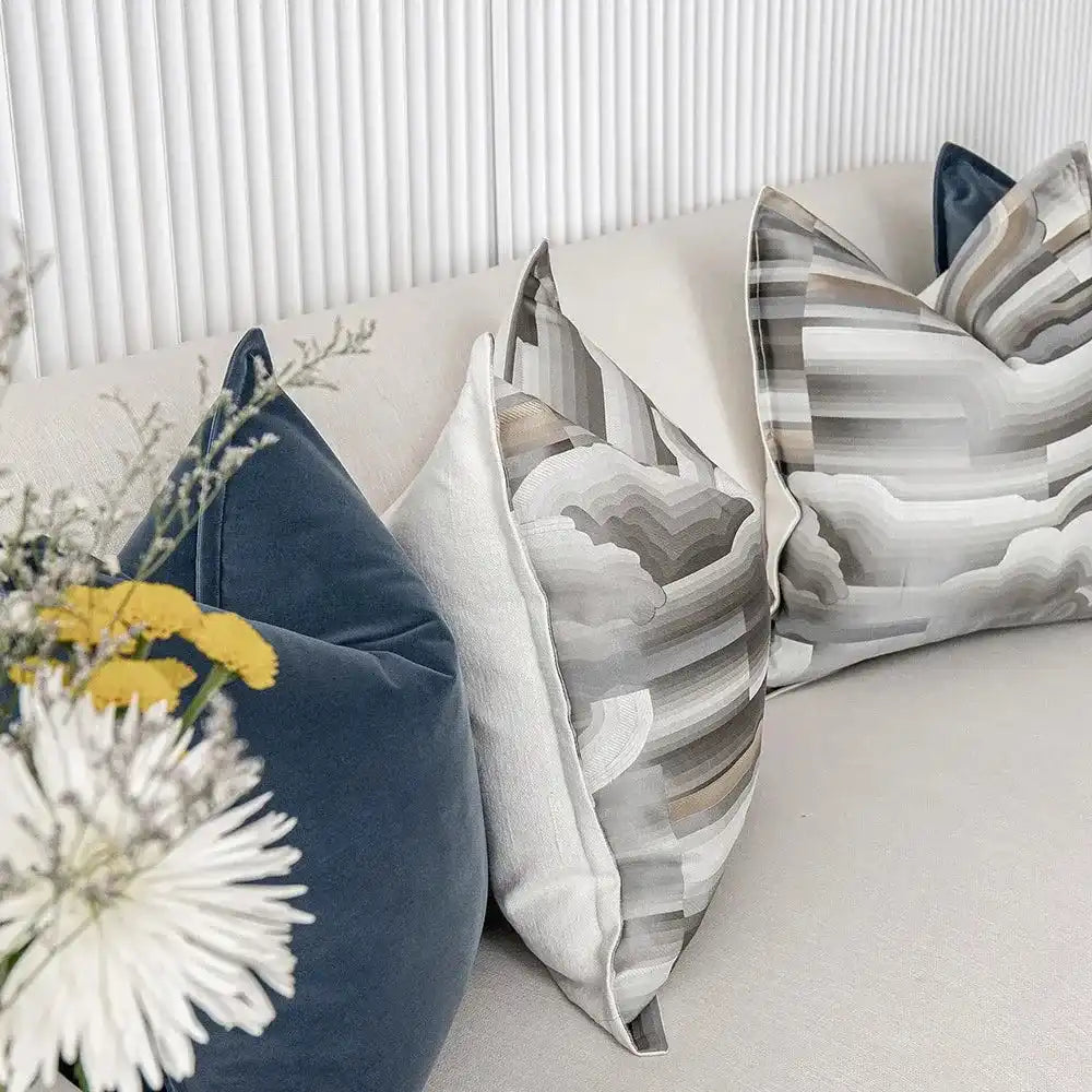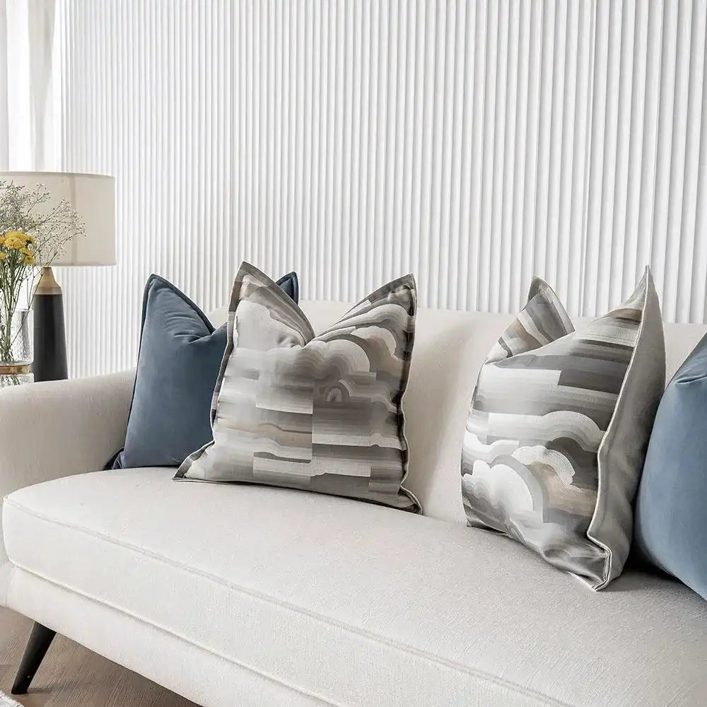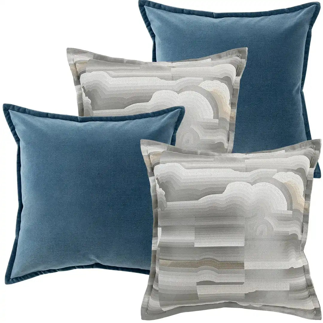 مجموعة تحتوي على وسادتان من المخمل باللون الأزرق مع وسادتان بنمط السحاب المميز باللون الرمادي والأبيض والذهبي بظهر أبيض سادة.