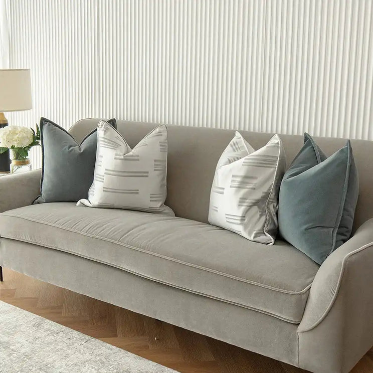 التصميم: وسادتان بحافة بلون أزرق فاتح من المخمل، ووسادتان بنمط خطوط لامعة