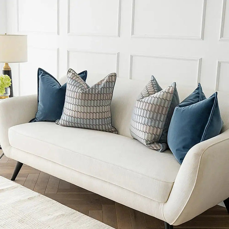 مجموعة تخطف الأنظار ستعجب الجميع. تتضمن وسادتان بتصميم عصري ونمط ثلاثي الأبعاد ووسادتان من المخمل باللون الأزرق.