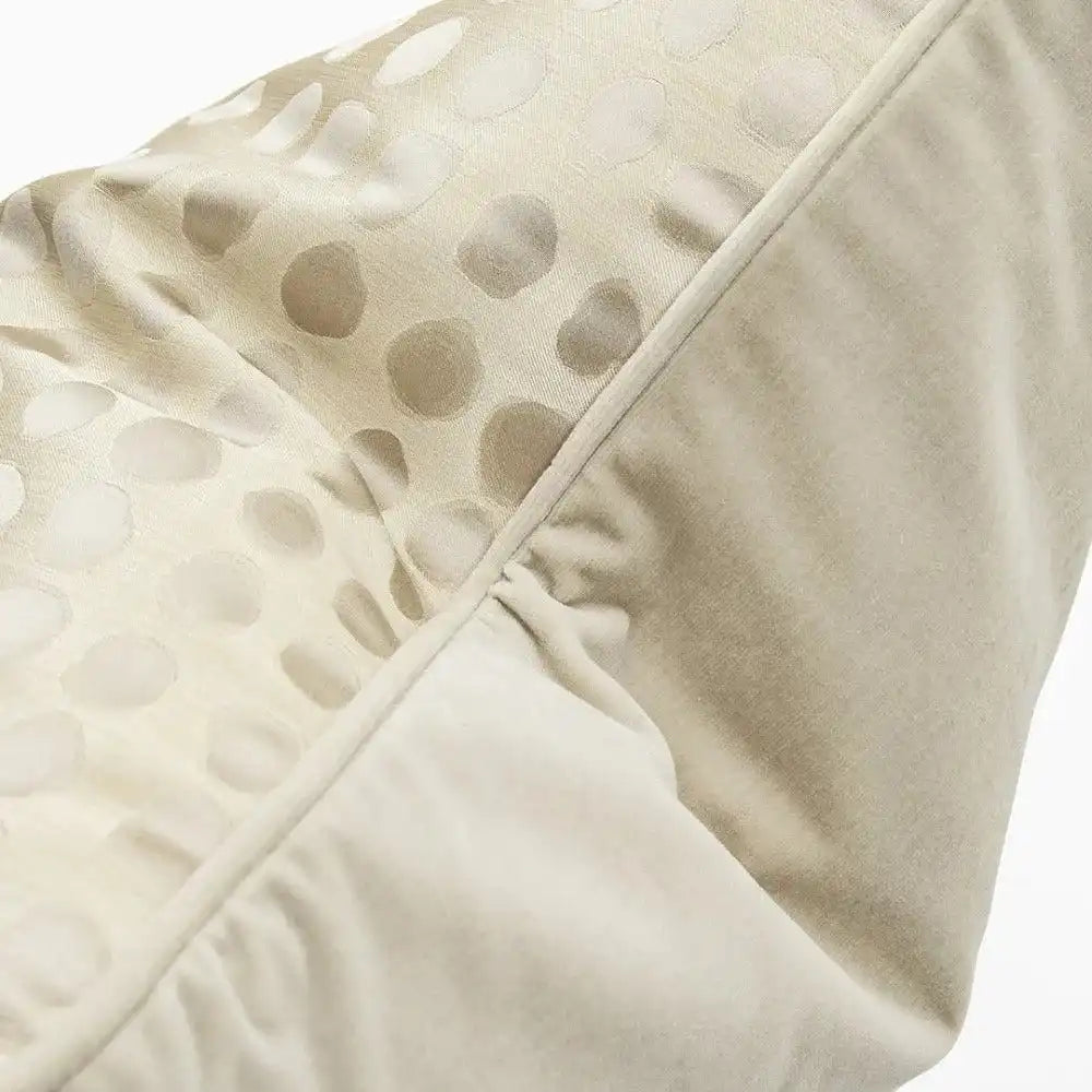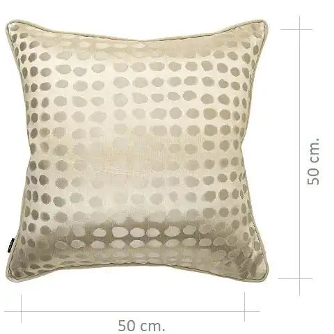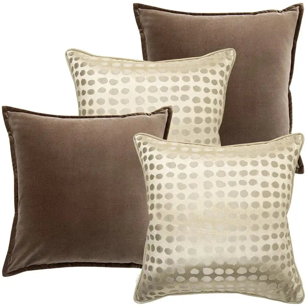 مجموعة فلورا تأتي بوسادتان من المخمل باللون البني ووسادتان باللون الذهبي اللامع مع نمط نقاط مميزة وحرير صناعي من الأمام ومخمل من الخلف.