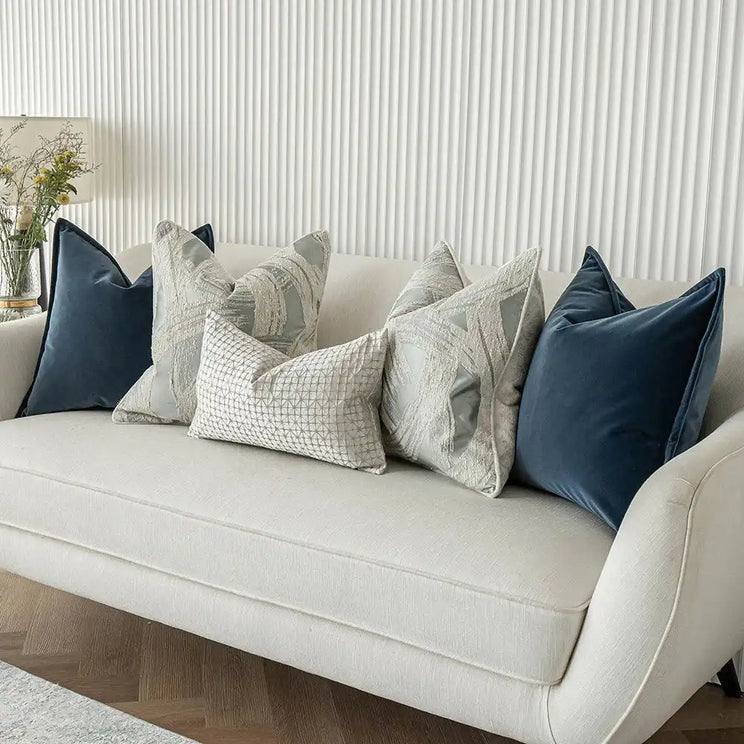 التصميم: وسادتين من المخمل باللون الأزرق، ووسادتين بنمط مميز باللون الأزرق الفاتح ووسادة بنمط الماس باللون الفضي