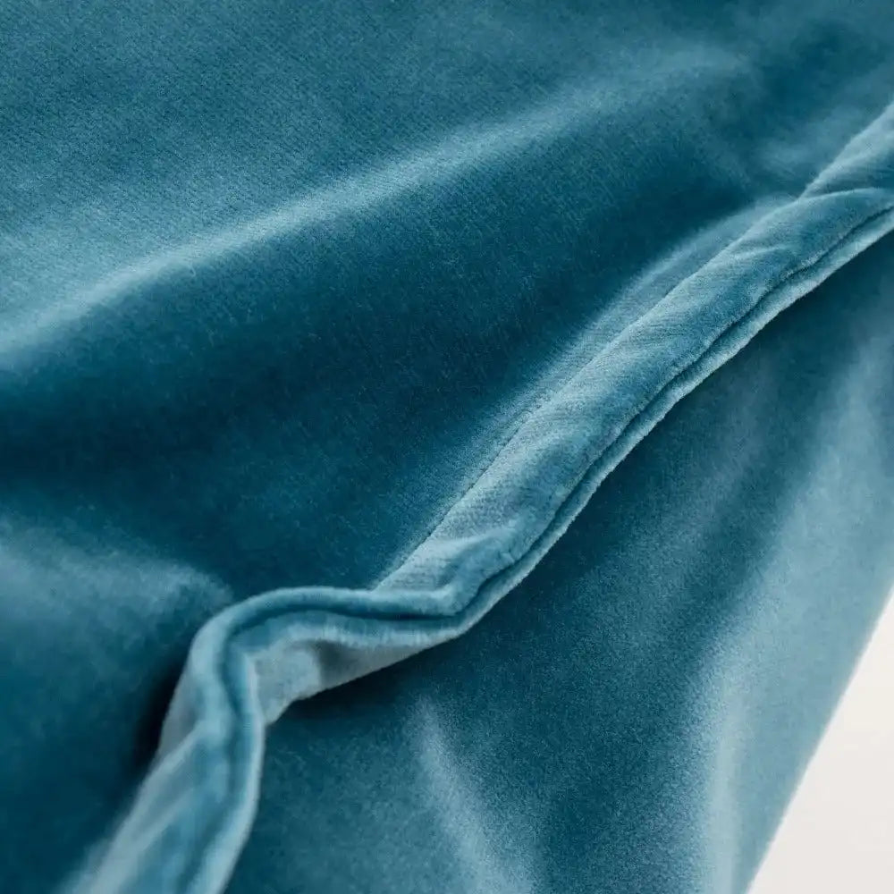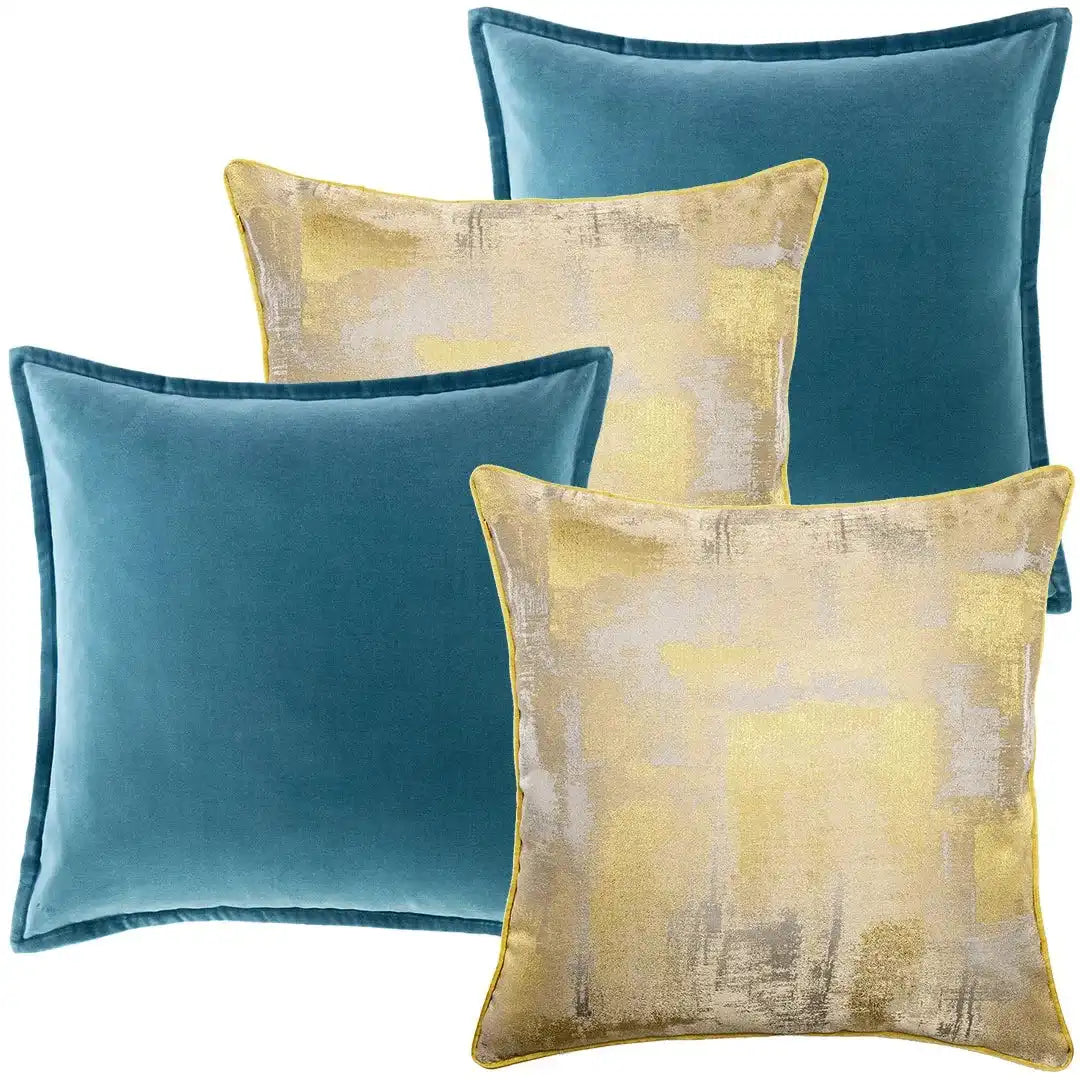 مجموعة تأتي بوسادتان مخمليتان باللون الأزرق الفاتح ووسادتان بنمط مميز باللونين الأصفر والرمادي.