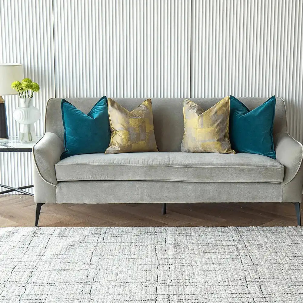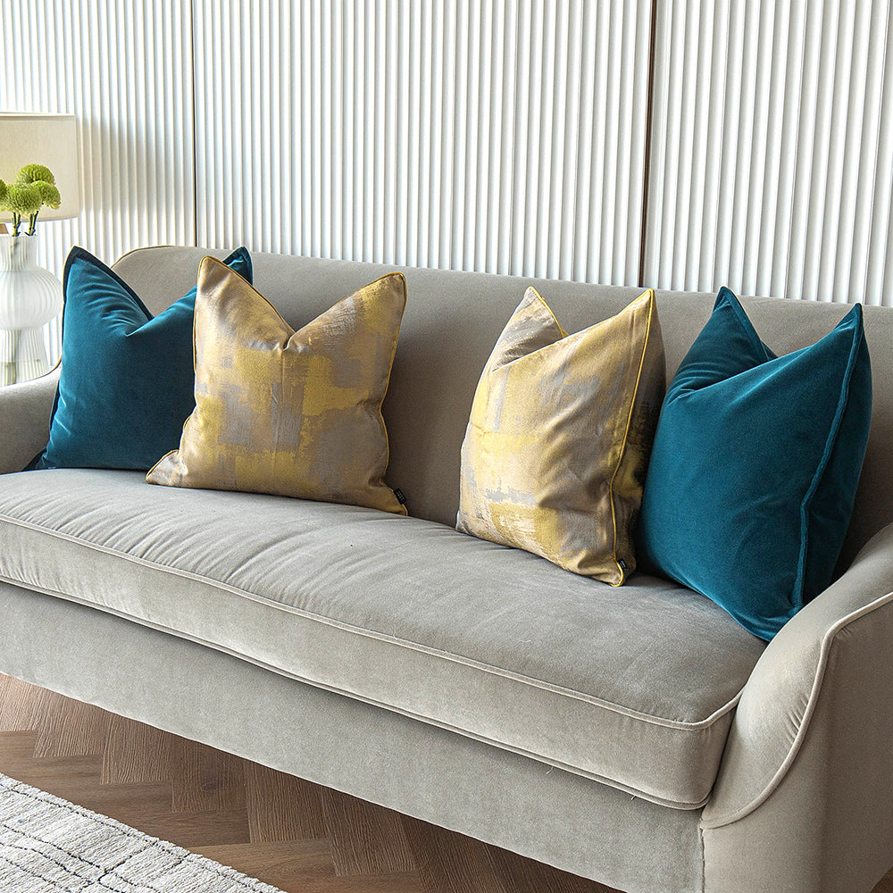 التصميم: وسادتان مخمليتان باللون الأزرق الفاتح ووسادتان بنمط مميز باللونين الأصفر والرمادي