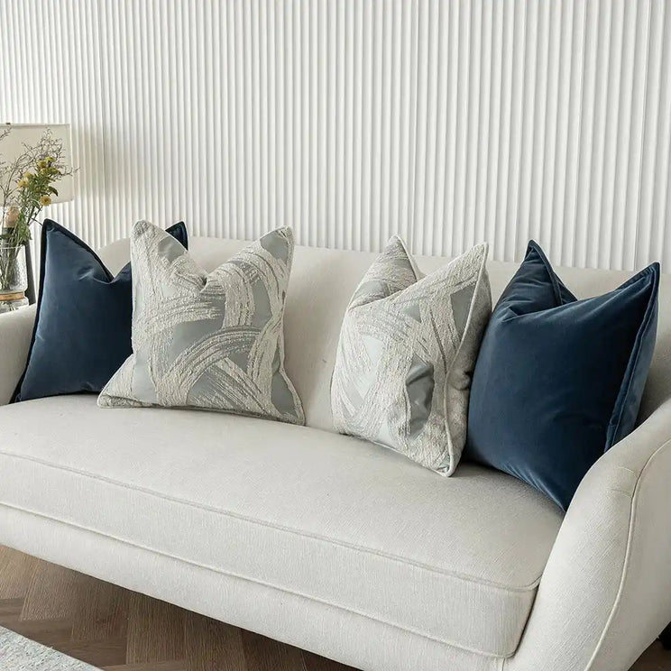 مجموعة تتضمن وسادتان من المخمل باللون الأزرق الغامق ووسادتان باللون الأزرق الفاتح بتفاصيل مميزة وظهر باللون الأبيض السادة.