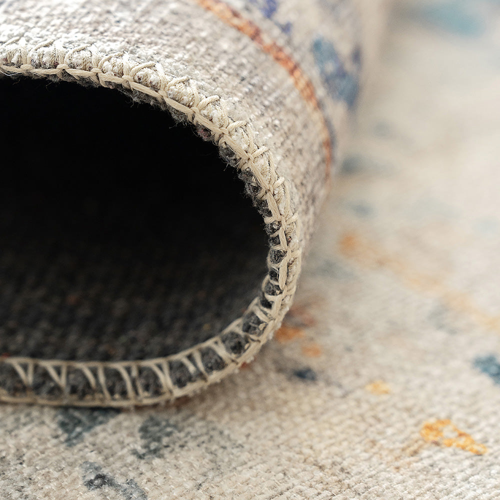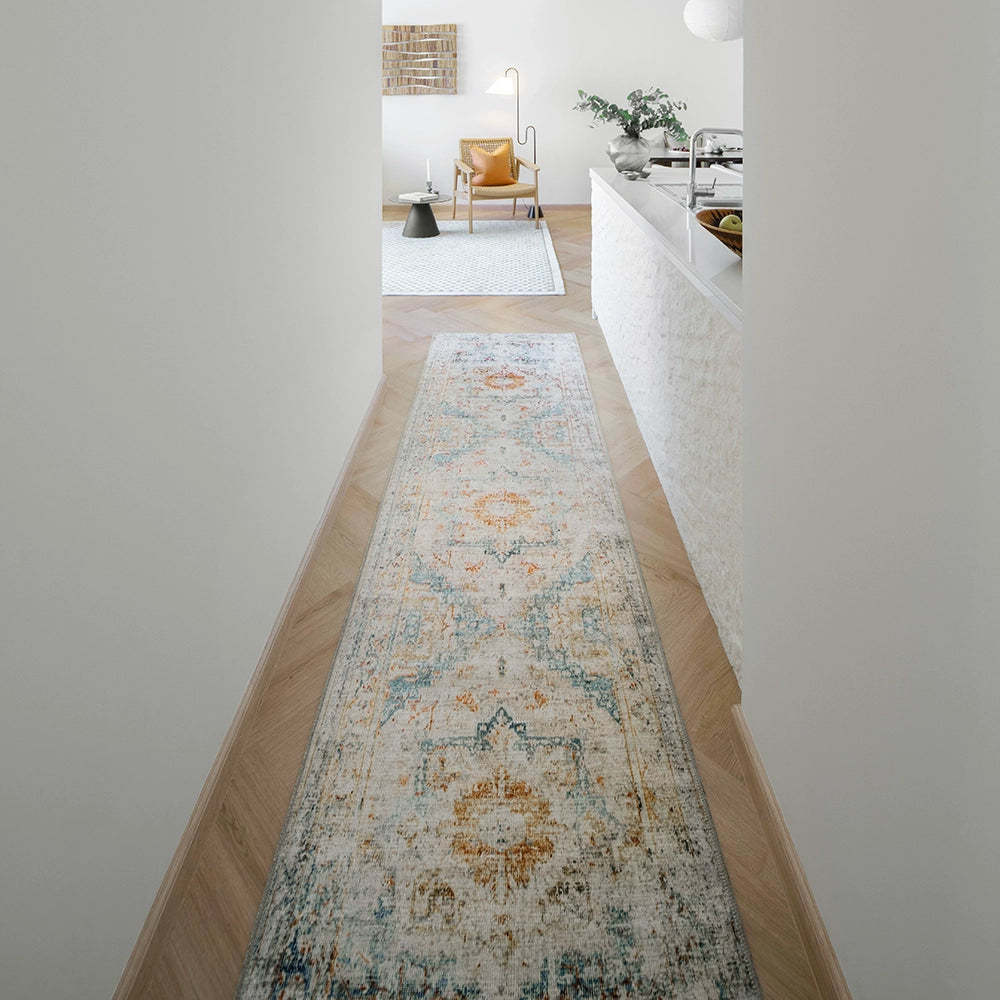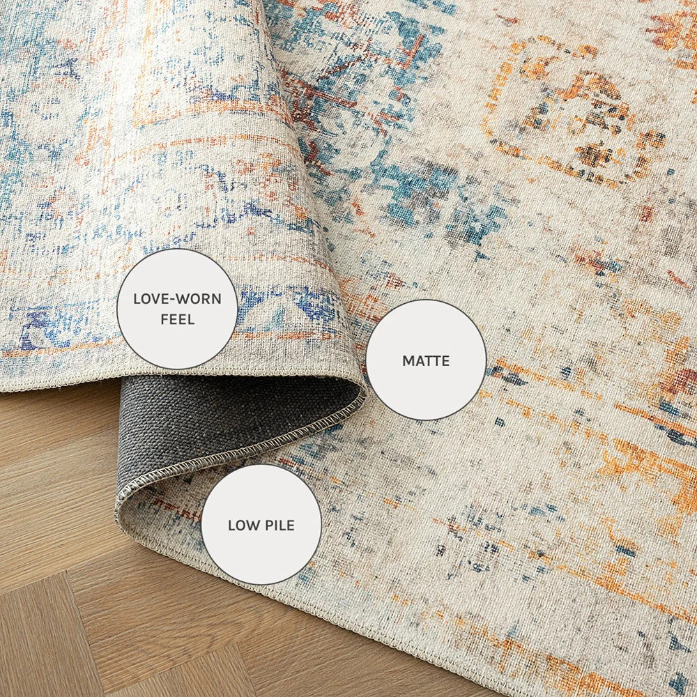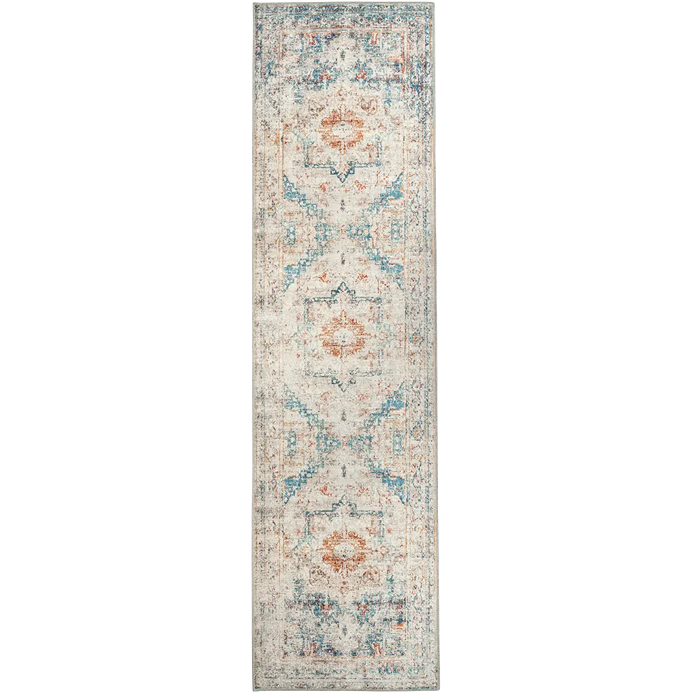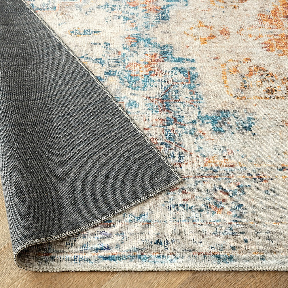 أضف لمسة من الطراز العتيق إلى منزلك مع هذه السجادة الباهتة. تتميز بنمط ميدالية معقد مع تدرجات من اللون الأزرق والبرتقالي، هذه السجادة التقليدية هي طريقة سهلة لترقية ديكورك الداخلي.