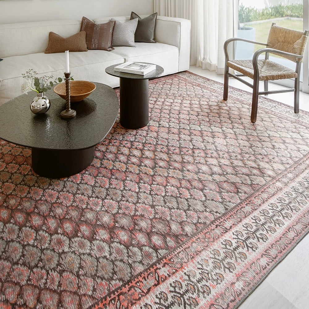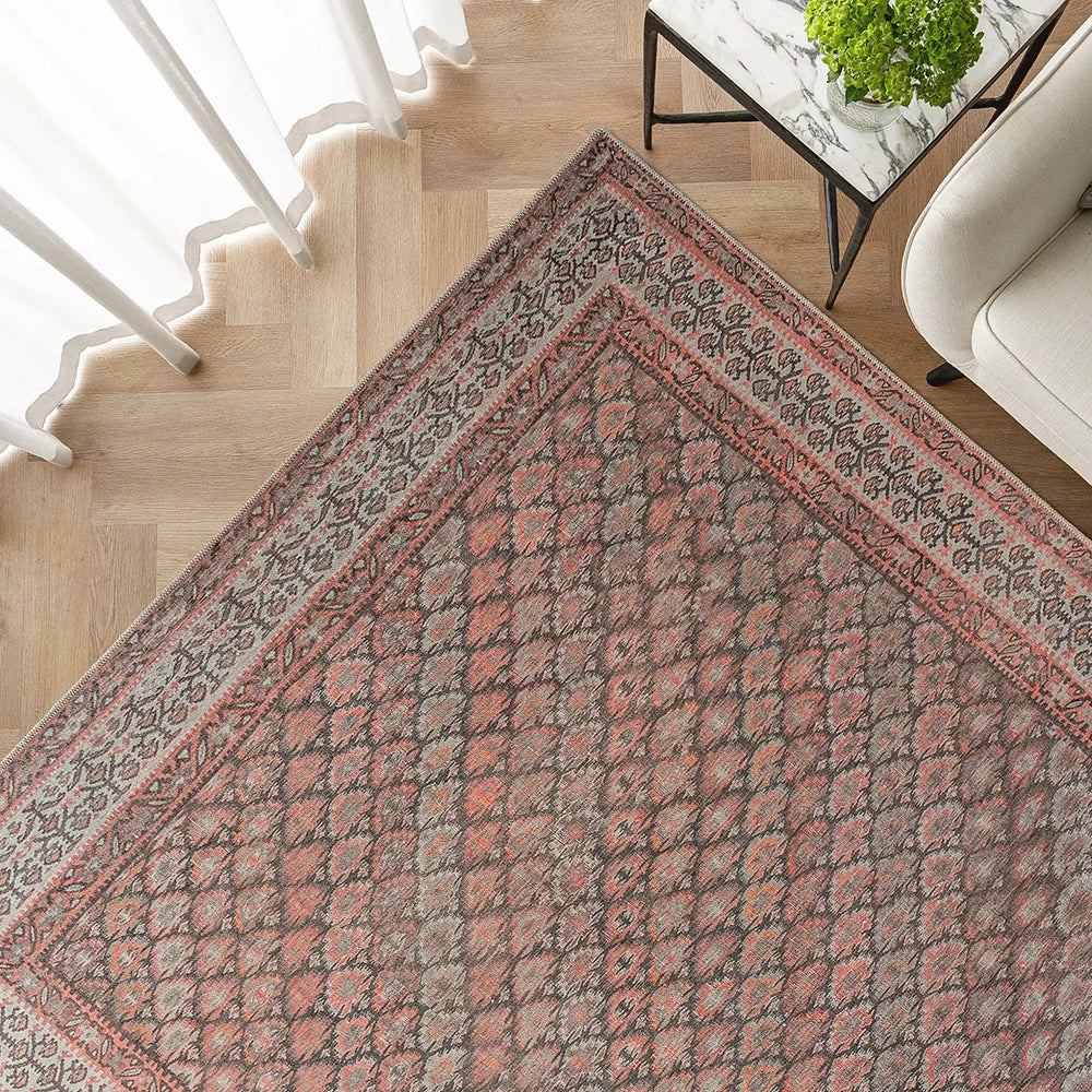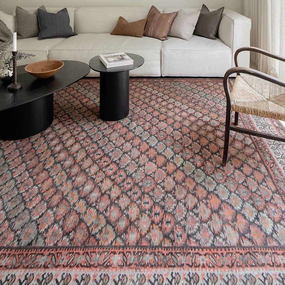 مزخرفة بنقوش مروحية متداخلة على خطوط مائلة تغطي السجادة بالكامل، تعد هذه السجادة باللون المرجاني خياراً أنيقاً لأي مساحة. مثالية لغرفة النوم وتضيف لمسة ناعمة إلى ديكور منزلك.