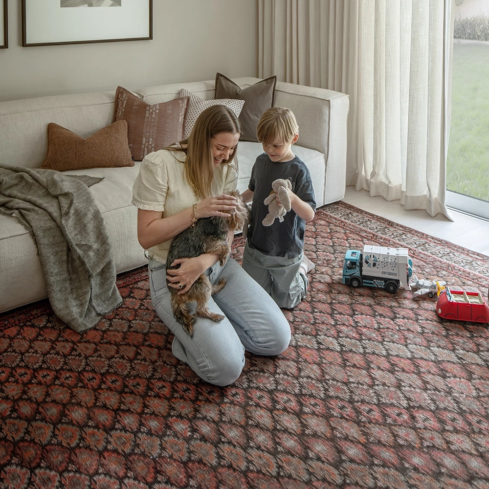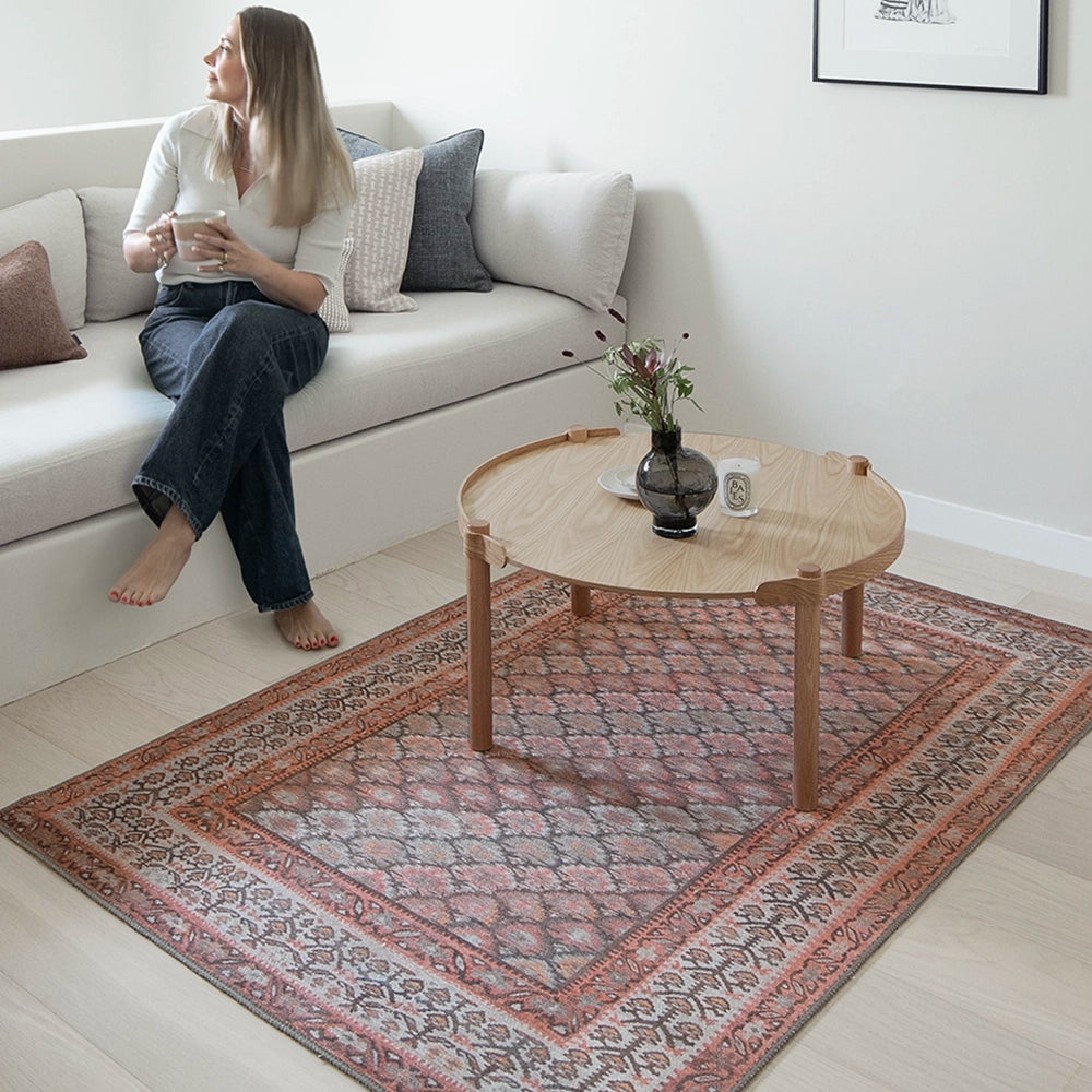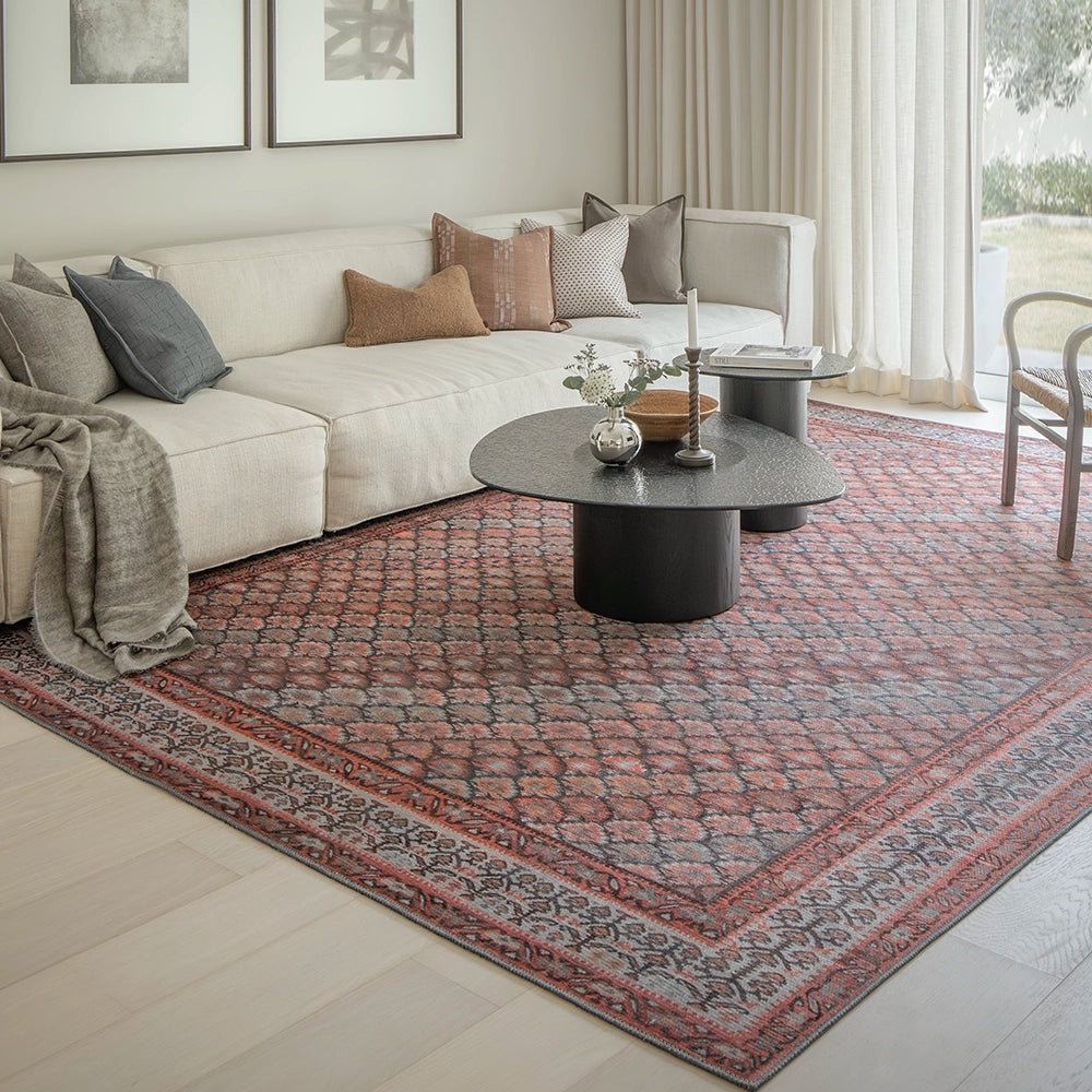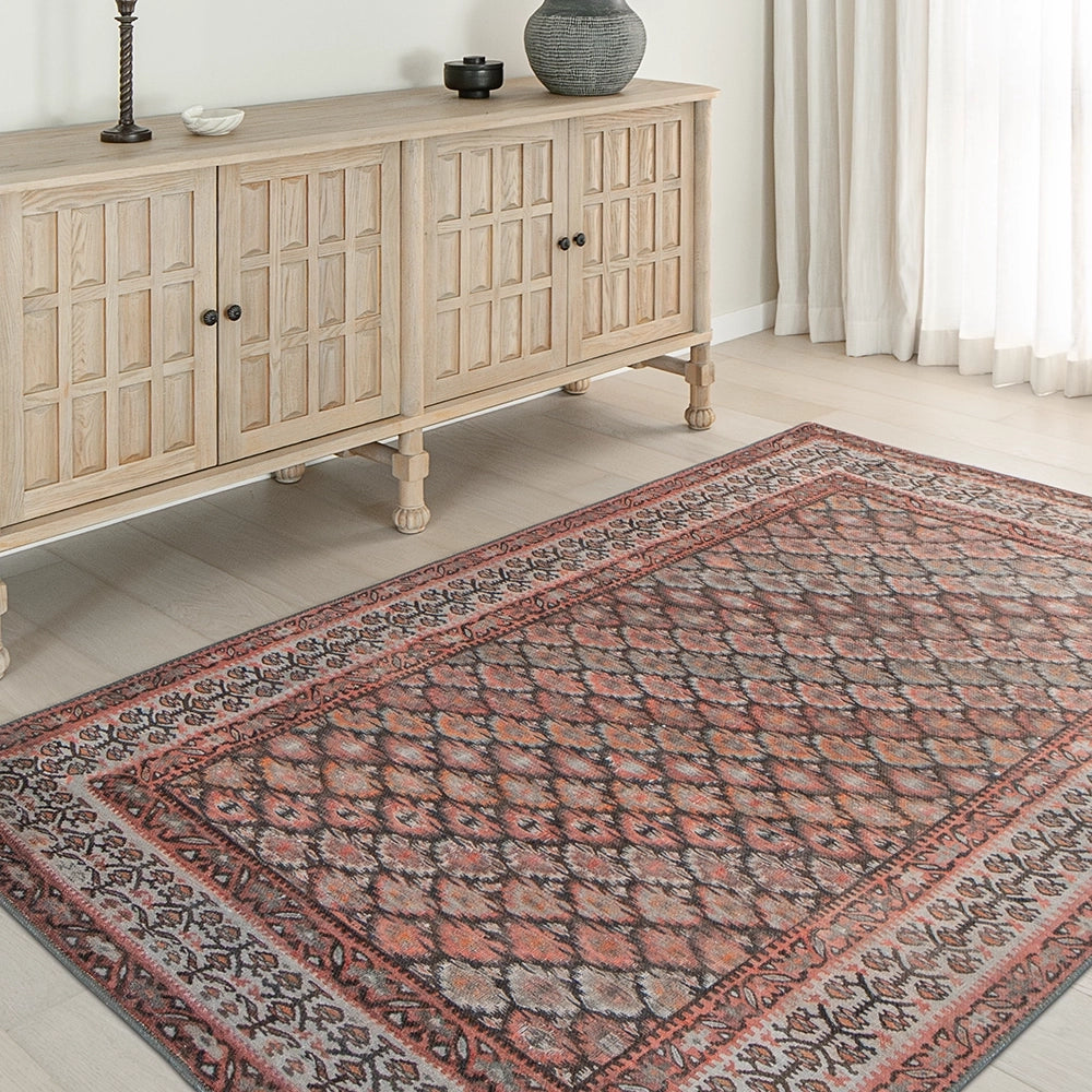مزخرفة بنقوش مروحية متداخلة على خطوط مائلة تغطي السجادة بالكامل، تعد هذه السجادة باللون المرجاني خياراً أنيقاً لأي مساحة. مثالية لغرفة النوم وتضيف لمسة ناعمة إلى ديكور منزلك.