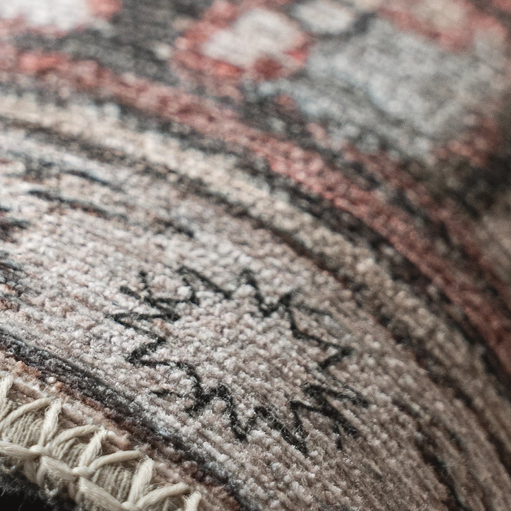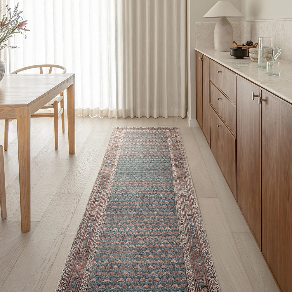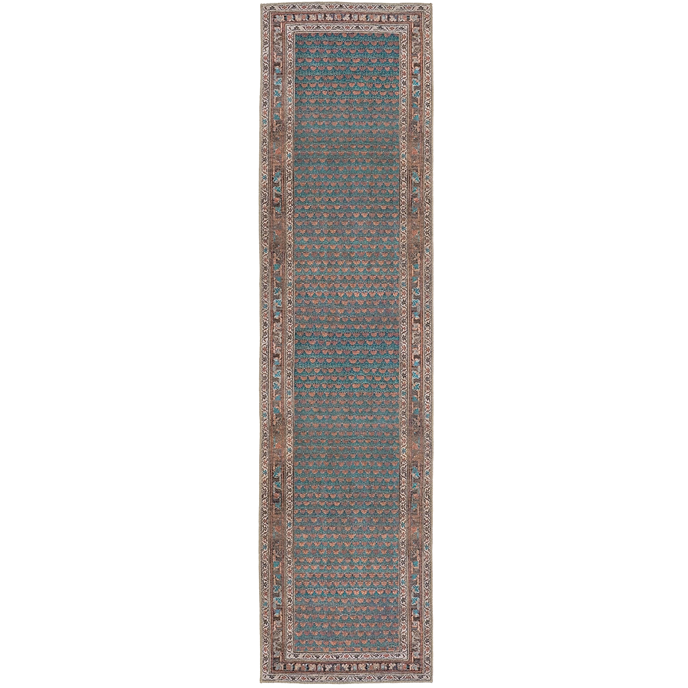 بتدرجات الأزرق الصخري والأحمر الطوبي، تضيف هذه السجادة العتيقة لمسة حيوية فورية لغرفة المعيشة، أو غرفة النوم، أو الممر. تتميز بنمط متكرر صغير يغطي السجادة بالكامل ليضفي عمقًا على أي تصميم داخلي.
