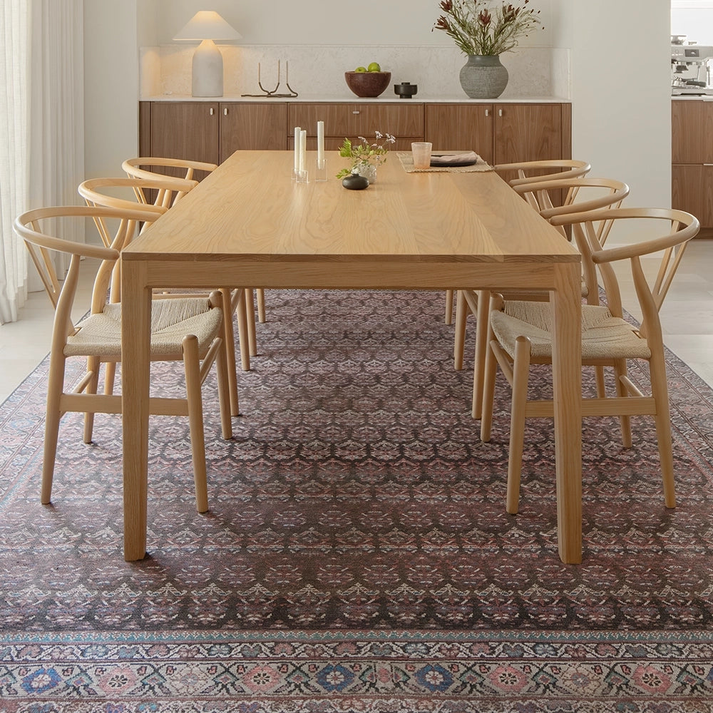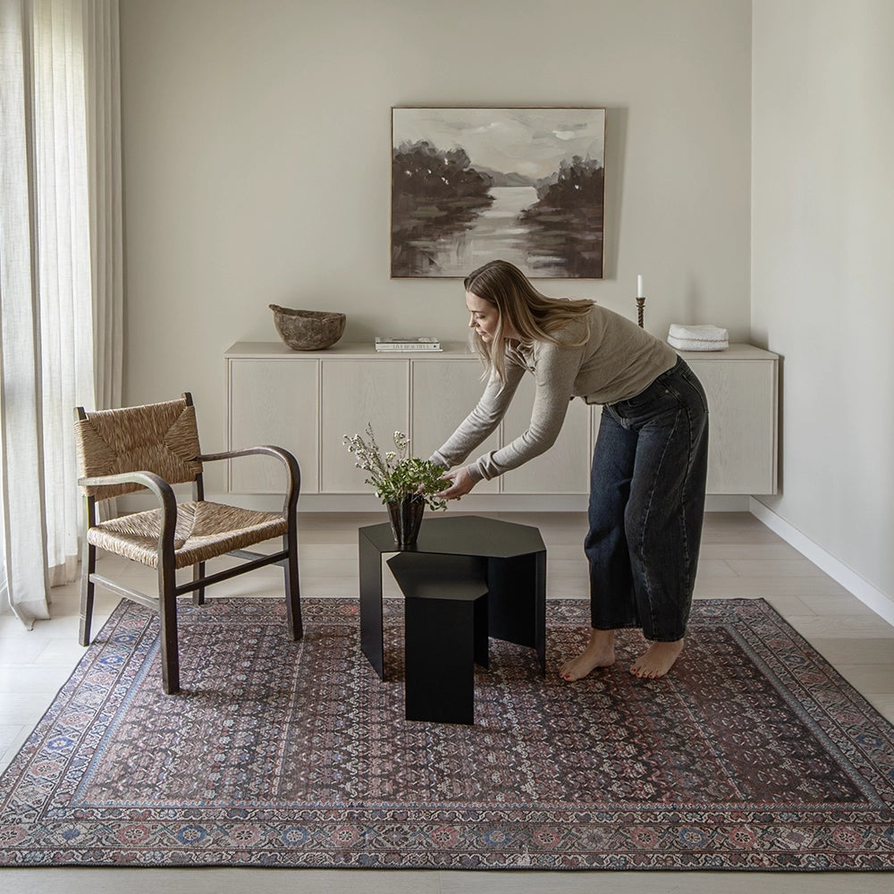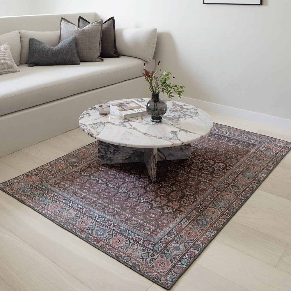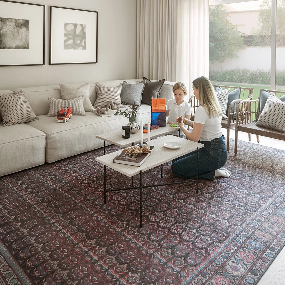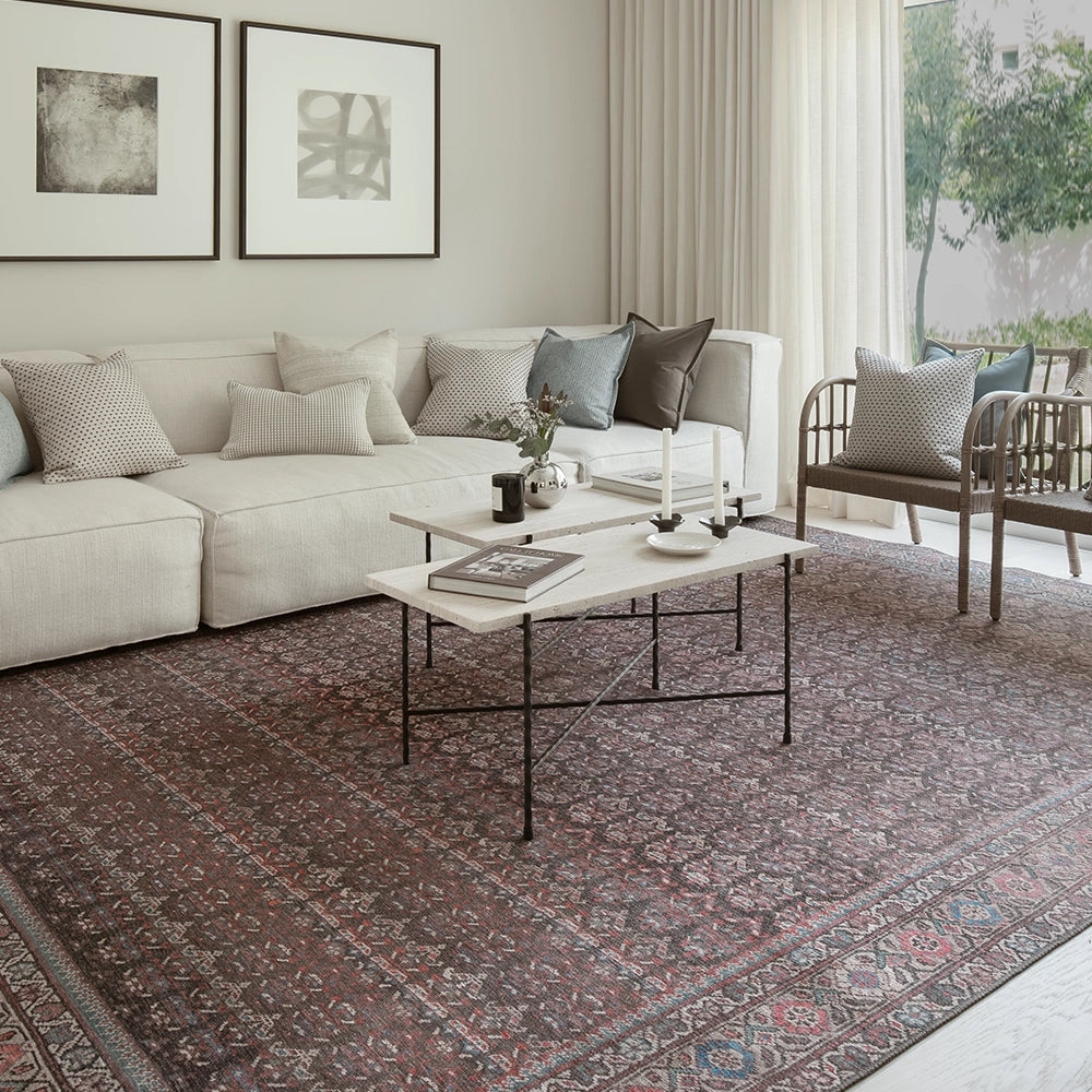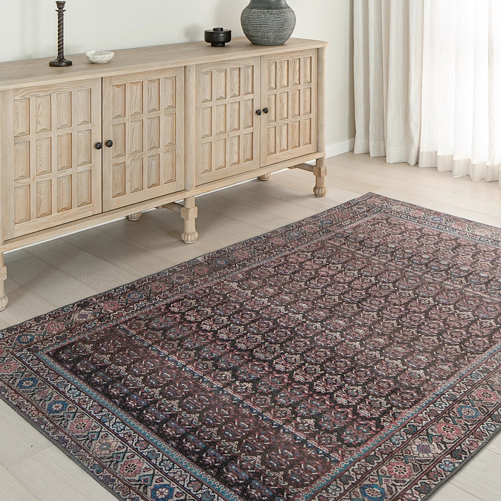 تعزز الألوان الغنية من مستوى هذه السجادة العتيقة لتصبح خيارًا أنيقًا للديكورات العصرية. بتدرجات اللون الأحمر الماروني، والأزرق والوردي مع لمسات من اللون الفيروزي، تضيف لمسة فاخرة لأي غرفة في منزلك.
