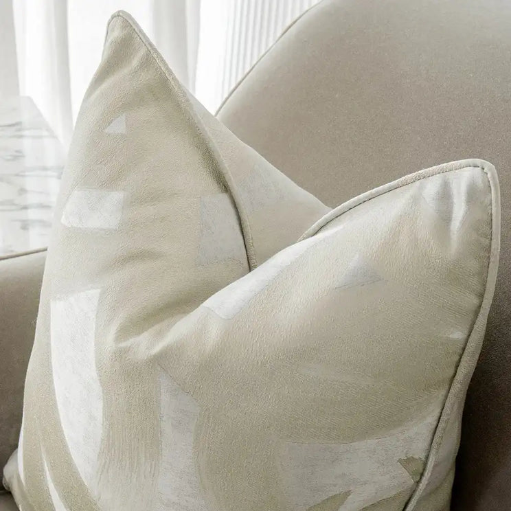 التصميم: وسادتين من المخمل الفاخر بلون بيج ووسادتين بتصميم فرشاة رمادي لامع ووسادة بتصميم بنمط مربعات