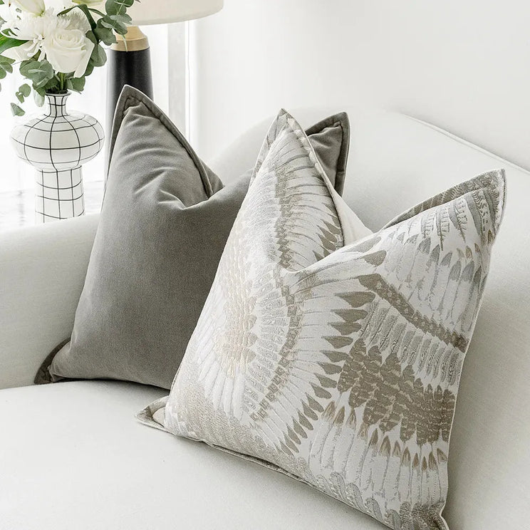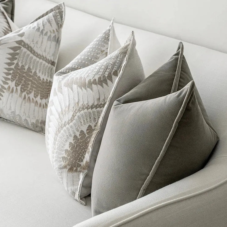 التصميم: وسادتان من المخمل الرمادي ووسادتان من الوسائد بتصميم ريش مع ظهر متباين