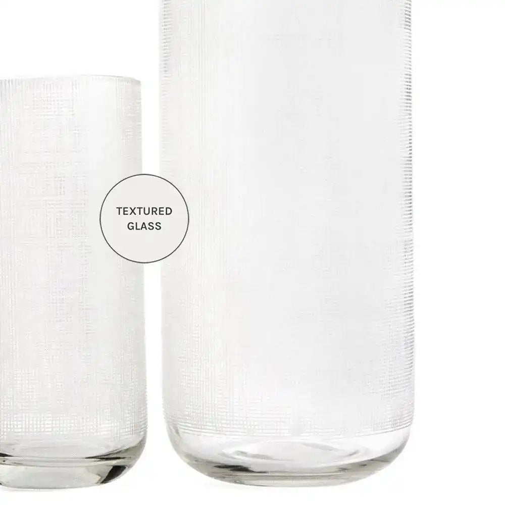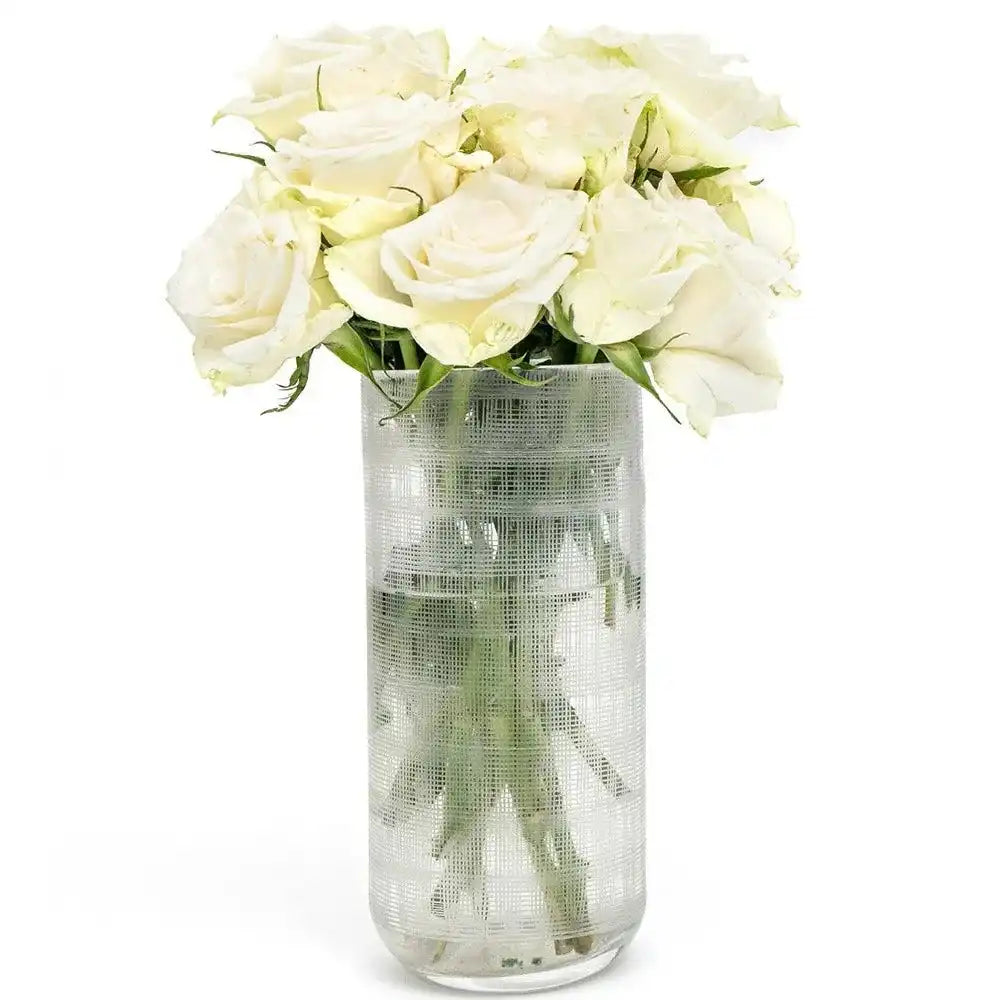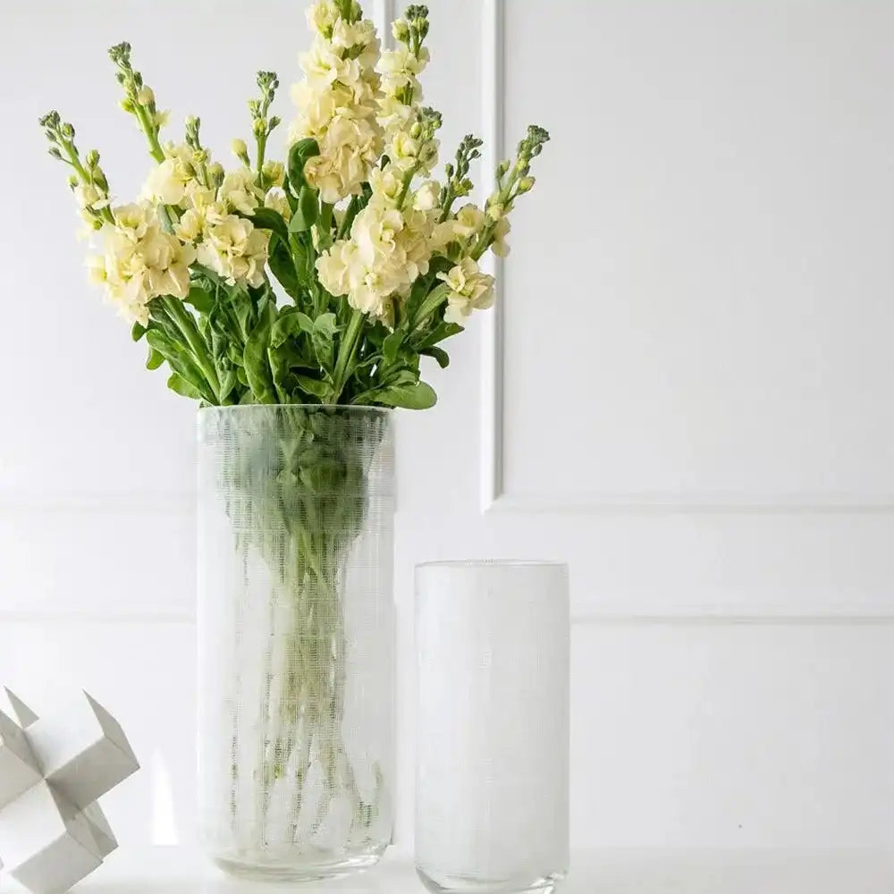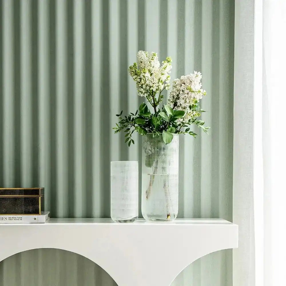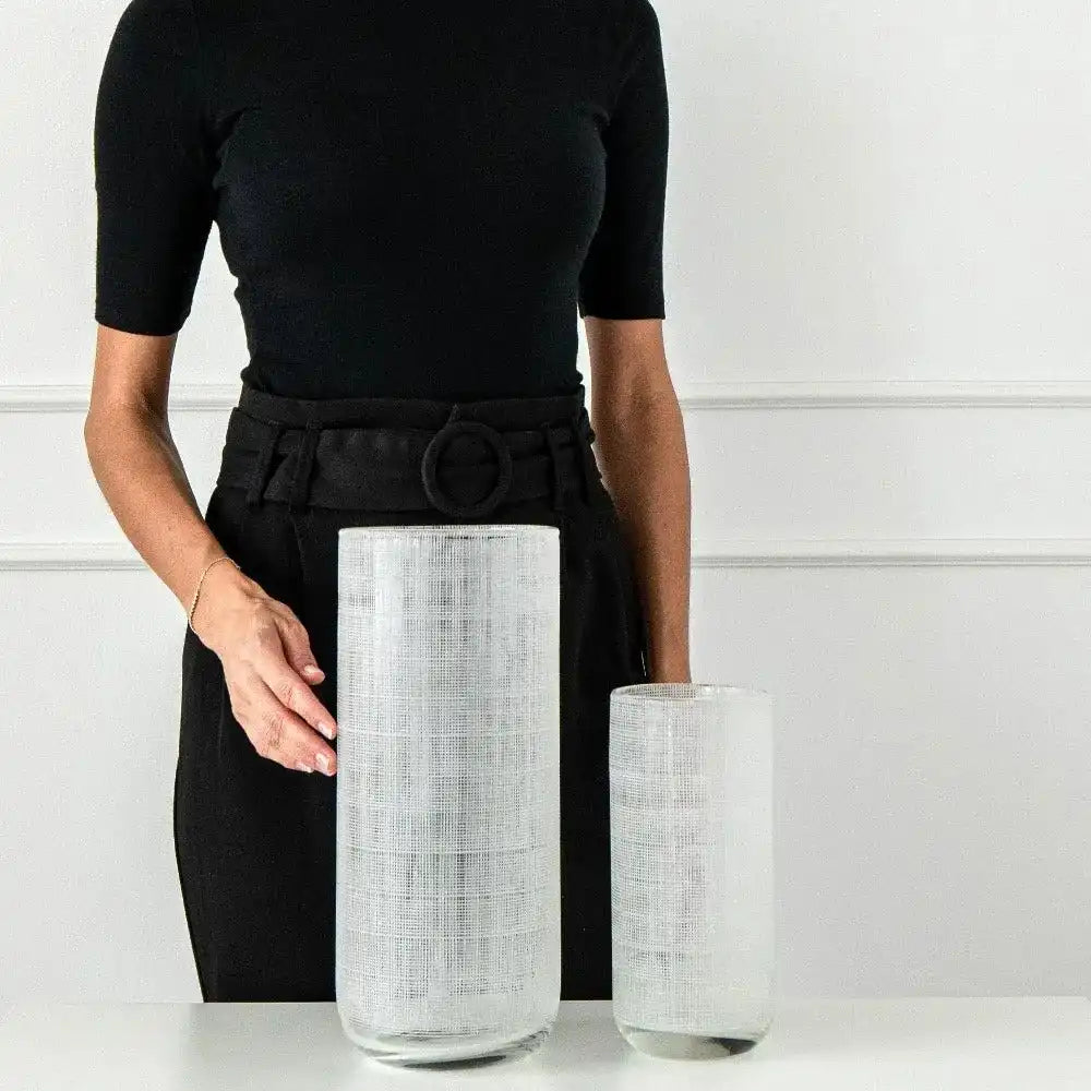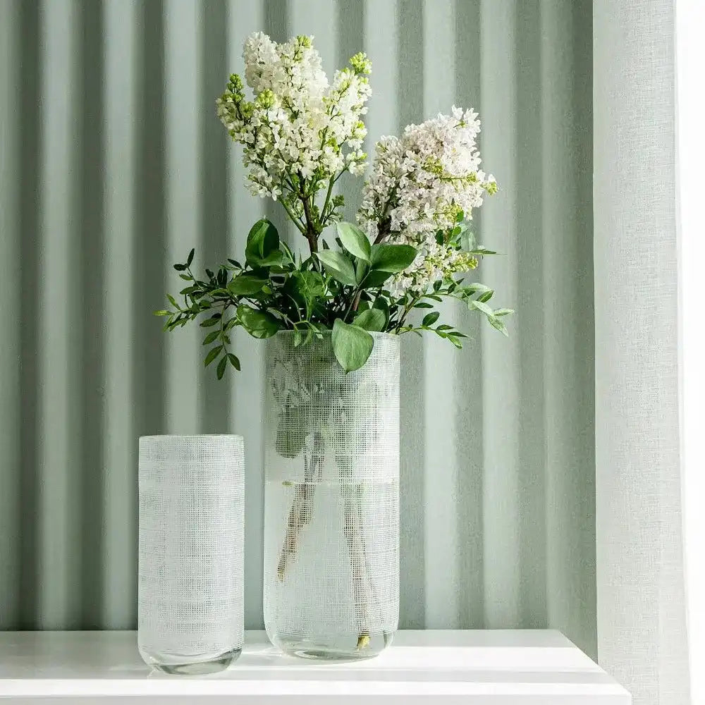 مزهريتان مصنوعة من الزجاج تأتي بخطوط بيضاء وتمنح لمسة من الأناقة إلى المكان.