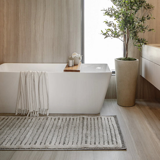 هذه السجادة باللون الرمادي والأيفوري مصنوعة من ألياف صناعية لتكون خيارًا عمليًا ومتينًا.