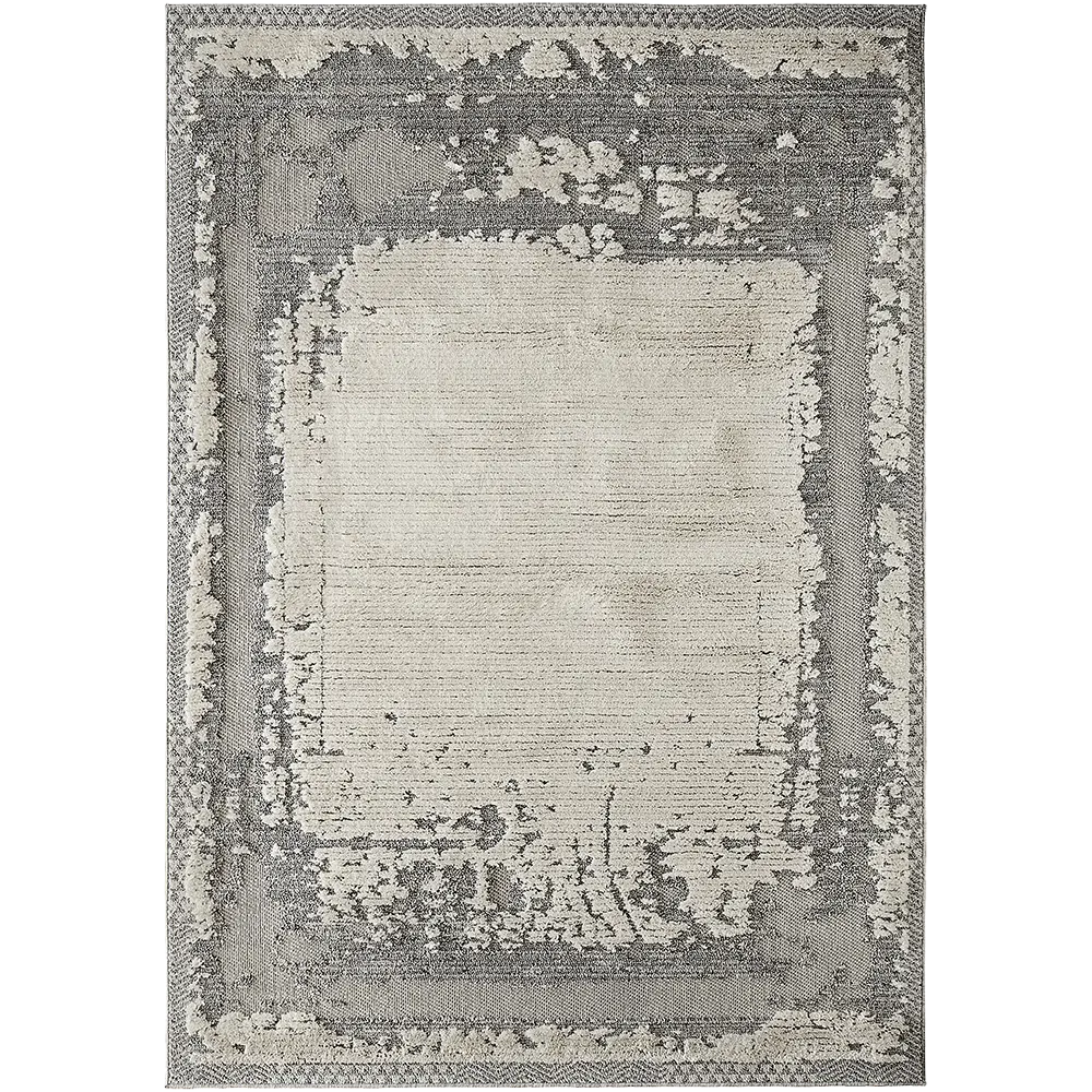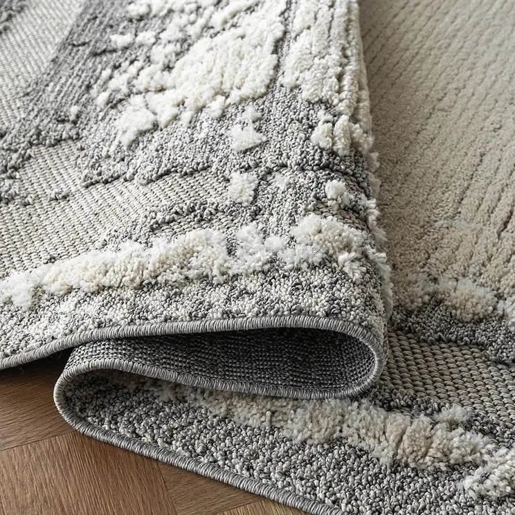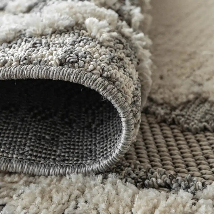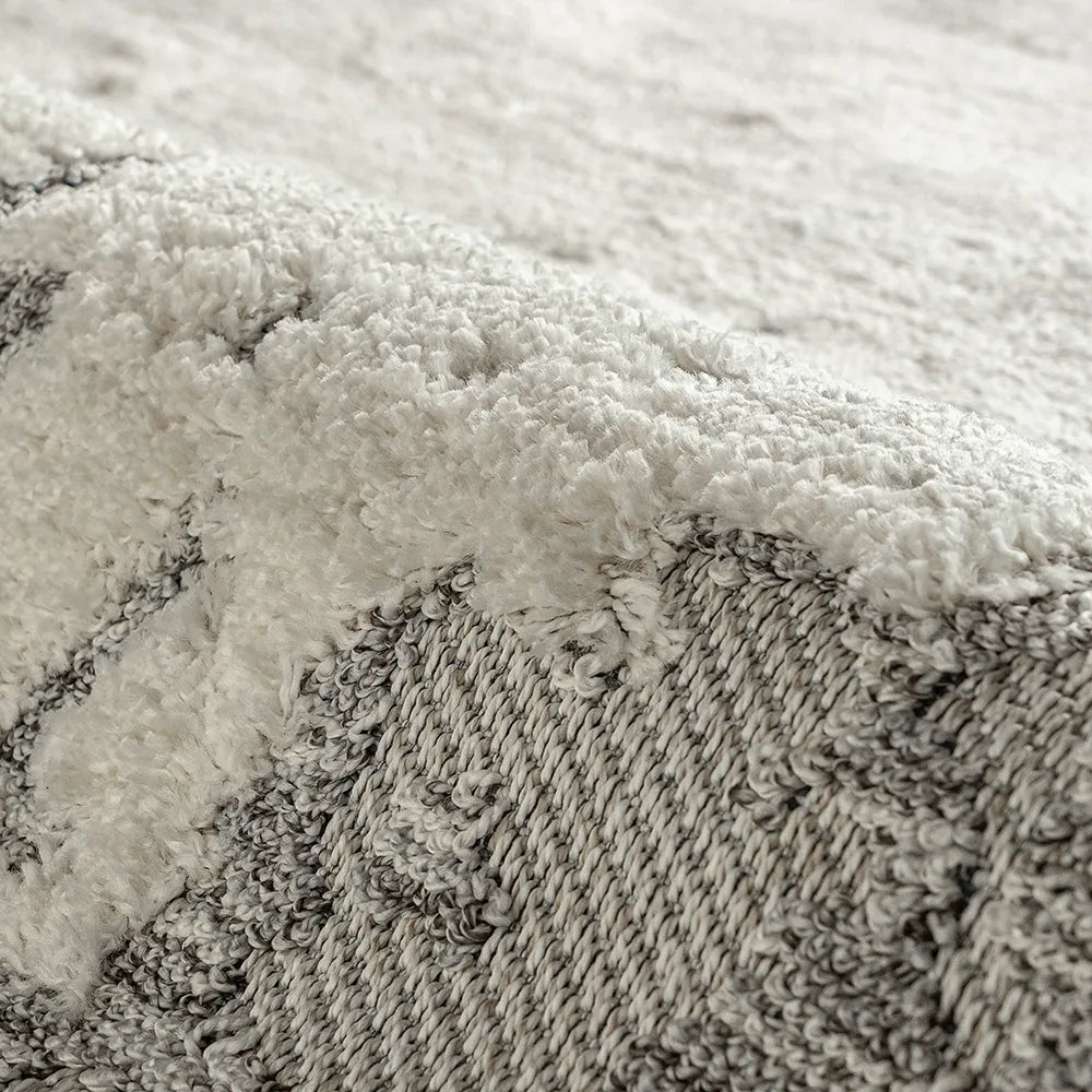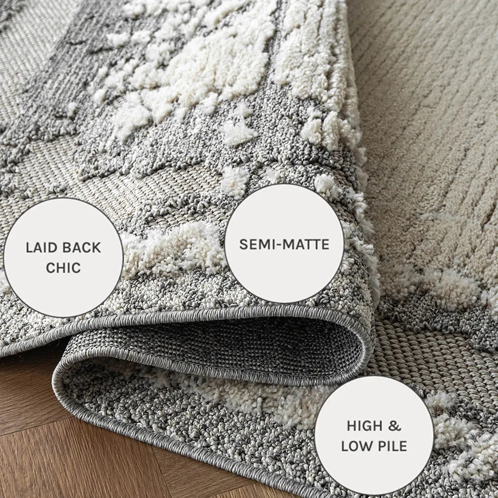 هذه السجادة باللون الرمادي والرمادي الداكن مصنوعة من ألياف صناعية وهي خيارًا عمليًا ومتينًا.