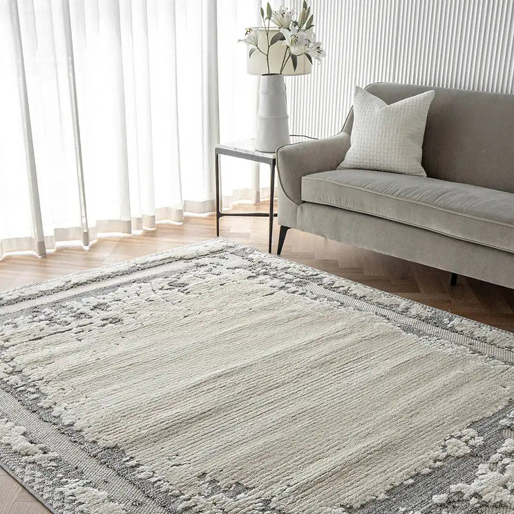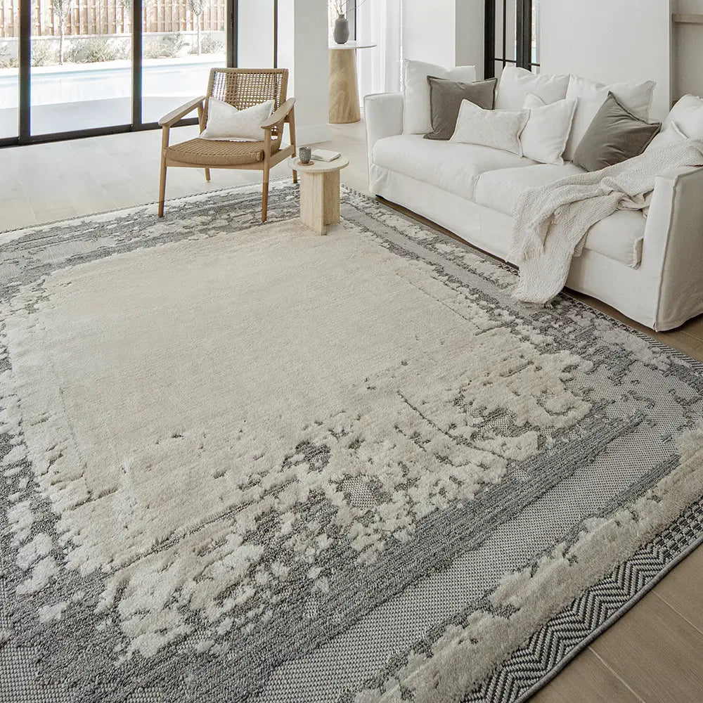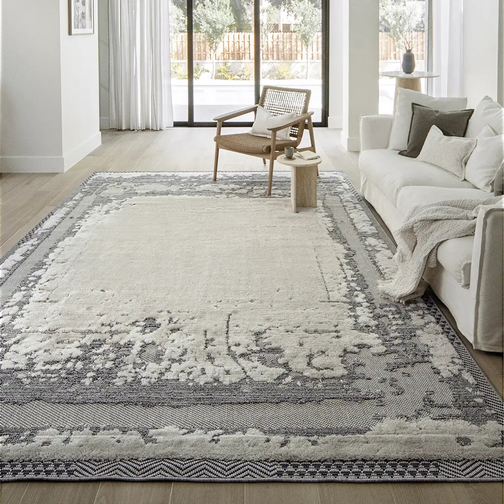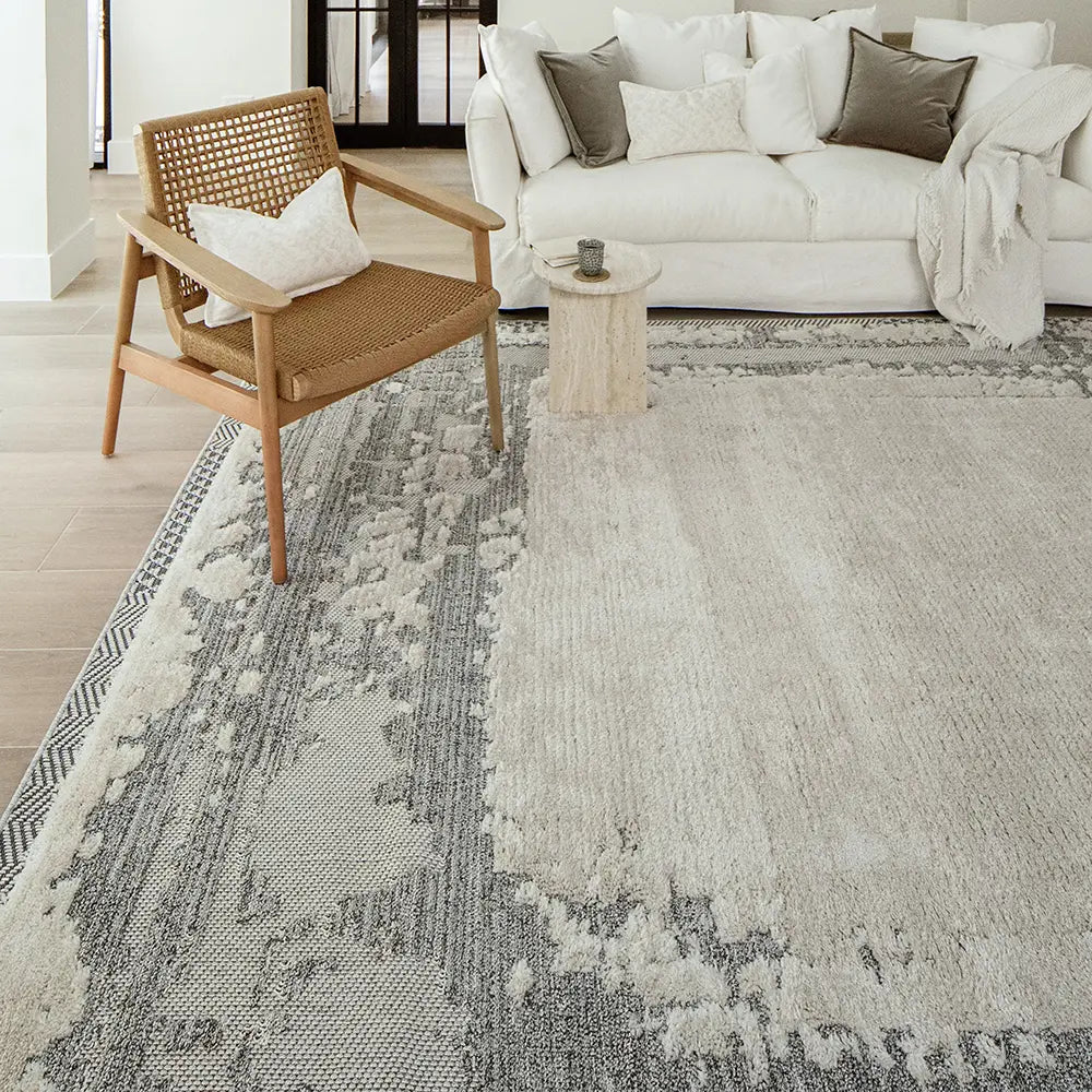 هذه السجادة باللون الرمادي والرمادي الداكن مصنوعة من ألياف صناعية وهي خيارًا عمليًا ومتينًا.