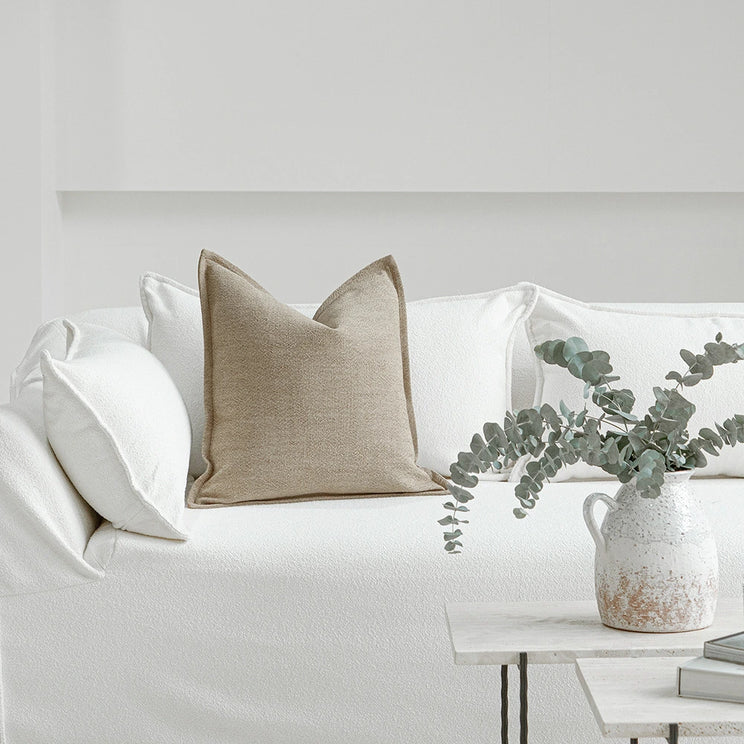 وسادة مصنوعة بإتقان من الكتان الطبيعي عالي الجودة، توفر ملمس ناعم وطبيعي وحضور مريح وأنيق في الوقت نفسه. لونها المتوازن بين البيج الترابي والدرجات الدافئة المحايدة يمنحها أناقة راقية تناسب أي ديكور.
