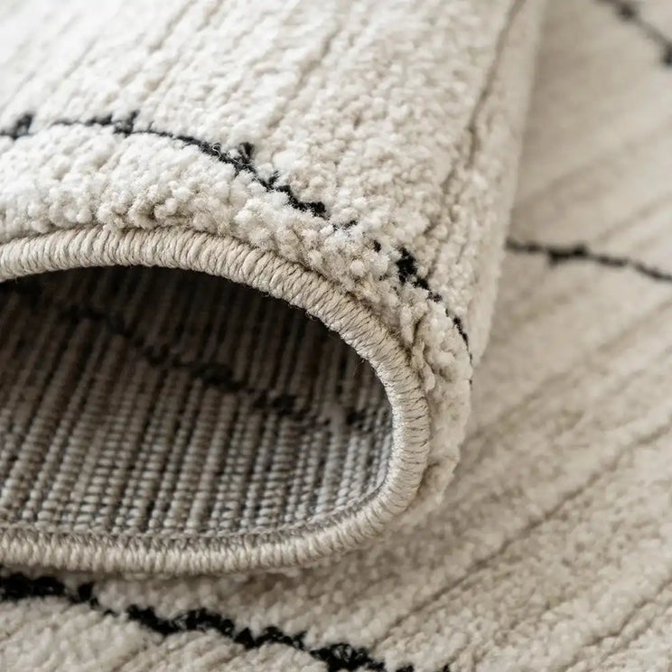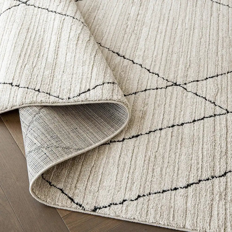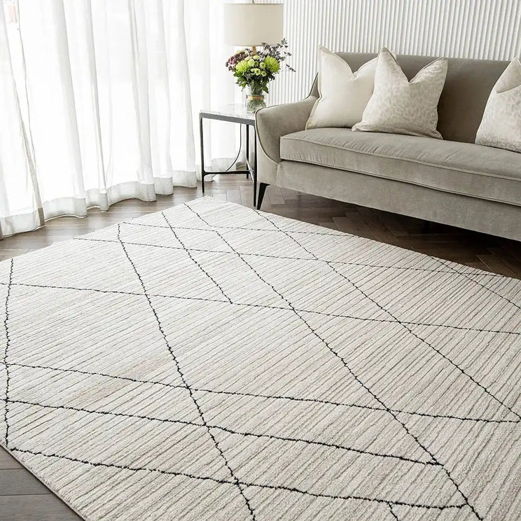 سجادة رقيقة وفاخرة من اللون الرمادي والأيفوري للمسة من الأناقة في المكان.