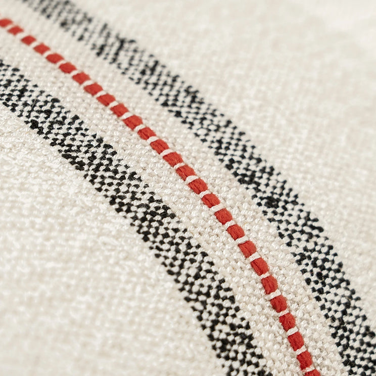 التصميم: تتميز بنمط منسوج على شكل مربعات مدمجة في القماش الأساسي، محاط بخطوط مزدوجة على الجوانب وخط رفيع في الوسط باللون الأحمر الخافت. يجمع التصميم بين تفاصيل باللون الفحمي وتدرجات دافئة، ليضفي لمسة عصرية راقية على الأقمشة التقليدية المنسوجة يدويًا، بينما تحافظ الخلفية على نفس النسيج لإطلالة متناسقة.