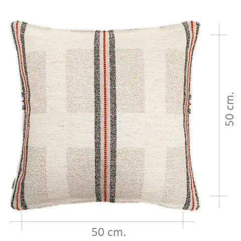 وسادة منسوجة بإتقان بألوان طبيعية ناعمة، مع كتل لونية دقيقة وخطوط متباينة بارزة. يمنحك القماش إحساس حرفي مريح، خفيف الوزن ومنظم، ليضفي لمسة دفء طبيعية وأنيقة على أي مساحة.