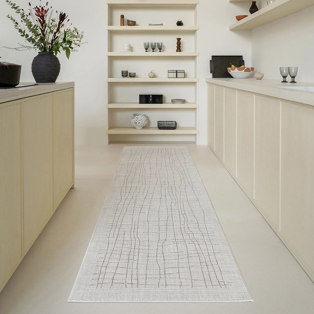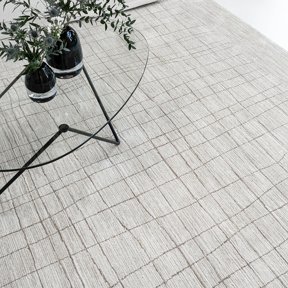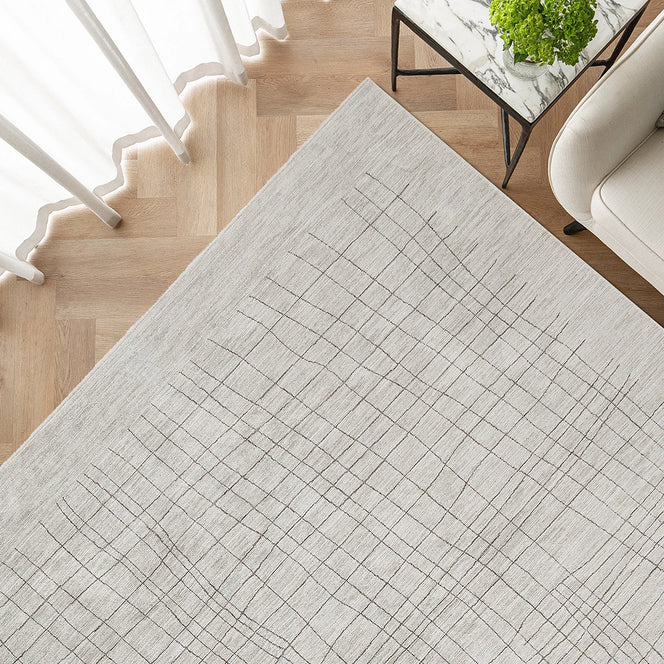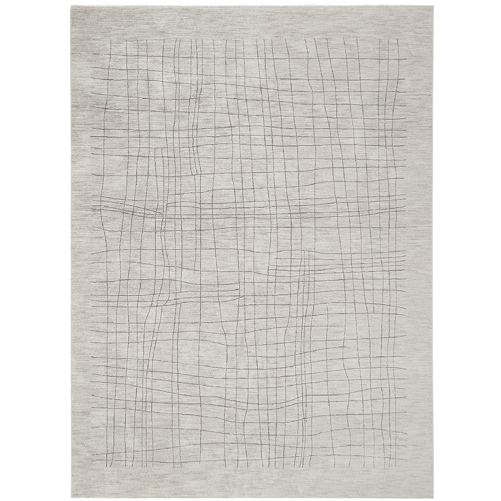 سجادة عصرية بلون عاجي دافئ، مزينة بخطوط غير منتظمة ناعمة باللون البني الفاتح المحايد. تضيف الشبكة المرسومة يدويًا لمسة من الحركة الهادئة والأناقة البسيطة لأي مساحة.