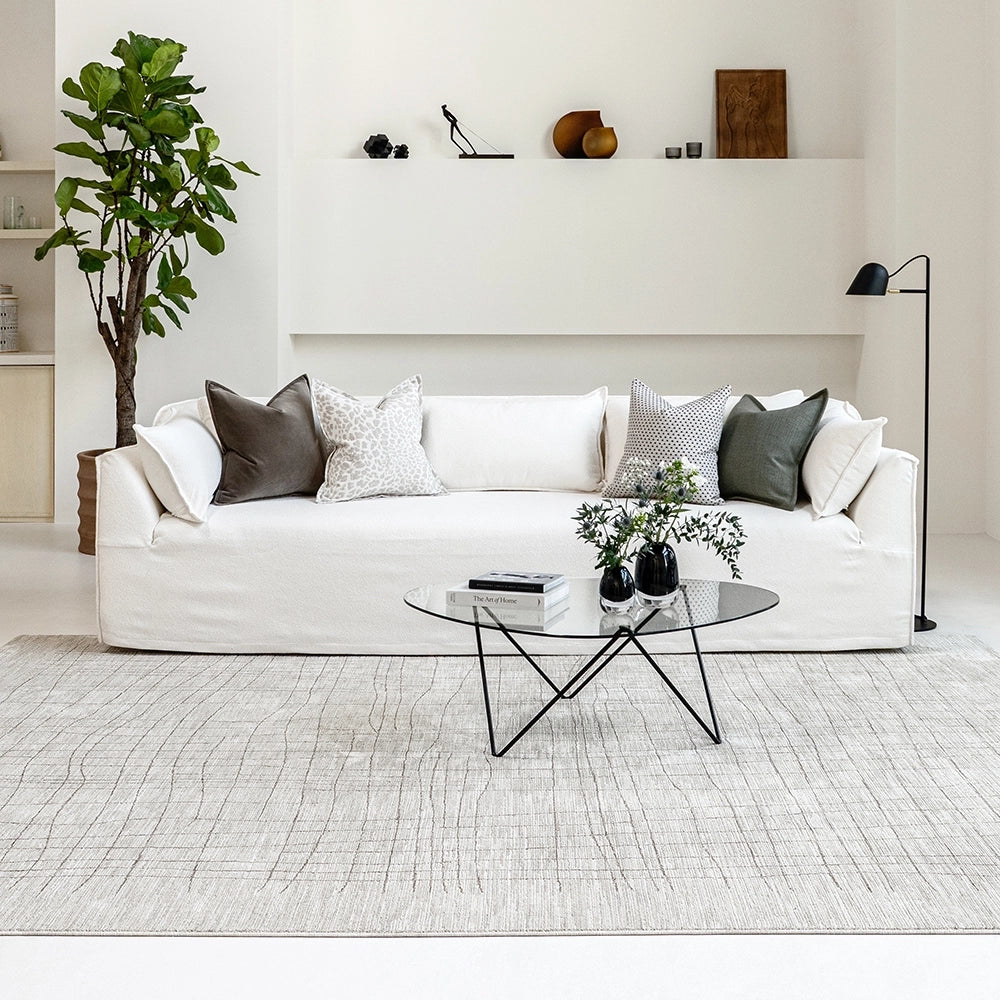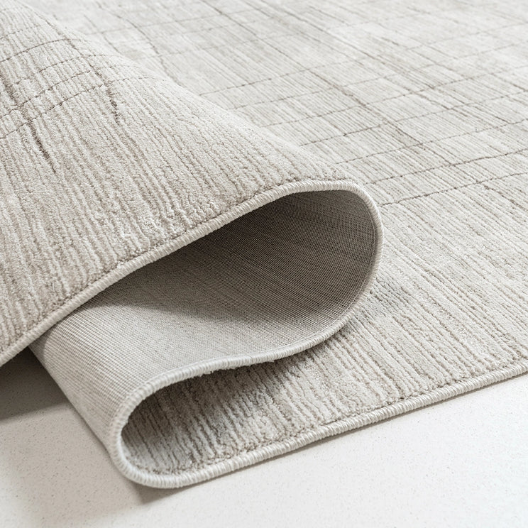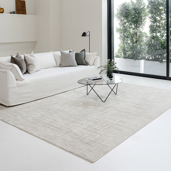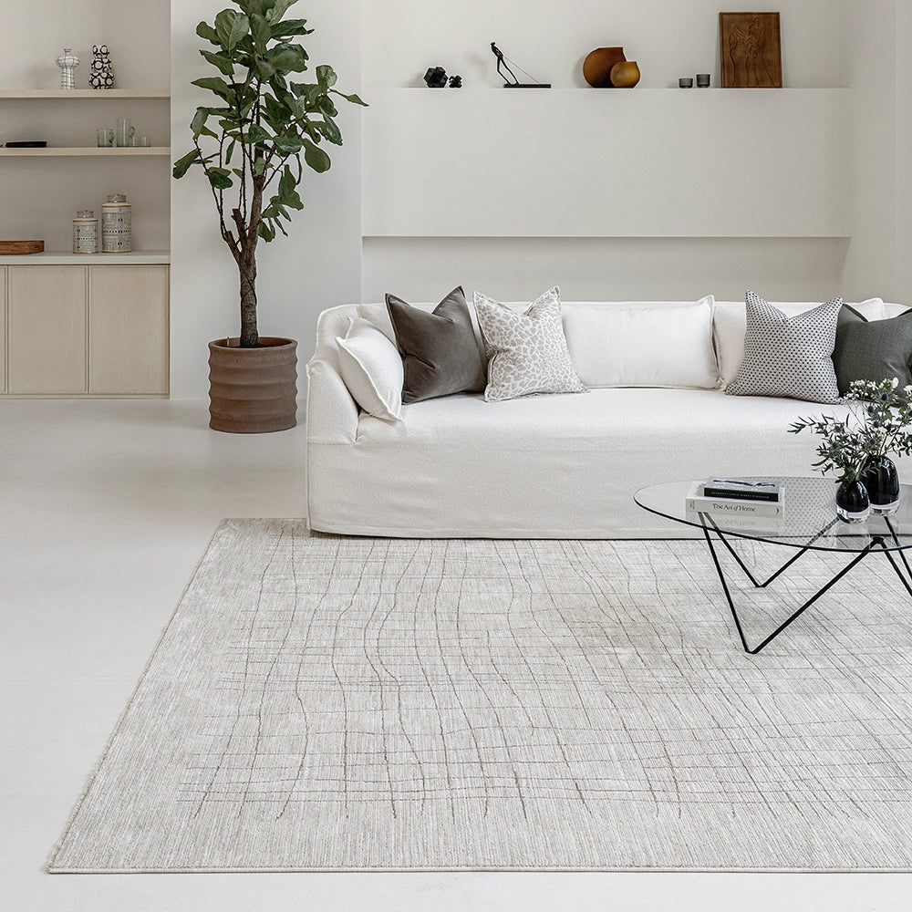 سجادة عصرية بلون عاجي دافئ، مزينة بخطوط غير منتظمة ناعمة باللون البني الفاتح المحايد. تضيف الشبكة المرسومة يدويًا لمسة من الحركة الهادئة والأناقة البسيطة لأي مساحة.