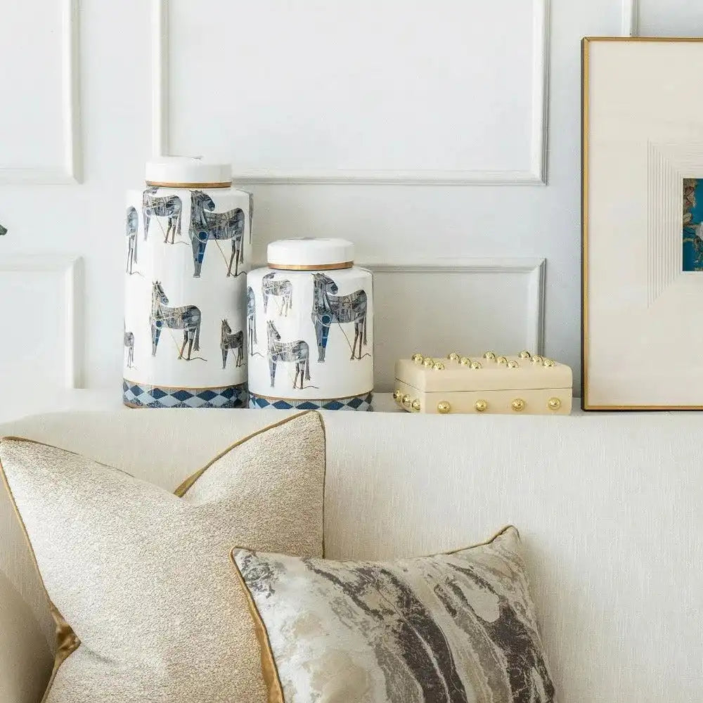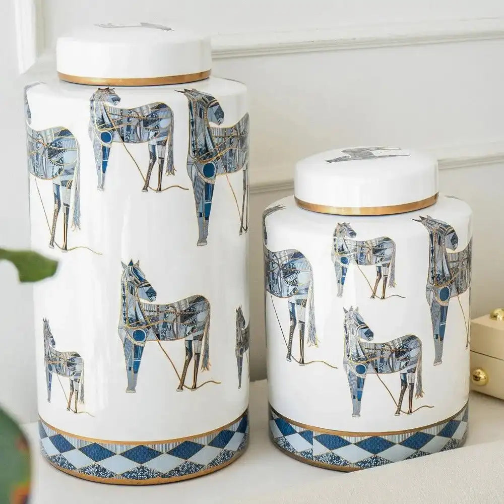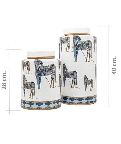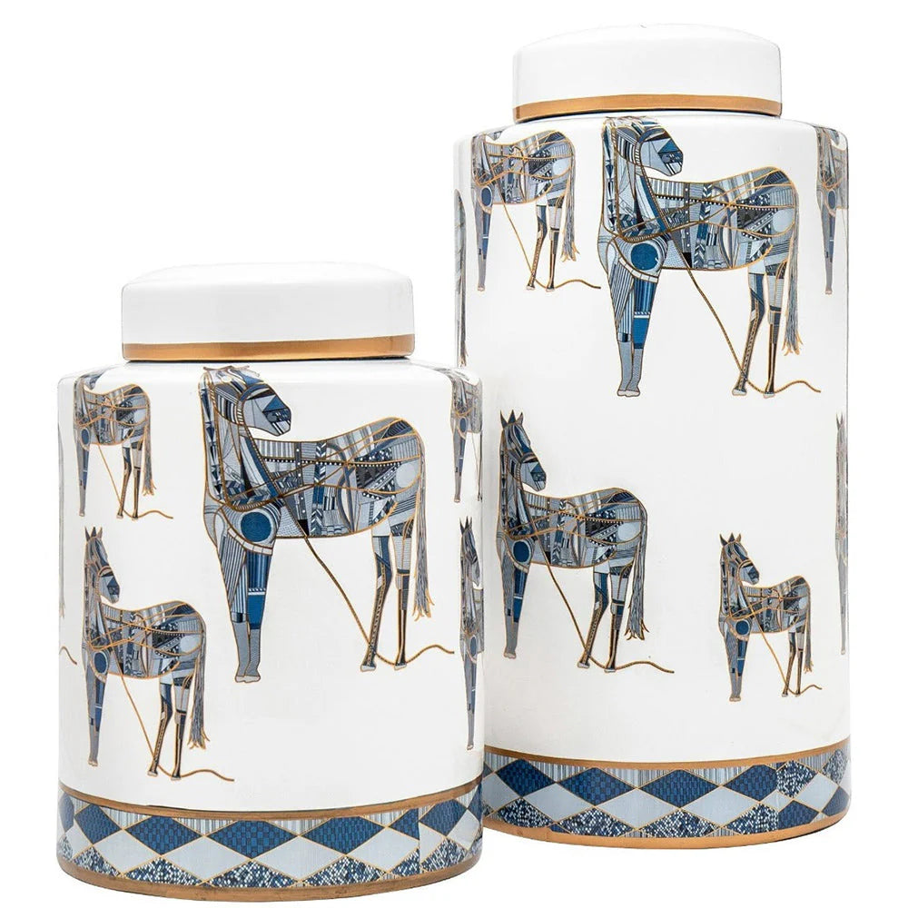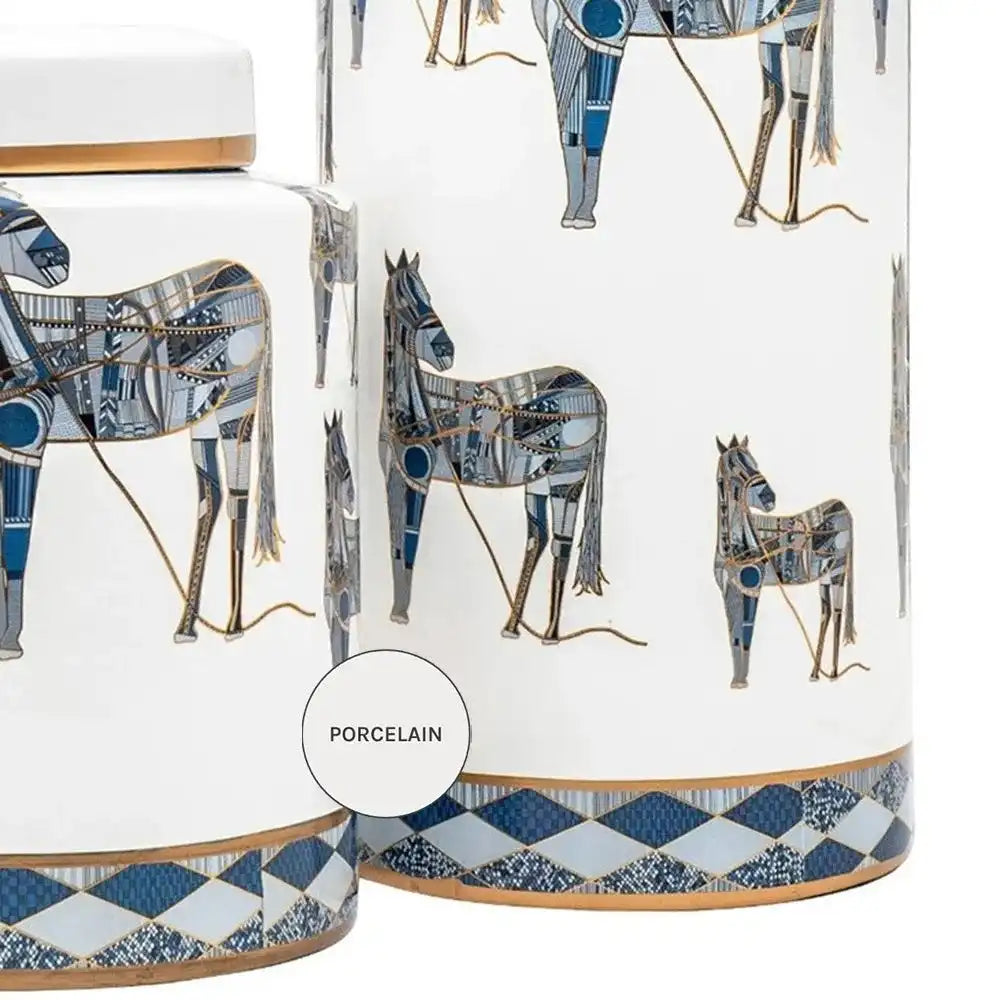 Keep clutter at bay and add a designer flourish to your home with this popular and versatile canister set. It includes two white ceramic jars with a playful horse design in blue with gold accents.