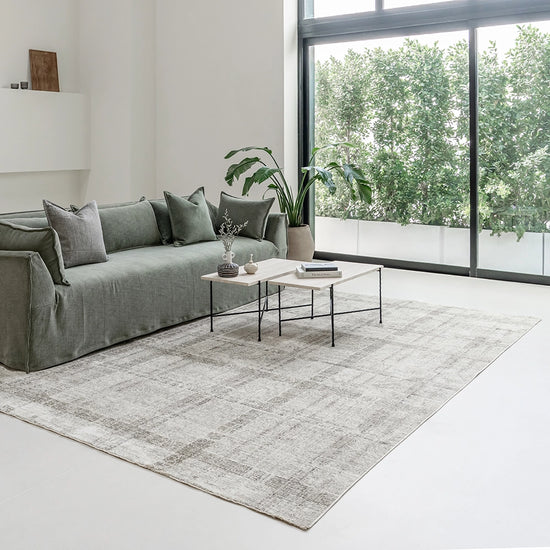 A soft ivory base interwoven with stone-taupe tones and a whisper of sage creates a gently worn plaid effect. Its smooth high-pile surface and light sheen add subtle texture and warmth to any room.