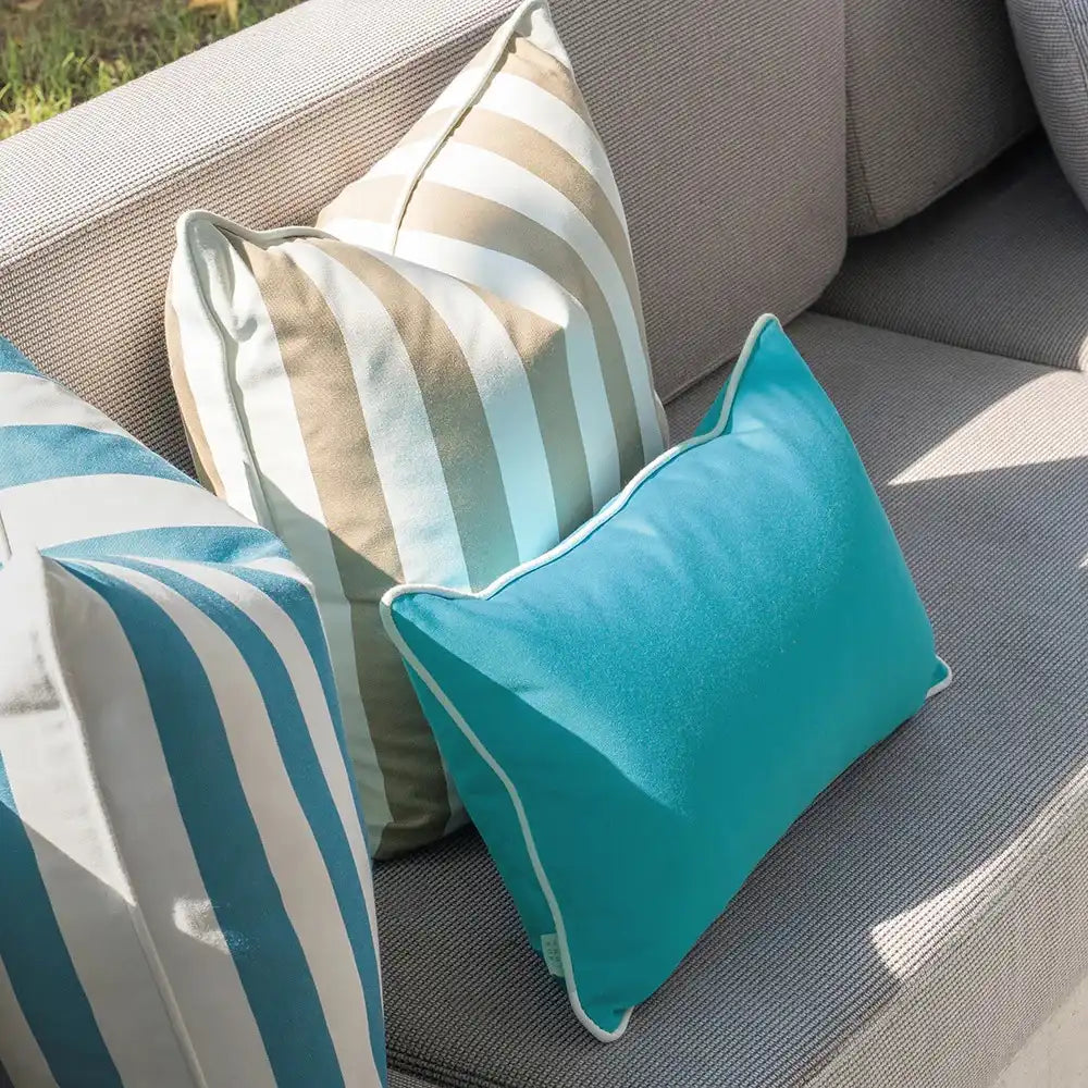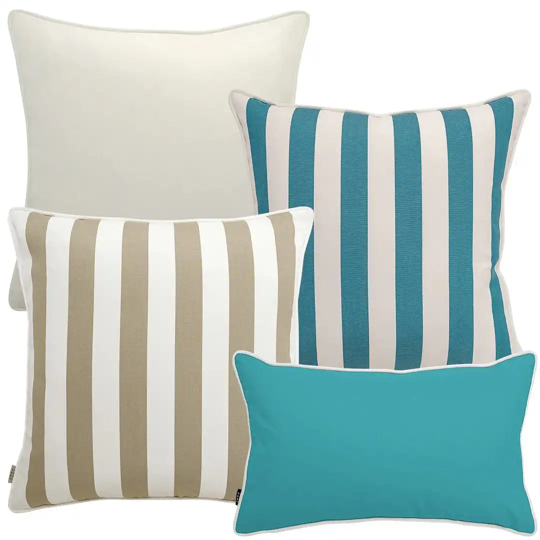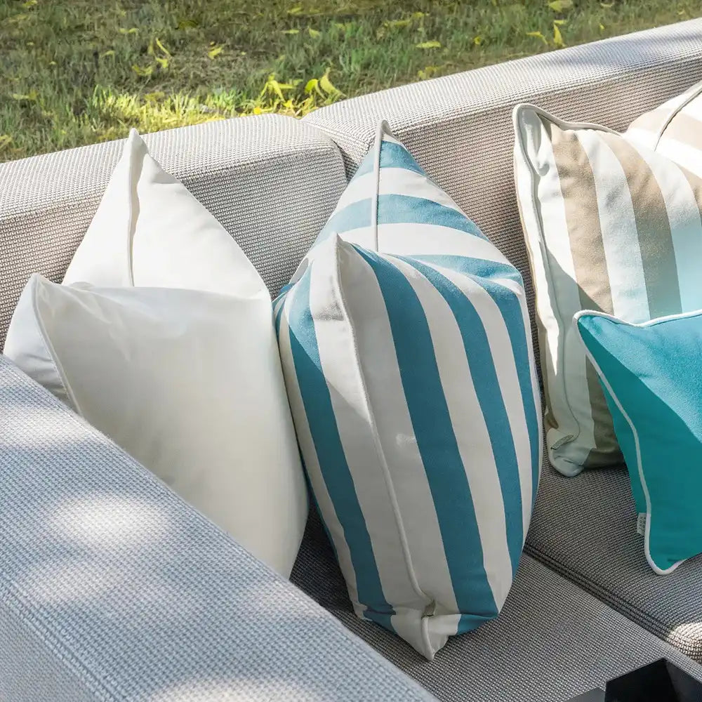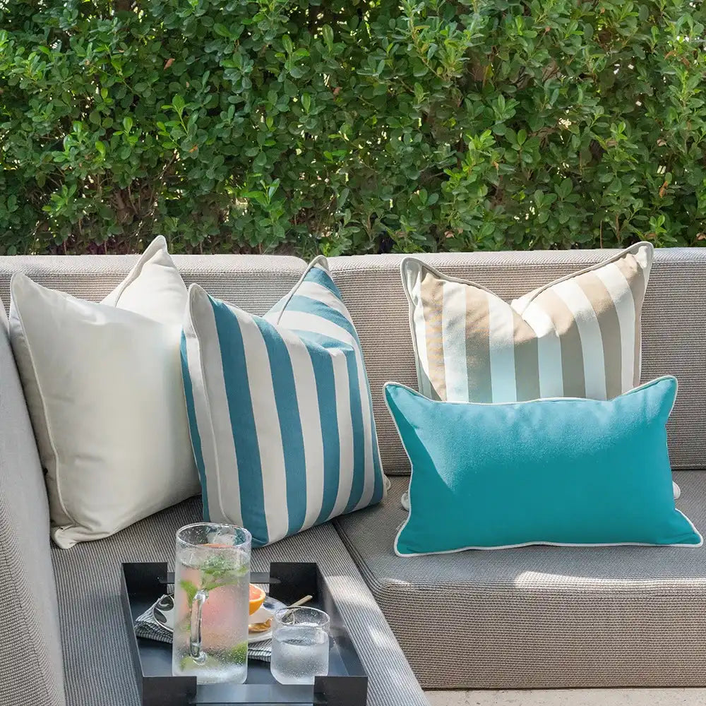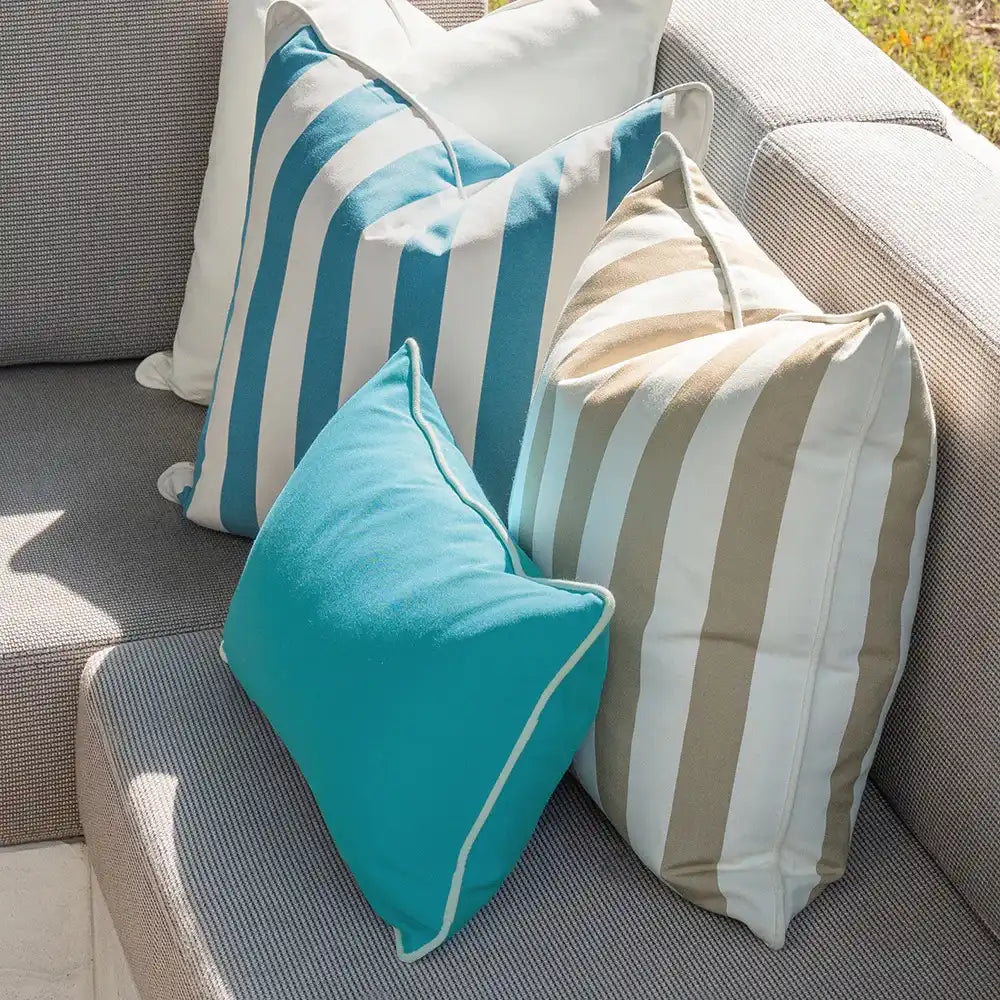 Beach vibes: in shades of sky blue and sand, this plain and striped cushion set brings the ocean to your home. The cushions are suitable for both indoor and outdoor use – perfect for your patio.