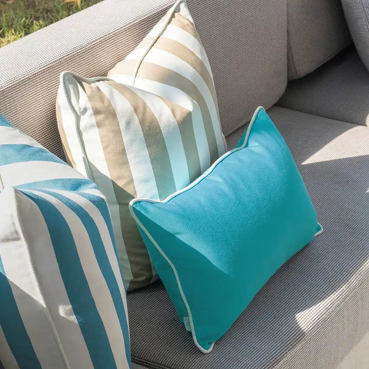 Design: A plain white cushion, two striped cushions and an accent cushion with contrast piping
