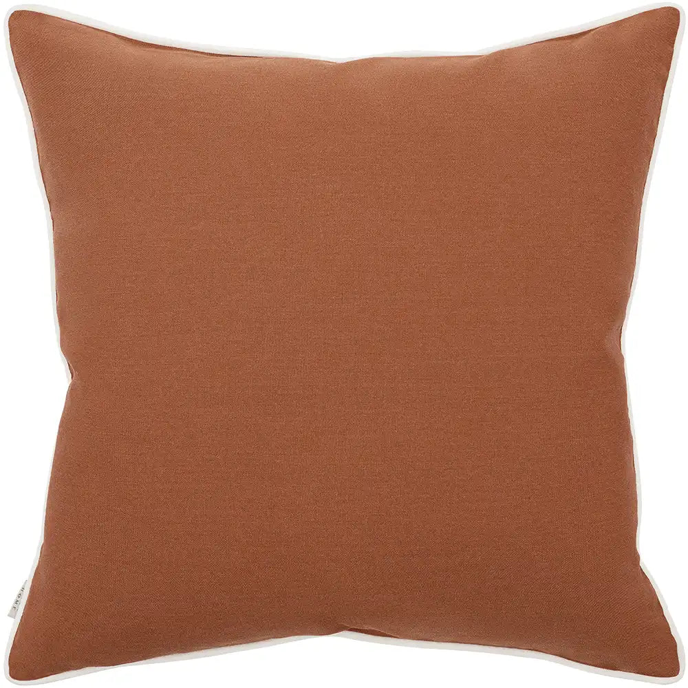 A warm rust cushion with a smooth, finely knit surface and soft contrast edging, bringing gentle structure and an inviting, earthy calm to the space.