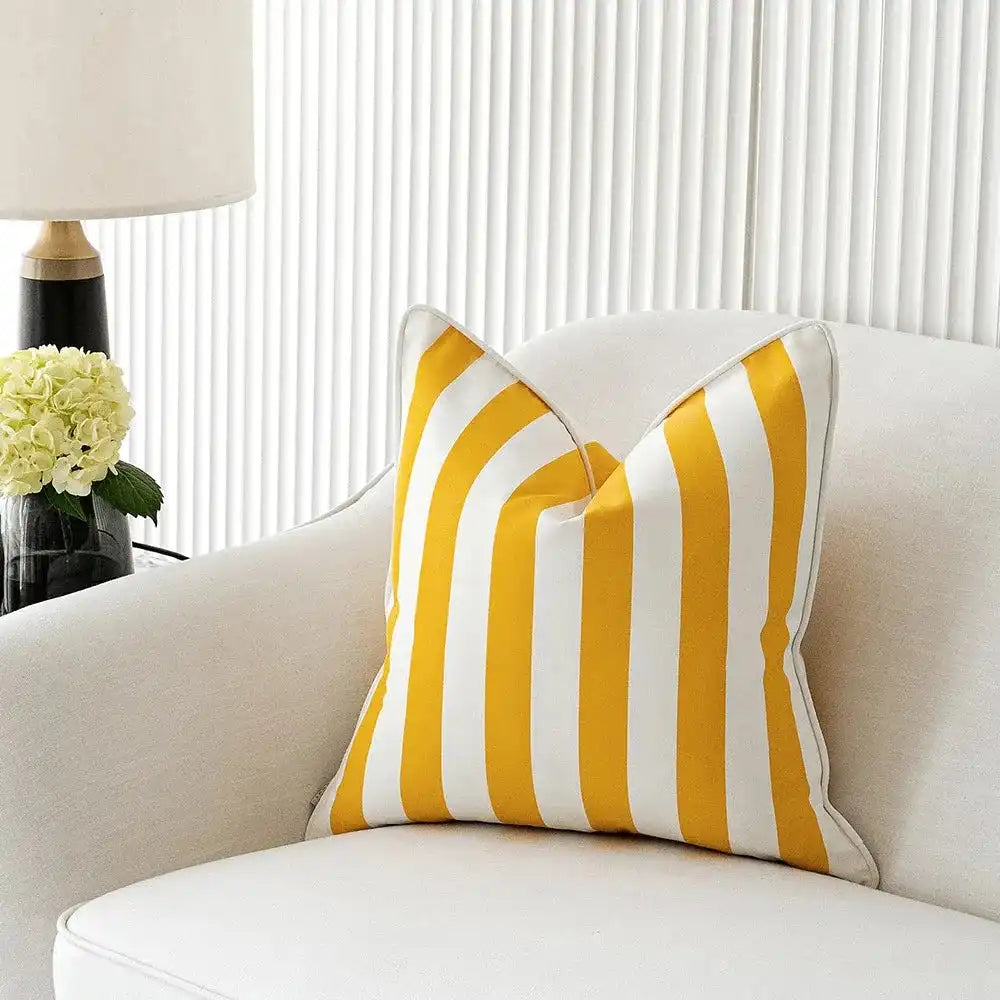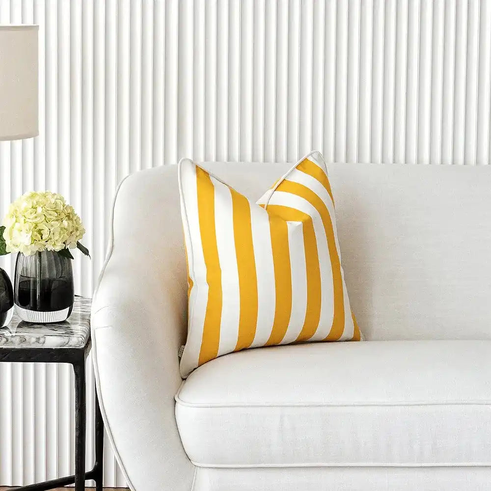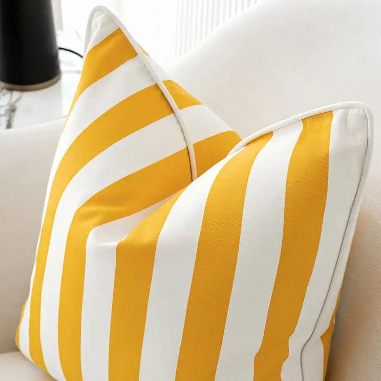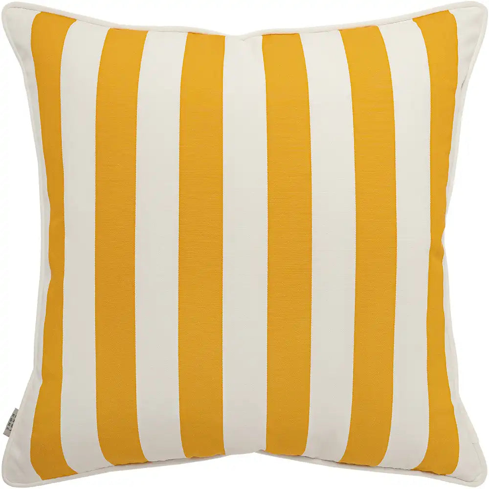 Here comes the sun: this white and golden yellow cushion will bring the sunshine to your home. Indoors or out, this joyful striped cushion is designed to raise a smile.