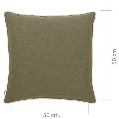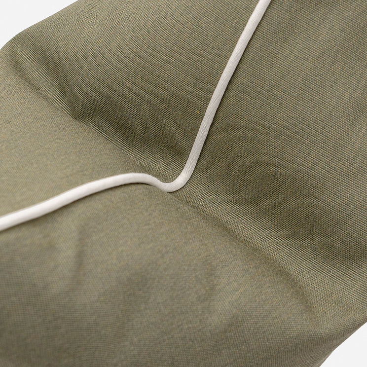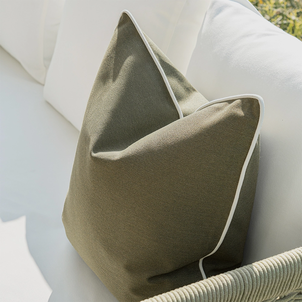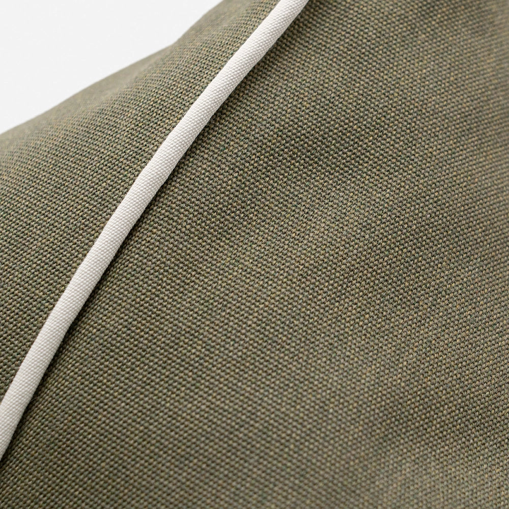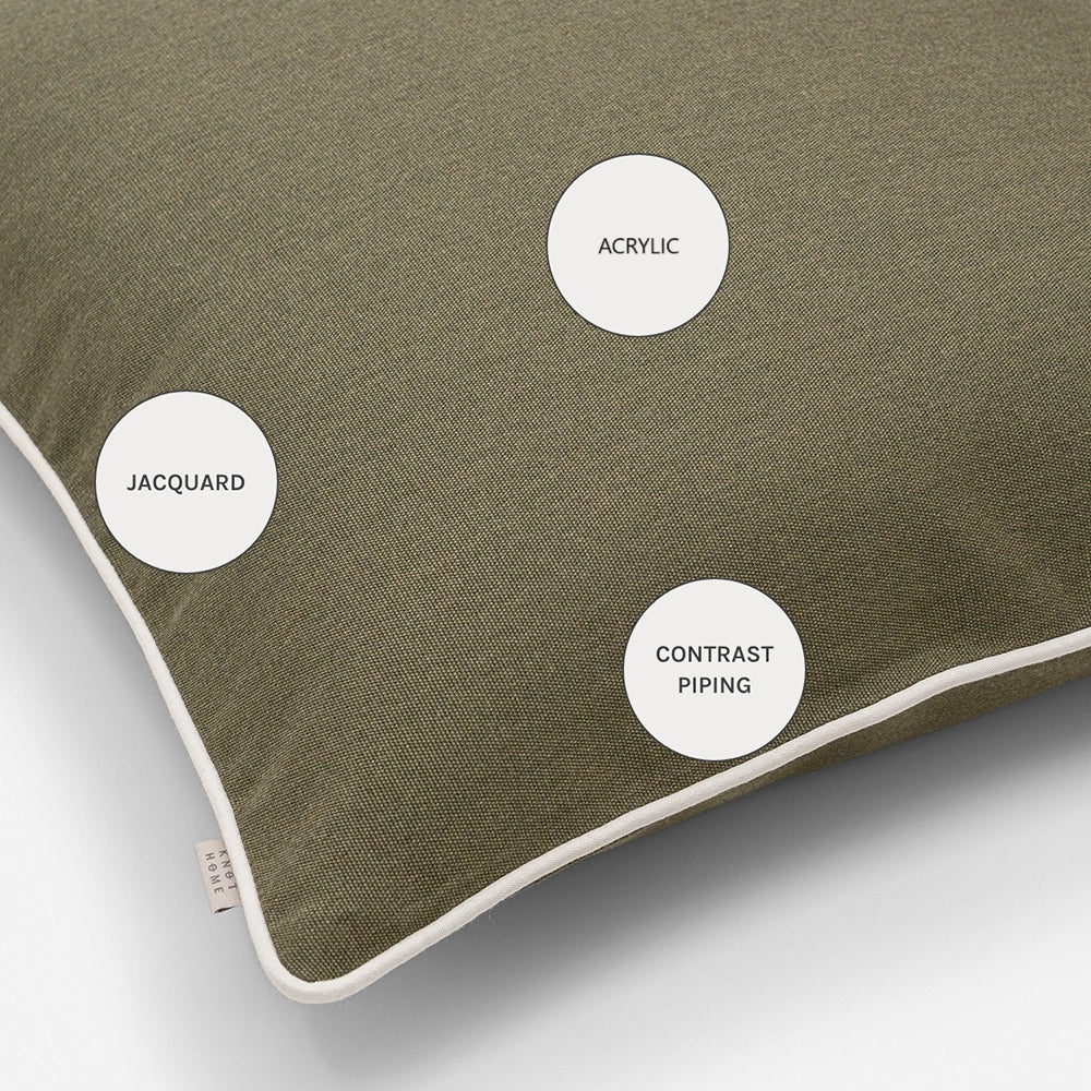 A deep olive cushion with a smooth, finely knit surface and soft contrast edging, offering a calm, grounded feel with subtle texture and quiet elegance.
