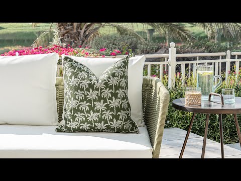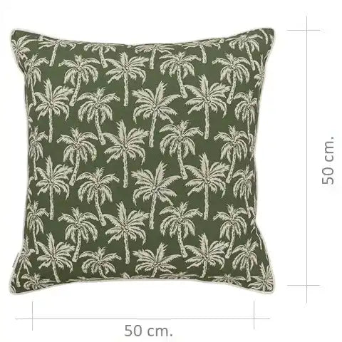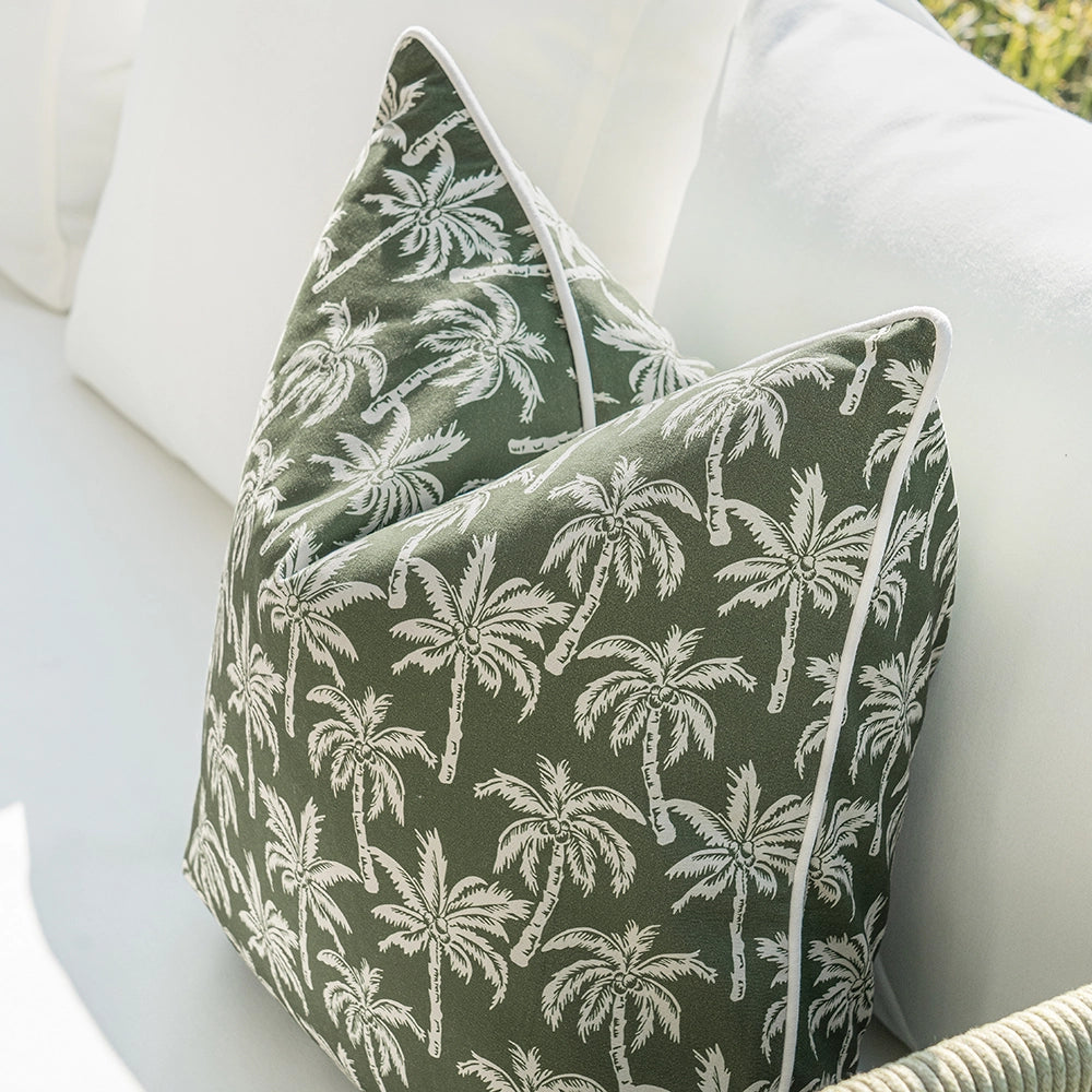 A softly textured green cushion detailed with ivory palm illustrations, bringing a relaxed, natural rhythm and an easy, sun-washed mood to the space.
