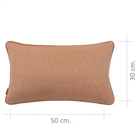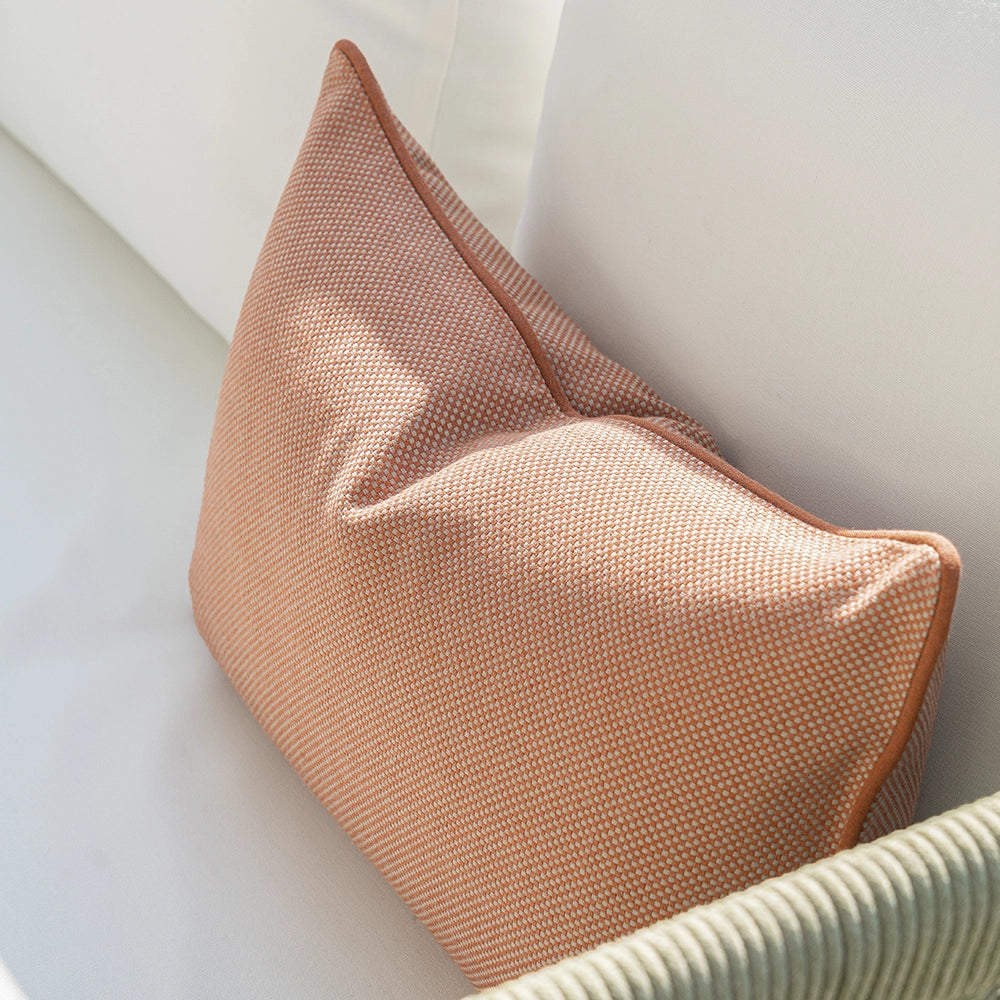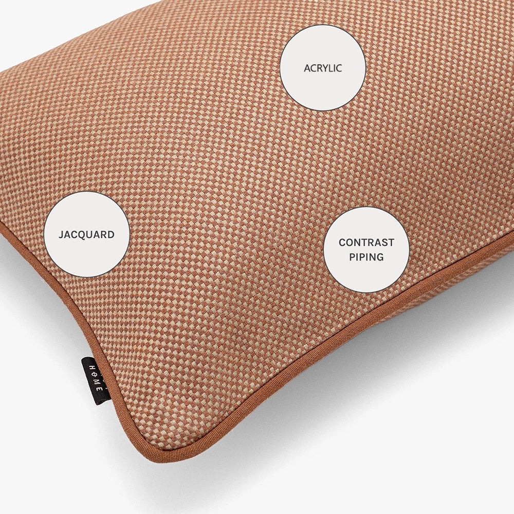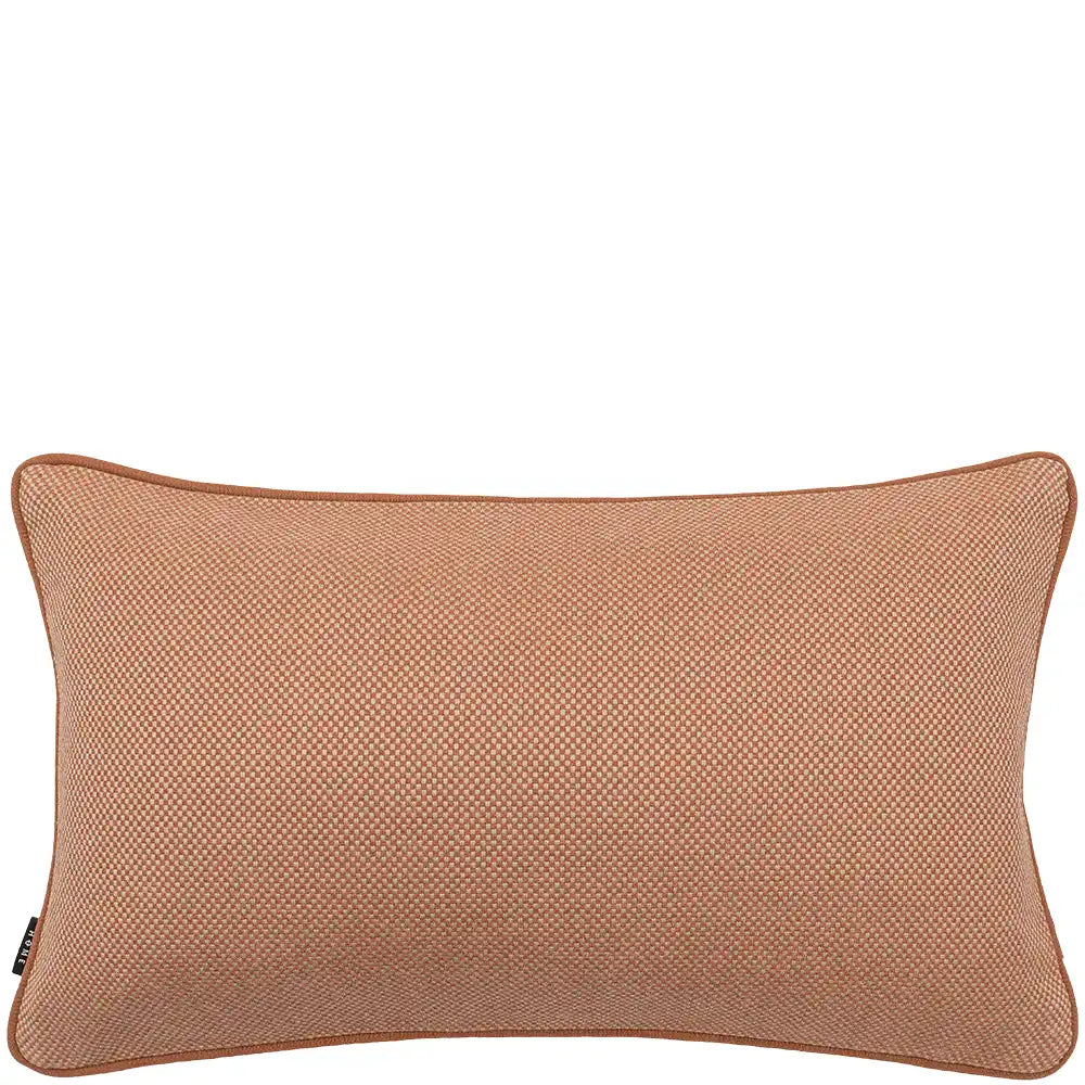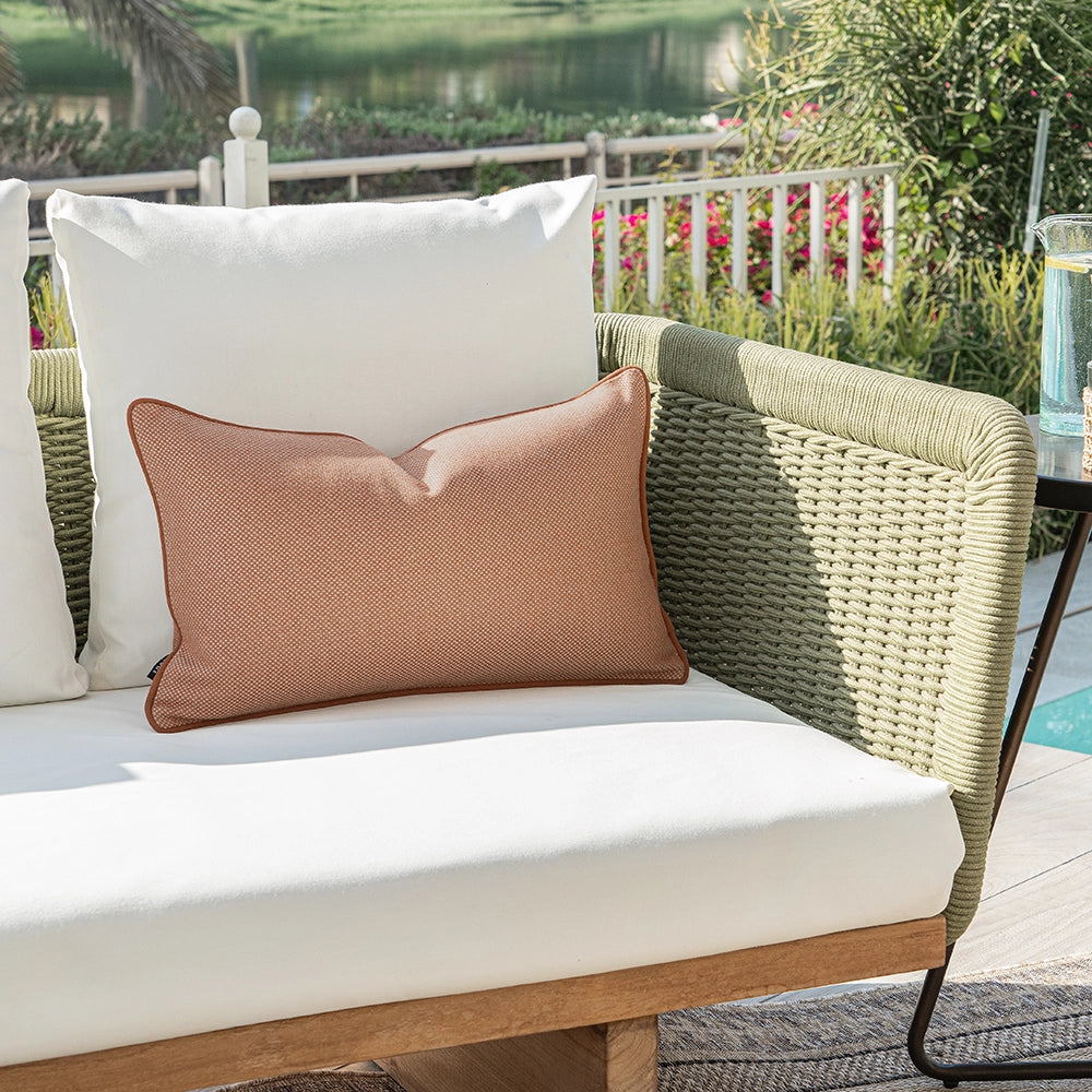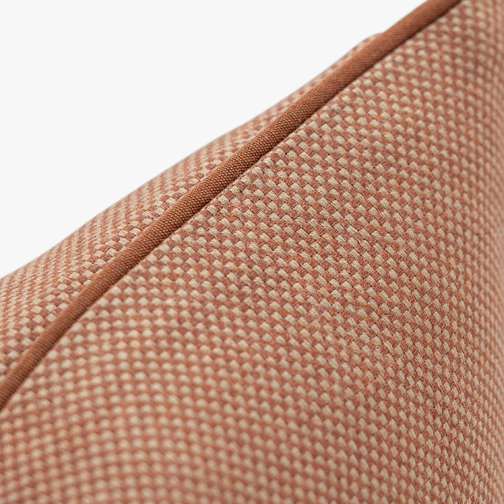 A warm rust cushion with a fine, micro-woven surface that adds gentle depth and a calm, tactile presence, bringing understated richness to the setting.