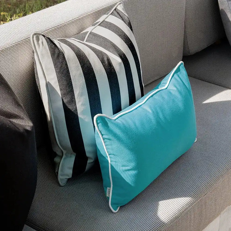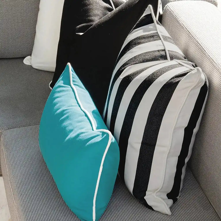 Here's a bold colour combination to wake up your décor. Showcasing contrasting black and white cushions with a dash of sky blue, this four-piece cushion set will energise your indoor and outdoor space.