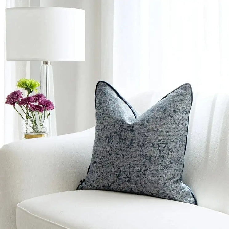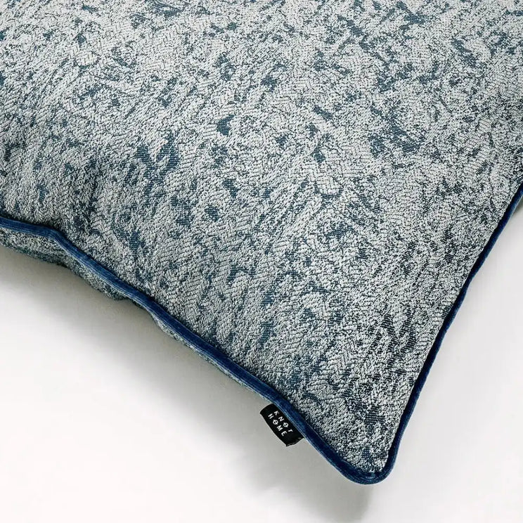 This navy blue cushion features a jacquard pattern in grey for a soft, faded effect that lets it blend in well with any colour scheme. Navy velvet piping defines the silhouette.