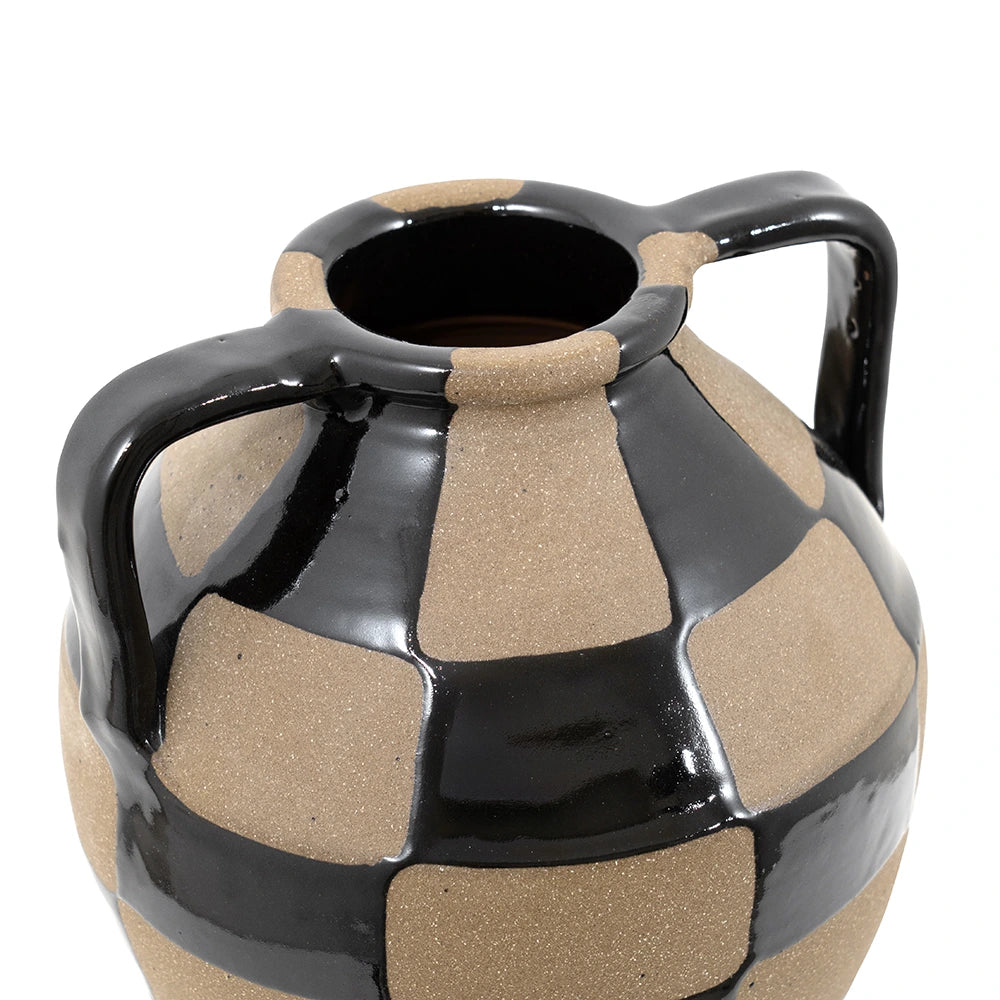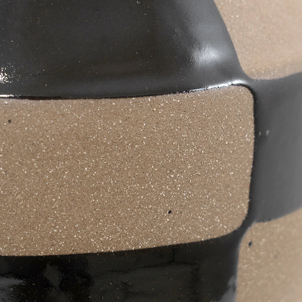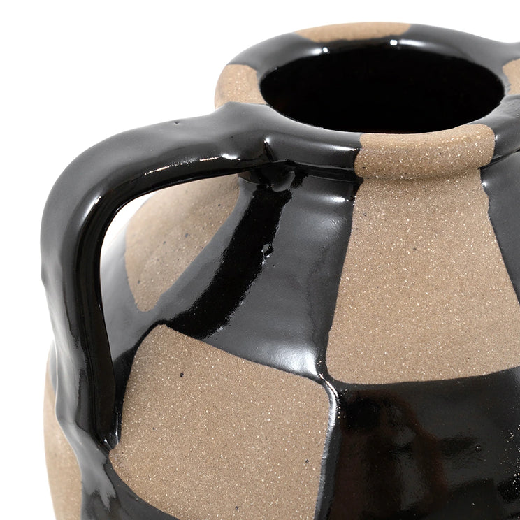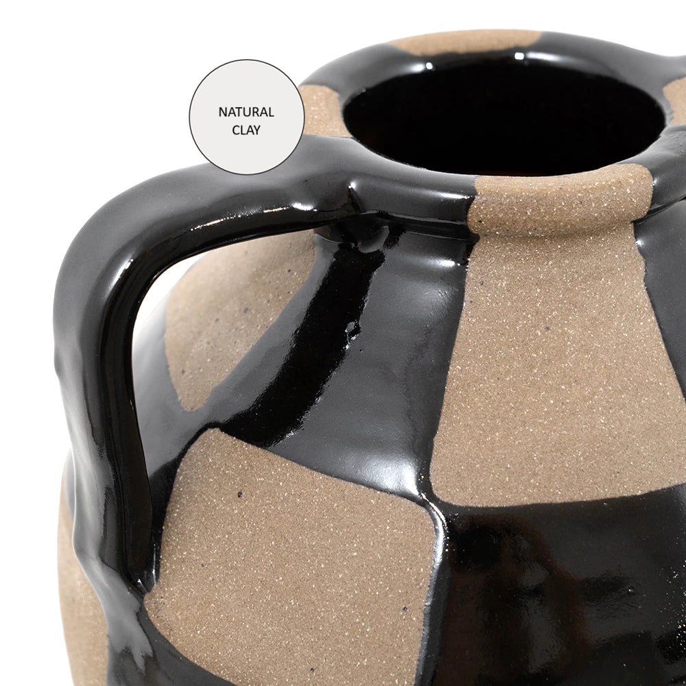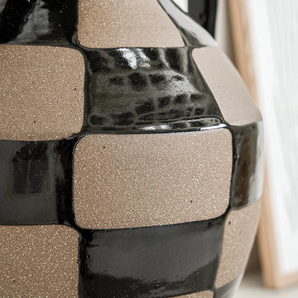 Complete your living room with this charcoal black and warm clay vase. With a traditional rounded shape, the checkered vase mixes a shiny glaze with contrast natural clay to create a beautifully balanced piece.