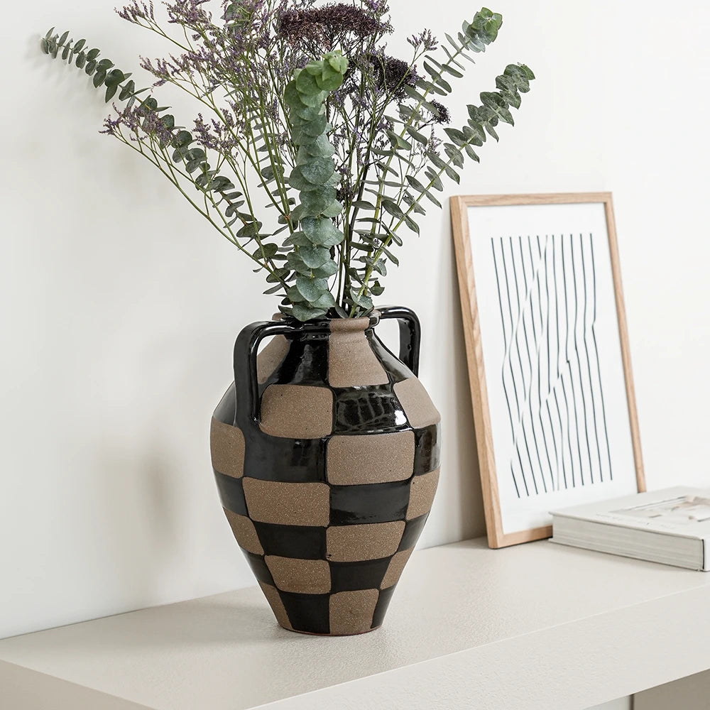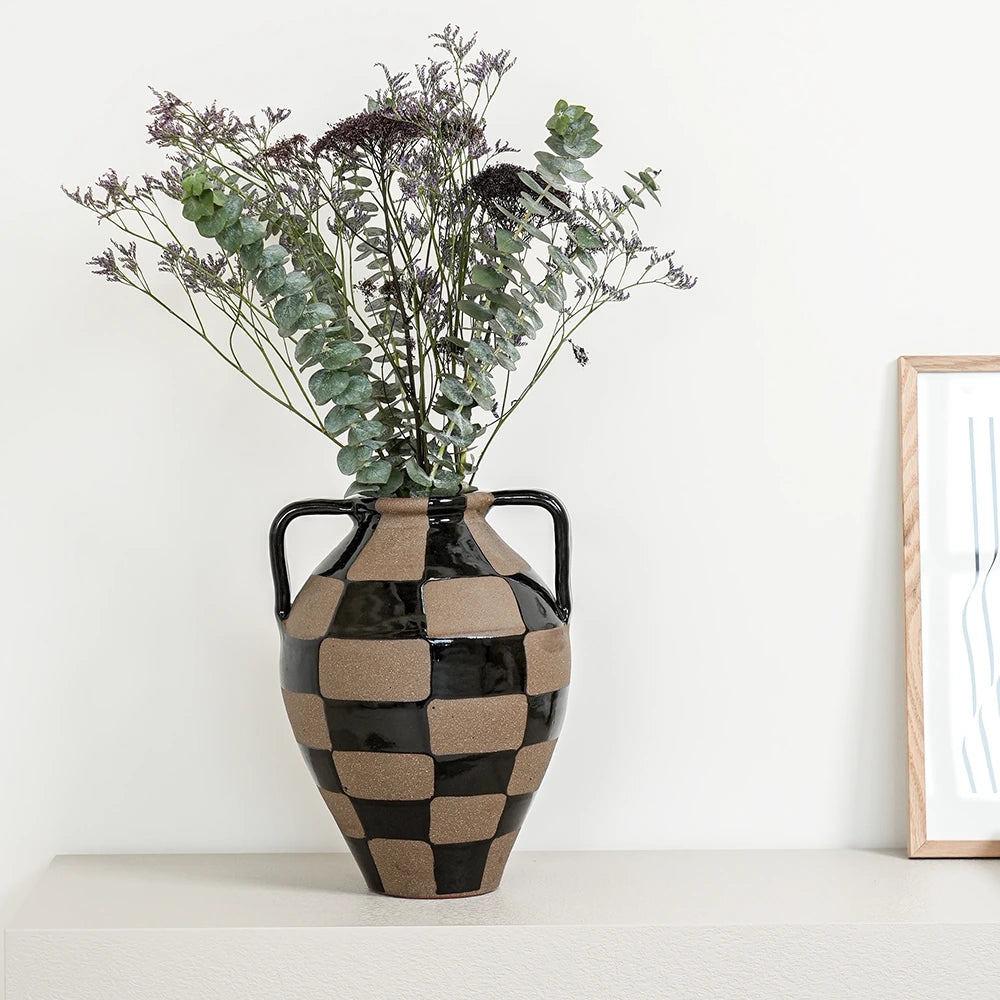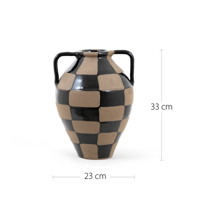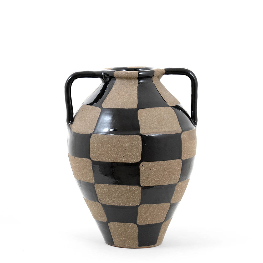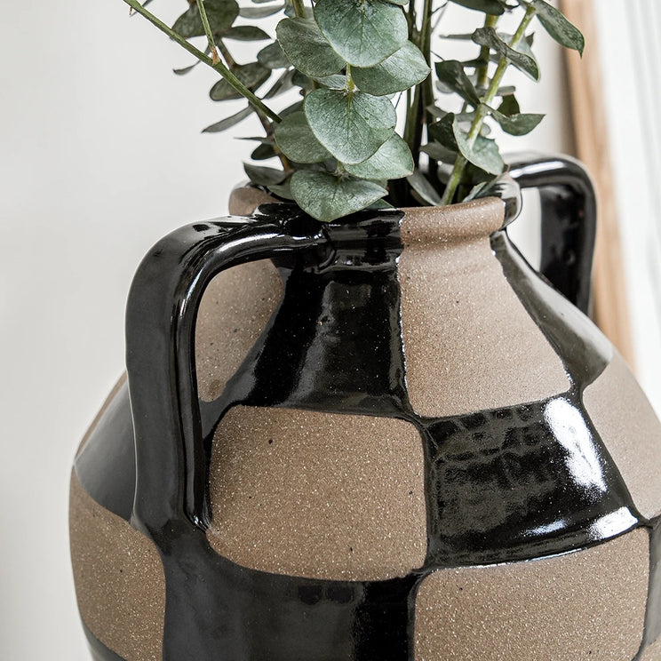 Complete your living room with this charcoal black and warm clay vase. With a traditional rounded shape, the checkered vase mixes a shiny glaze with contrast natural clay to create a beautifully balanced piece.