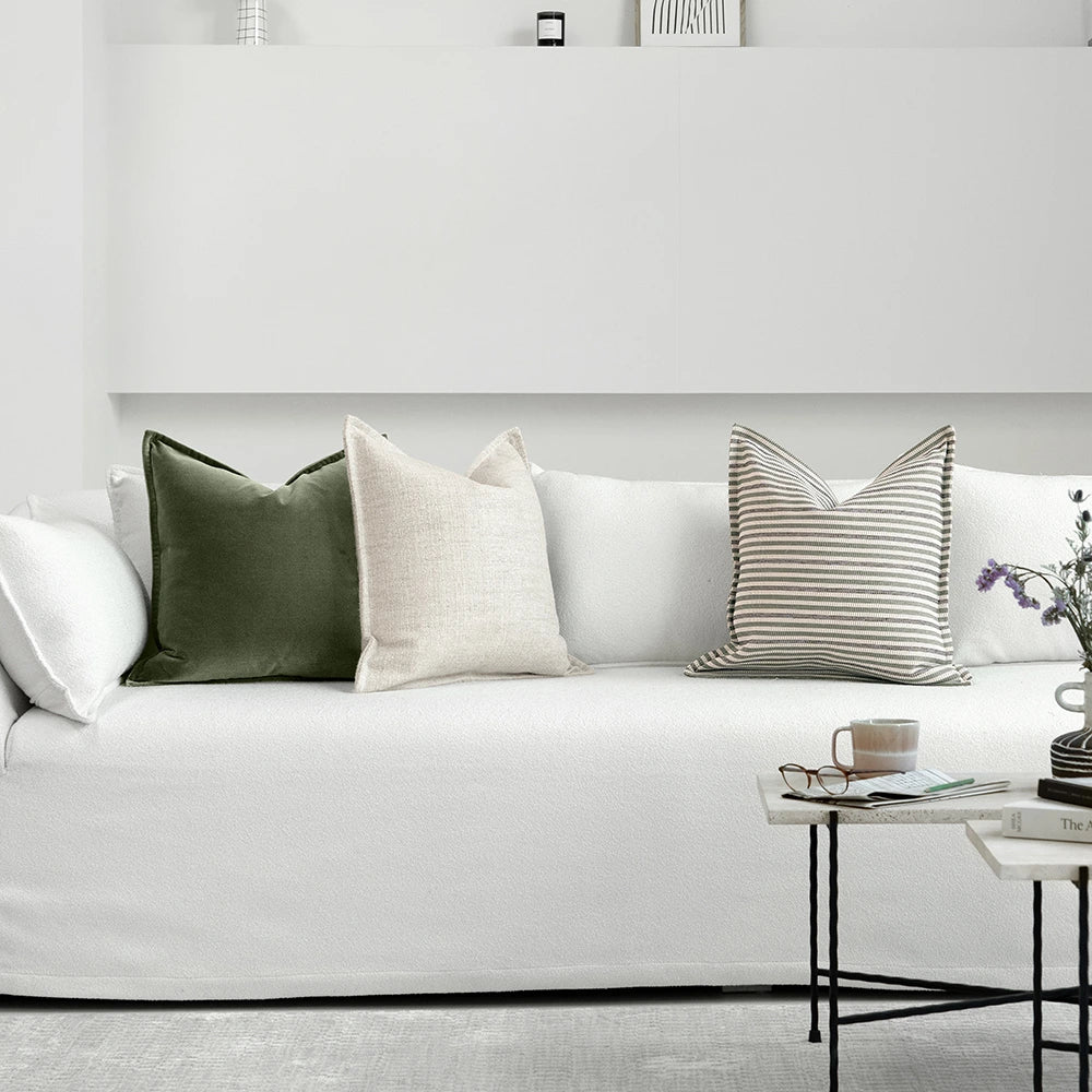 Bring a touch of nature to your home with this soft off-white and green cushion set. Featuring one velvet, one plain and one striped cushion, it's a fresh seasonal update for your sofa.