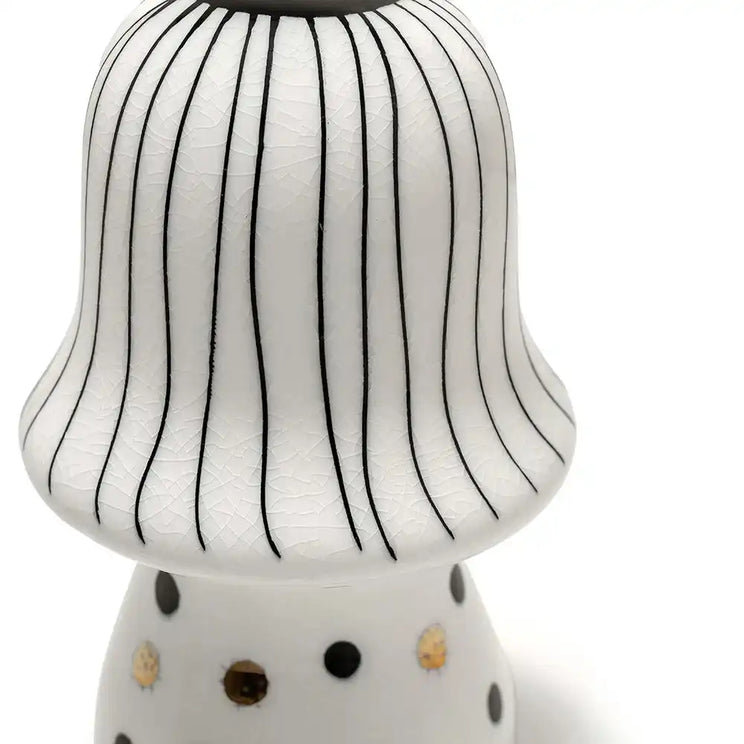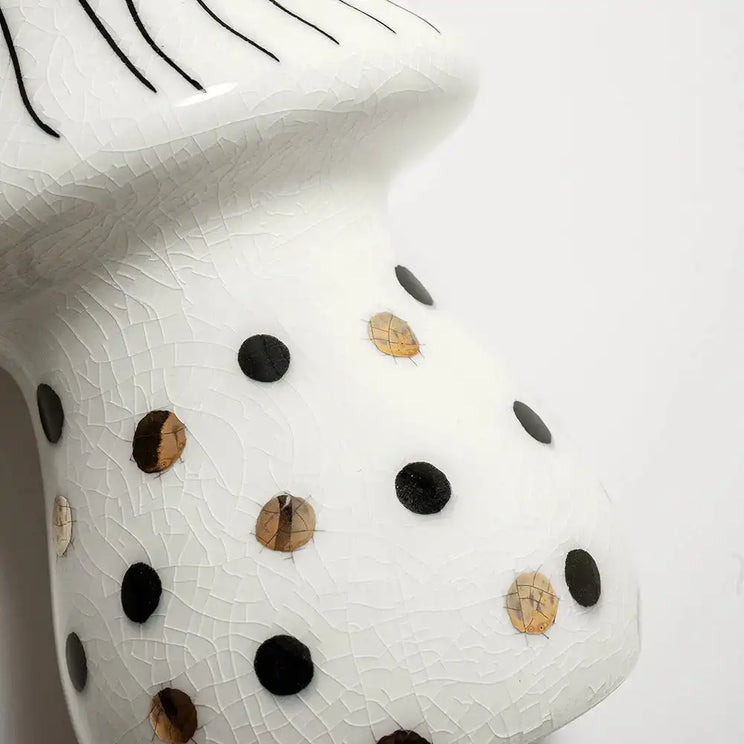 These ceramic figures will add a fairytale quality to your decor. Both mushrooms feature black wavy lines to highlight the curving silhouette, and black and gold dots for a sparkling finishing touch.