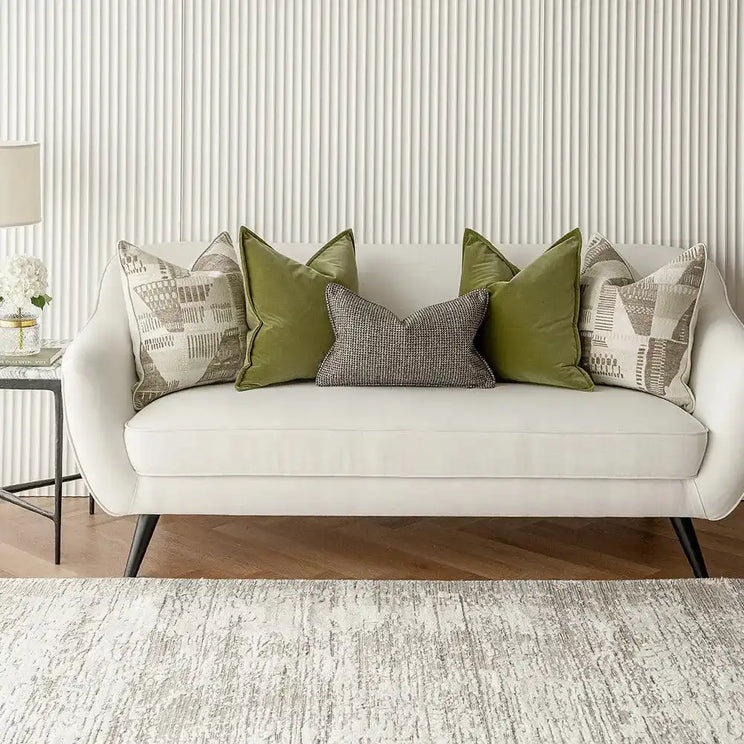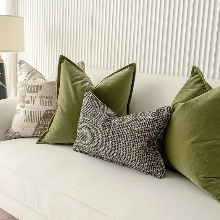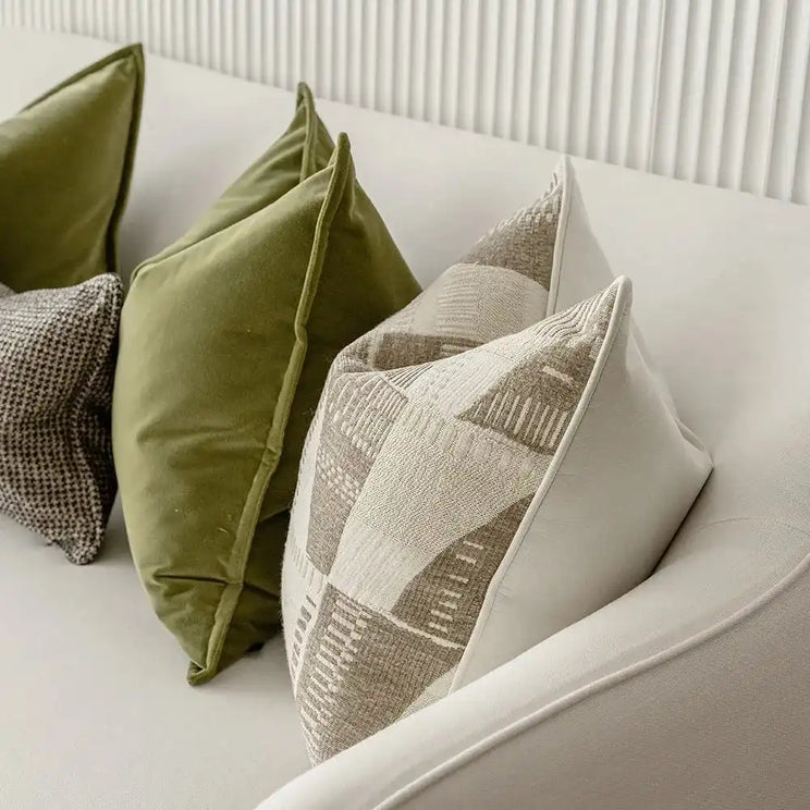 Design: Two green velvet cushions, two abstract boho cushions with PU back, and a checked accent cushion